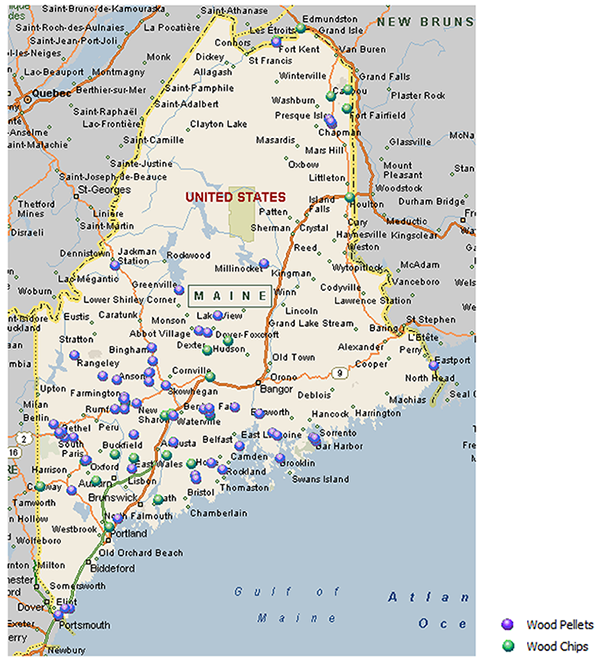 Locations of commercial/institutional facilities in Maine using Modern Wood Heat (wood chips or pellets)