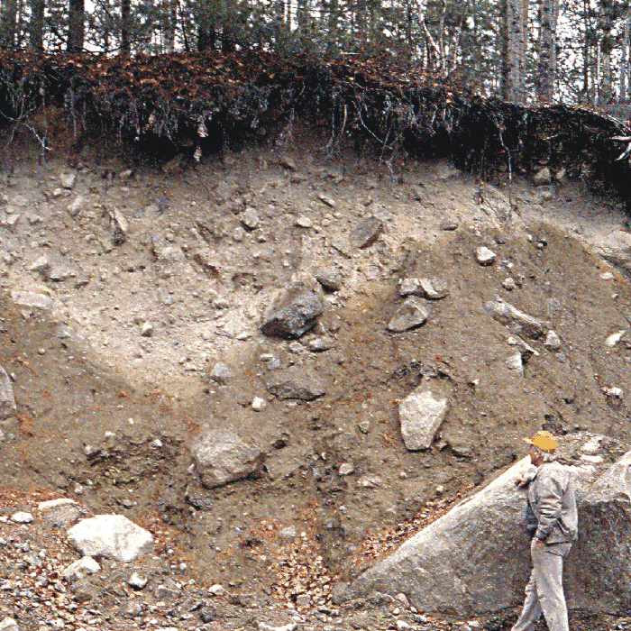 Figure 2. Till: Borrow pit near Millinocket, exposing sandy, bouldery till. This stony till commonly occurs in areas of granitic bedrock.