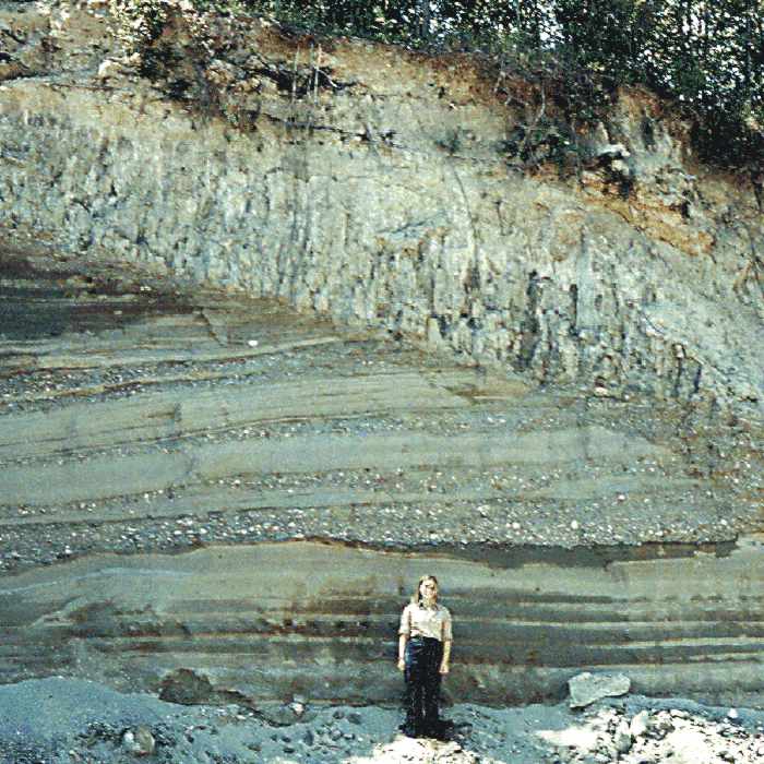 Figure 10. Gravel over sand over gravel: Close-up of pit face showing intertidal(?) sand unit between pebble-cobble gravel beds in upper part of glaciomarine delta, Columbia Falls.