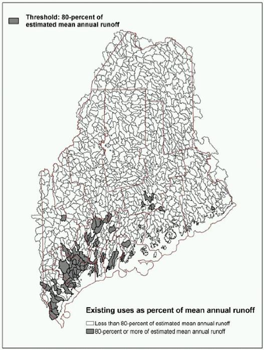 Figure 1. Existing uses as percent of mean annual runoff. Watersheds with ratio of 80-percent or more shown in gray. (256 kb PDF version)
