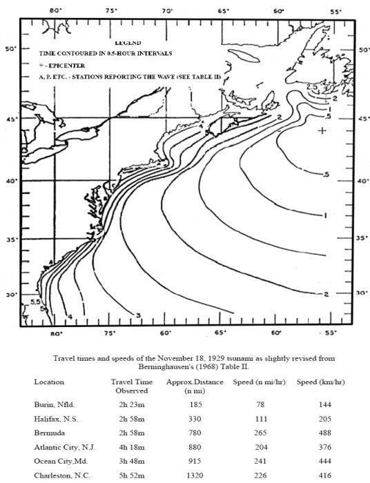 The tsunami was registered as far south as South Carolina, and as far east as Portugal. An image and table showing travel times and speeds for the tsunami as it moved down the east coast of the United States are shown in Figure 9.