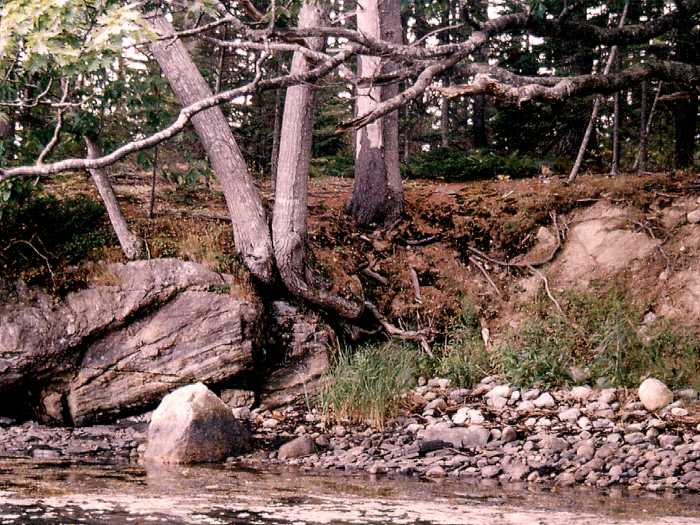 Figure 4. Coastal bluffs maps are regional maps, and as a result, some shores mapped as stable may contain small areas that are unstable. A bluff, too small to appear on the map, is shown in the photo. This bluff exhibits the characteristics of an unstable bluff: curved tree trunks, exposed roots, and bare ground on a steep slope. It is an area to be concerned about on a local scale. However, this degree of detail is not shown on the coastal bluff map.