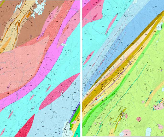 Figure 10. Adjacent sections of the Washington (left) and Searsmont (right) 7.5-minute bedrock geology maps. The Washington quadrangle was published in 2004 and the Searsmont quad is still in preparation. Note that the colors do not match exactly along the quadrangle border. Such a mismatch is known as a "border fault" and indicates a difference in interpretation of the bedrock data in each quadrangle. More field work would need to be done in the area between the quads to solve this sort of problem and create a "seamless" match.