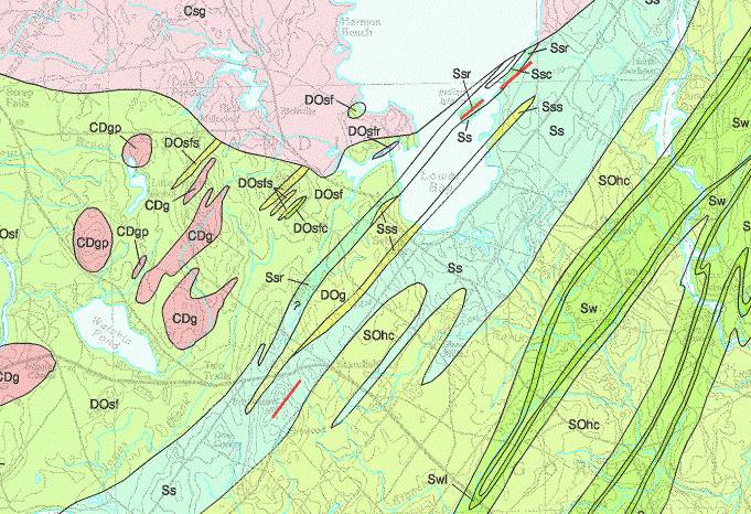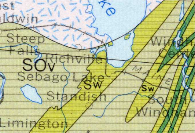 Figure 1a. Section of a 1:100,000 scale bedrock map of the area near Sebago Lake. Note the many small plutons to the southwest of the lake. Also note the width and shape of the small ribbon units in the eastern portion of the image. The contacts on this map have been generalized on the 1:500,000 scale bedrock map shown in Figure 1b.