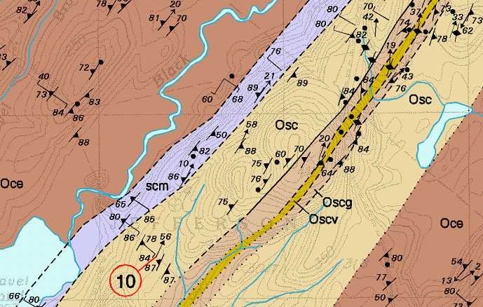 Figure 4. A portion of the Weeks Mills bedrock geology map. First note the pattern of symbols shown on the map. Each symbol shows the location of a measurement taken at a bedrock outcrop. Where there are more symbols, the contacts are more accurate. Note also the solid, dashed, and dotted contacts. Solid lines represent known contacts constrained by multiple outcrops, dashed lines represent approximate contacts determined by fewer measurements, and dotted lines represent inferred contacts where there are no outcrops.