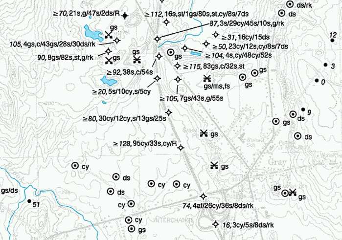 Figure 6. A portion of the surficial materials map of the Gray quadrangle. Subsurface records from observation wells and test borings provide the most detailed information shown on the materials maps. These records are shown as lengthy strings of letters in the figure (refer to reading well logs for more information). At the other extreme, observations at shovel or hand-auger holes only show the type of material at a shallow depth from the land surface. Auger holes are shown by a dot in a circle in the figure, and the material is shown by an abbreviation -- cy for clay for instance. Deposits which may occur under this surface layer are not known. The map user should be aware of this distinction when interpreting the data shown on the map.