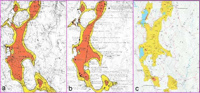 Figure 8. Change in interpretation of aquifer boundaries over time. a. 1979 sand and gravel aquifers map (scale 1:50,000). b. 1985 significant aquifers map (scale 1:50,000). c. Current edition of significant aquifers map, published in 1999 (scale 1:24,000). Note how the interpretation of aquifer boundaries has changed as more data was collected. Note especially how the high-yield (red) areas have shrunk, representing a more conservative estimate of the potential yield of the aquifer. For a more detailed discussion, read Sand and gravel aquifer maps - A work in progress.