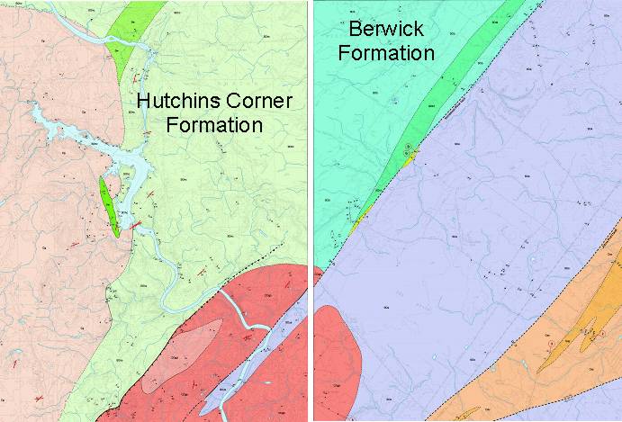 Figure 9. Adjacent sections of the Bar Mills (left) and Old Orchard Beach (right) 7.5-minute bedrock geology maps. The Bar Mills map was published in 1995 and the Old Orchard Beach map in 2003. Note that the rocks identified as the Hutchins Corner Formation on the Bar Mills map are now identified as the Berwick Formation on the Old Orchard Beach quadrangle. The rocks themselves have not changed. However, changing views of regional stratigraphy have caused the rocks to be renamed the Berwick Formation. If the Bar Mills quadrangle was remapped today, the rocks labeled as Hutchins Corner Formation would be named Berwick Formation.