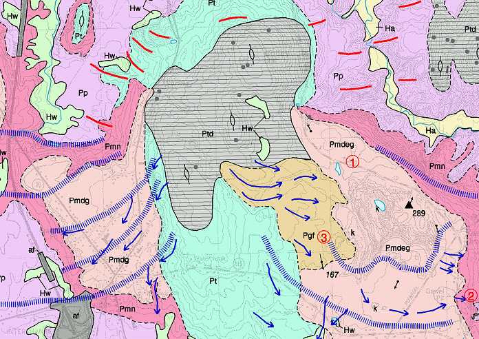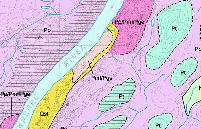 Figure 3. Portion of surficial geology map of the Togus Pond 7.5-minute quadrangle. Two "sandwich" symbols are shown. Pp/Pmf/Pge - should be read as Presumpscot Formation over marine fan deposits over esker deposits. Pmf/Pge - read as marine fan deposits over esker deposits. These labels indicate subsurface geology.