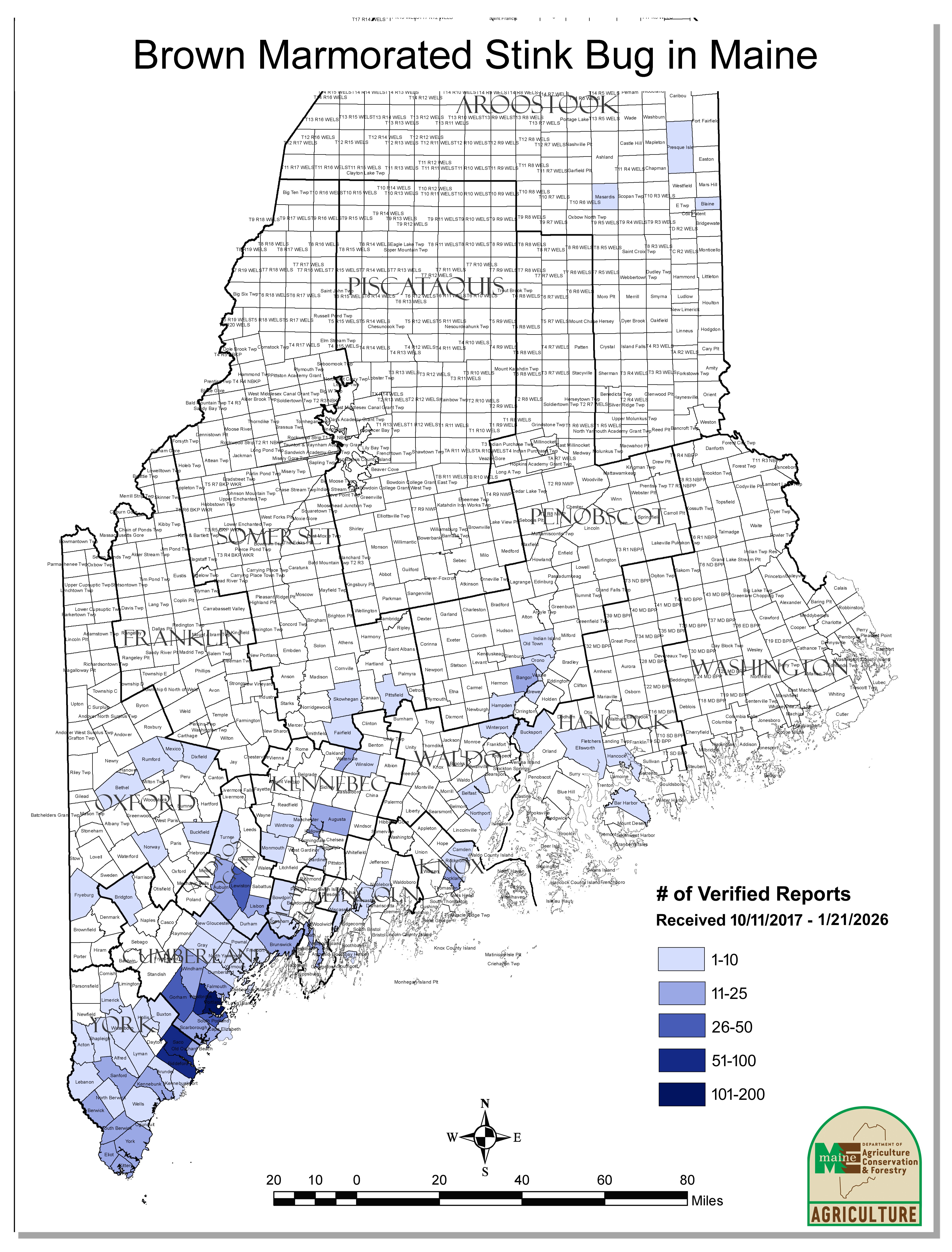 Reports of BMSB overwintering in Maine structures have been verified from 90 towns in 13 counties. Reports of overwintering populations help experts predict and prepare for subsequent potential crop damage.