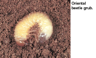Oriental beetle grubs cause considerable damage to turf grasses and nursery plants. They eat and destroy the roots of the grass and are found in nursery stock, strawberry beds and some outside potted plants.