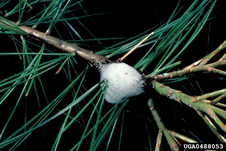 There are many species of spittlebugs that feed on conifers and broad-leaved ornamentals. Most are unsightly but do little damage to the plants. Two species, the pine spittlebug and the Saratoga spittlebug, are considered serious pests in Maine. Heavy infestations cause flagging branches, dead terminal growth, and stunted and distorted stems and branches, and will kill trees in two to three years.