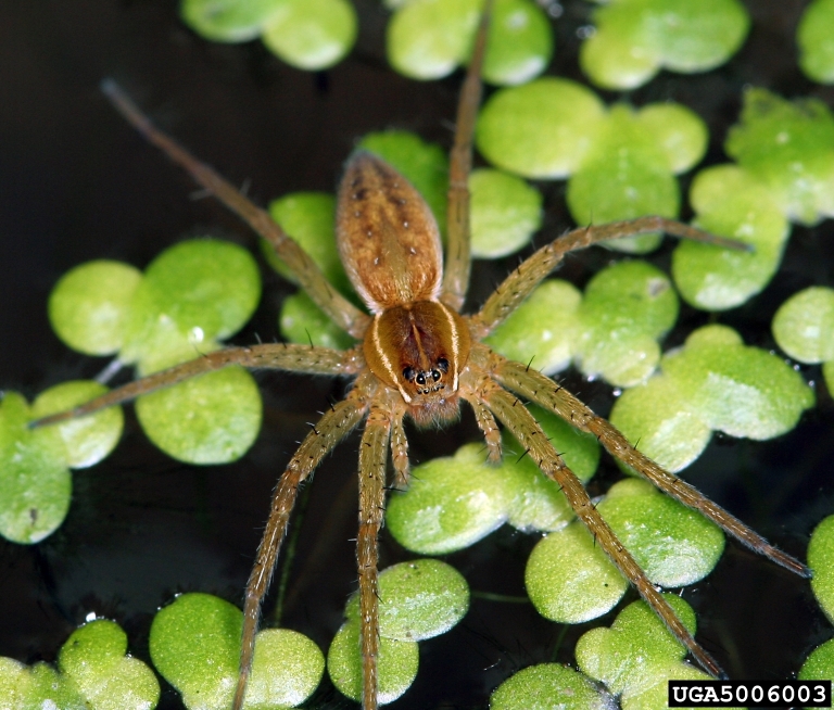 Fisher spiders (Family Pisauridae) are also known as fishing spiders or water spiders. They are amphibious and are typically found in moist areas, especially along the edges of streams and lakes. They have the ability to skate across the surface of the water and will even dive beneath the surface to feed on small fish, tadpoles and aquatic insects.