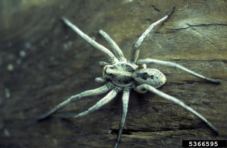 Wolf spiders (Family Lycosidae) hunt at night and are often seen under lights. They run over the ground or on plants in search of prey and pounce upon their victims with vigor and power. They are large, usually brown and black, and may have longitudinal stripes. They frequently enter homes and backyards but pose no danger to people.