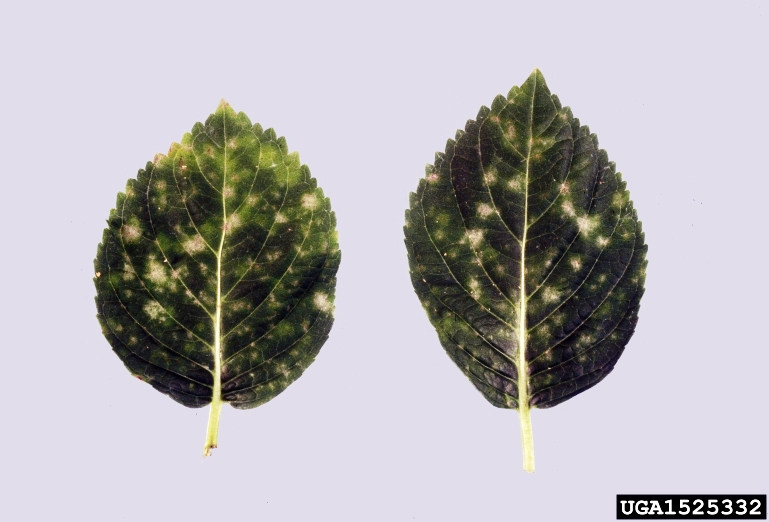 Powdery mildews are caused by a variety of fungi, each specific to a host plant. It is recognizable by the patches of white fungal growth on the upper leaf surface. Commonly infected woody ornamentals include lilac, flowering dogwood, azalea, rose, and hydrangea. Flowering plants commonly infected include phlox, bee-balm, aster, yarrow, coreopsis, rudbeckia, begonia, chrysanthemum, dahlia, delphinium, snapdragon and zinnia. Since different fungi infect specific plants, it is not possible to spread from one species to another, for example, powdery mildew on phlox will not affect lilac.