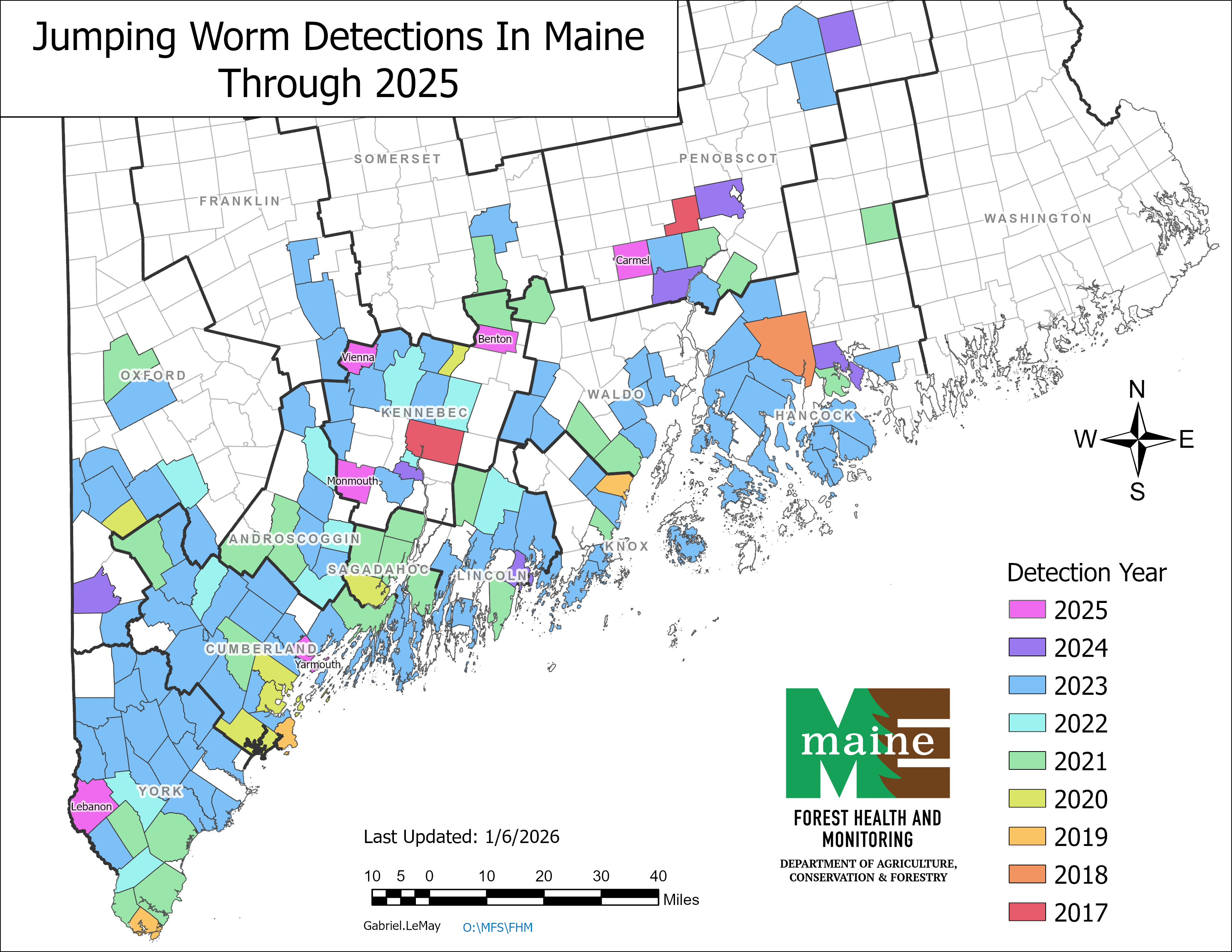 Amynthas worms are native to Korea and Japan, and are now found in the United States from Maine to South Carolina and west to Wisconsin. Amynthas worms were first collected from a Maine greenhouse in 1952, though an established population of this active and damaging pest was not discovered here until about 2014 when two populations were discovered in Augusta (one at the Viles Arboretum) and two populations were found in Portland. They have also been found in a rhododendron display at the Coastal Maine Botanical Gardens in Boothbay. Amynthas are now considered to be widespread and found in 13 of the 16 counties.