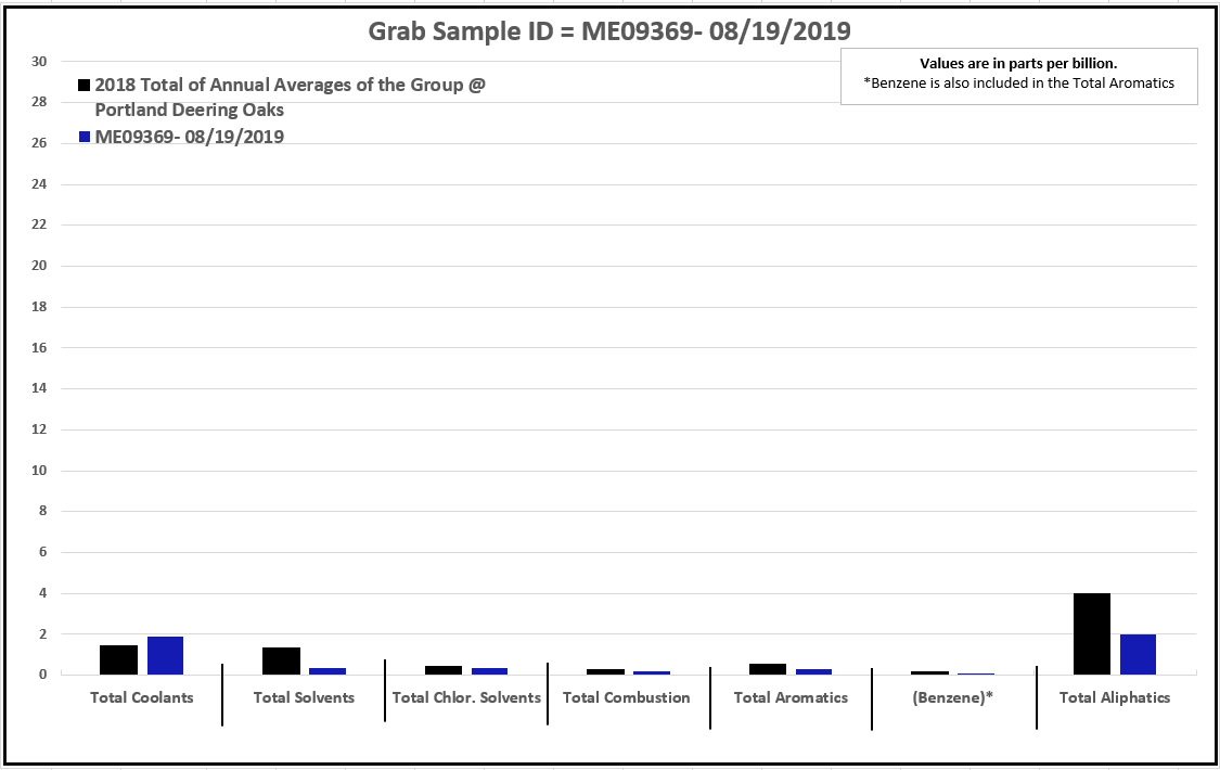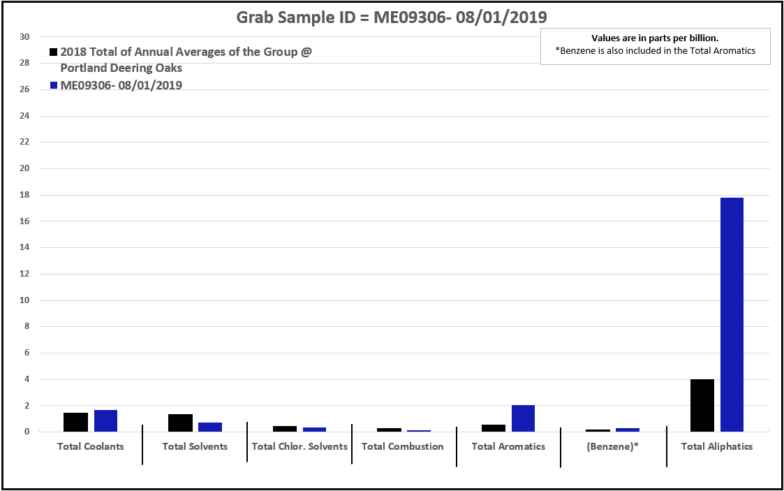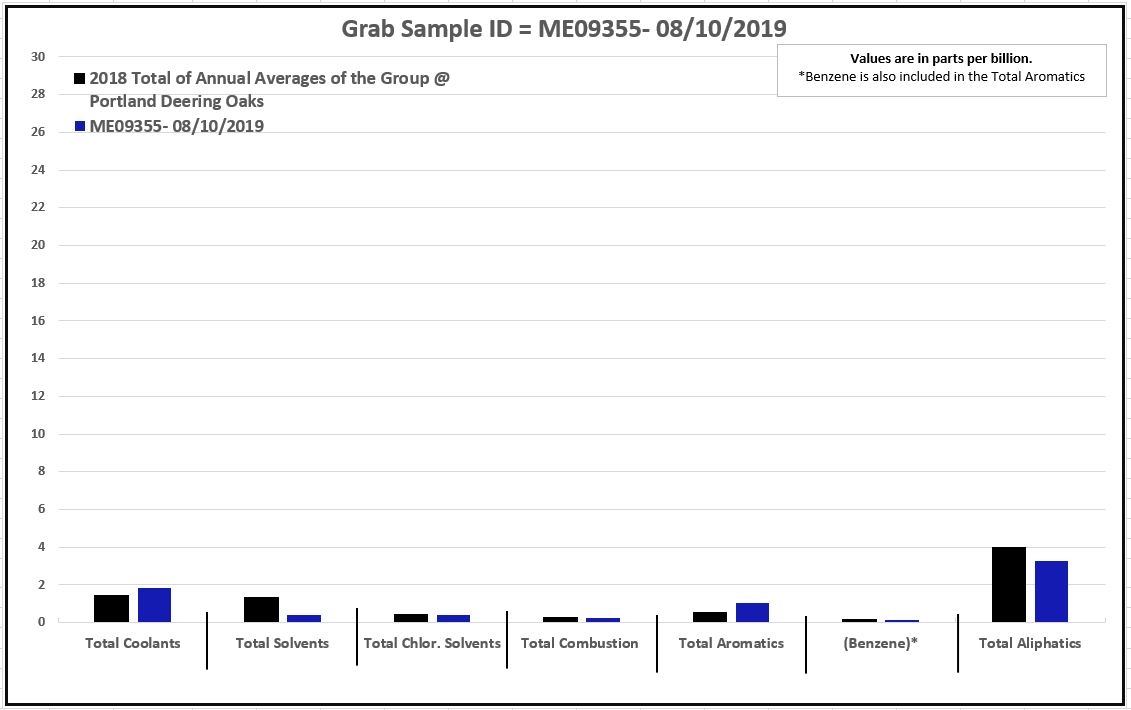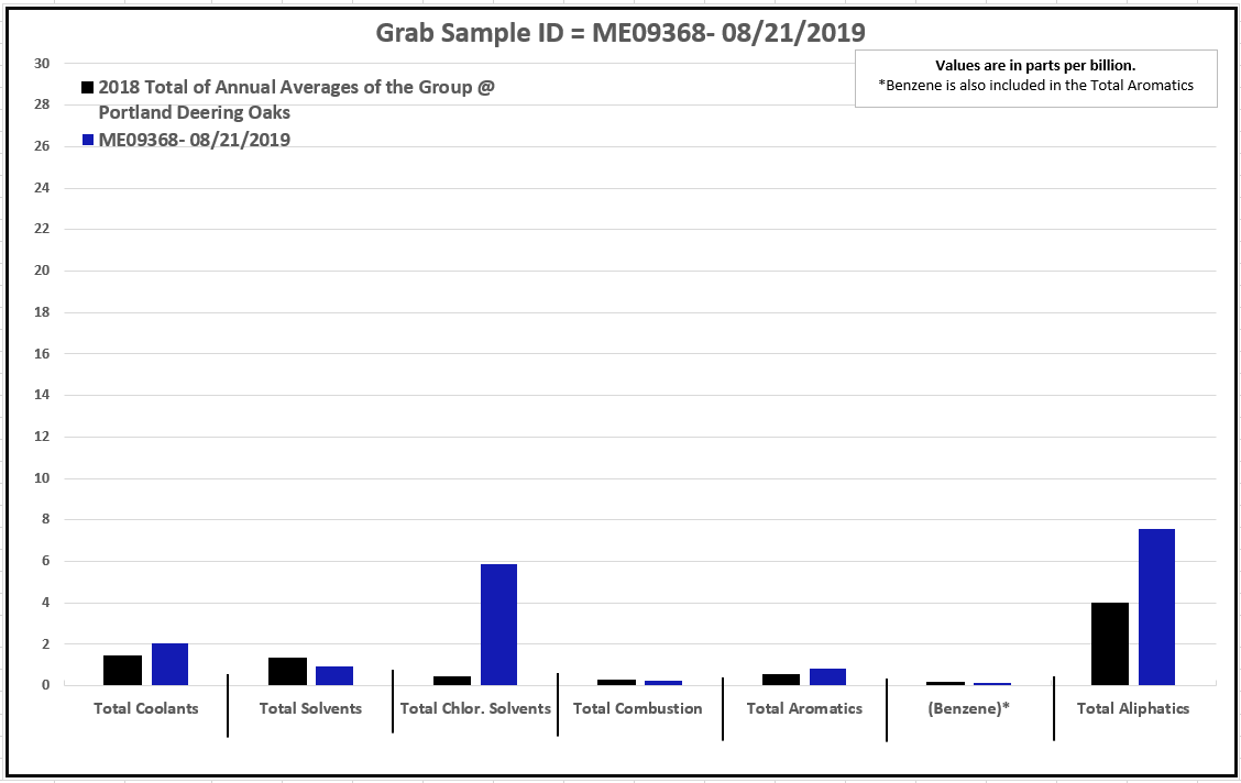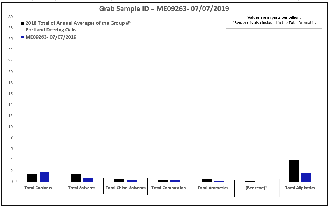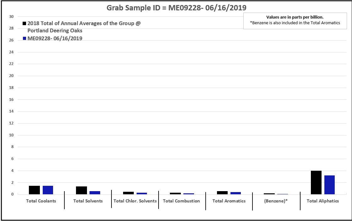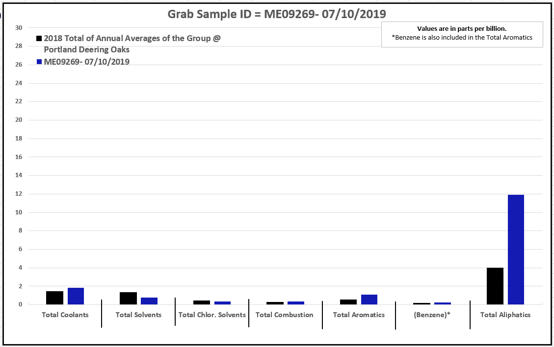 CAUTION to grab sampling data users: It is not appropriate to use grab sample data for any comparison to longer term average (e.g. annual) levels, guidelines or standards for health assessment purposes. Staff from the Maine Center for Disease Control (CDC) gave a presentation (PDF) to the South Portland City Council on November 26, 2019 that describes and illustrates their approach to interpreting this data from a health perspective. The grab sample data charts we’ve created here are intended to simply be a visualization of each sample’s results from an air quality perspective, comparing them to the 2018 annual averages from our Portland Deering Oaks site, which for this purpose are being used as reference or background concentrations for the area.
