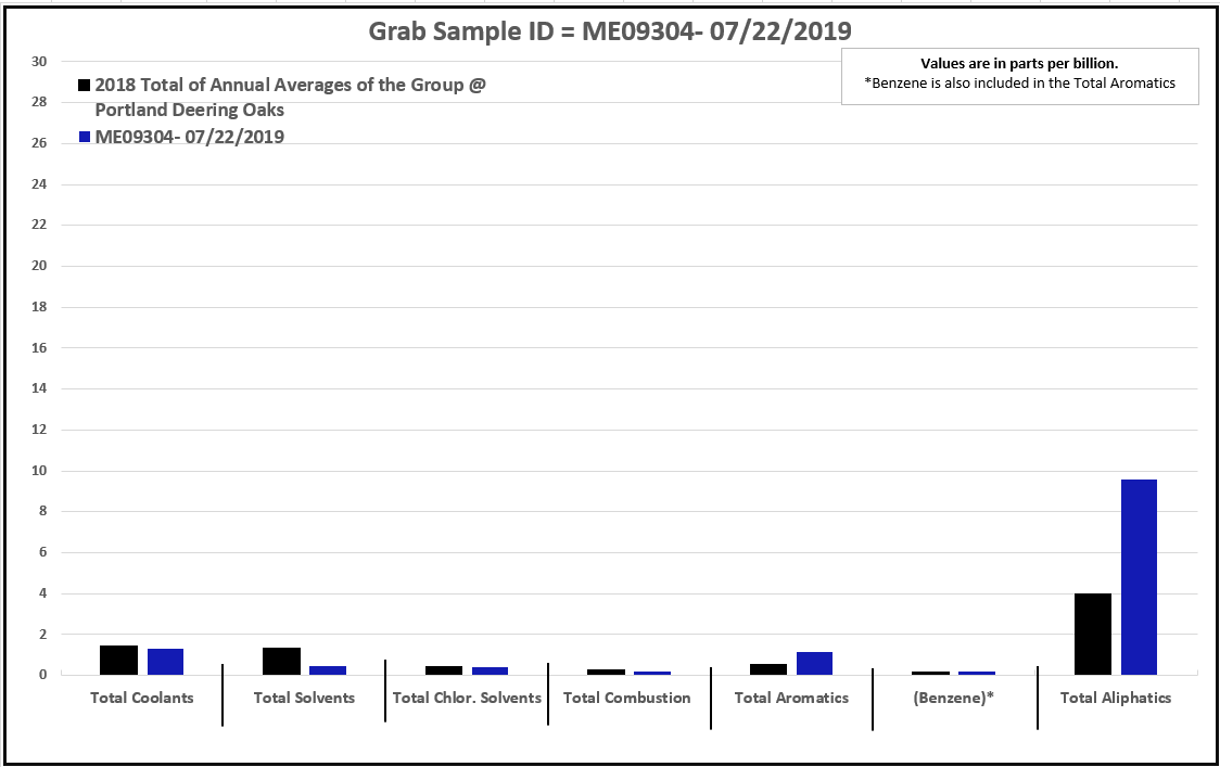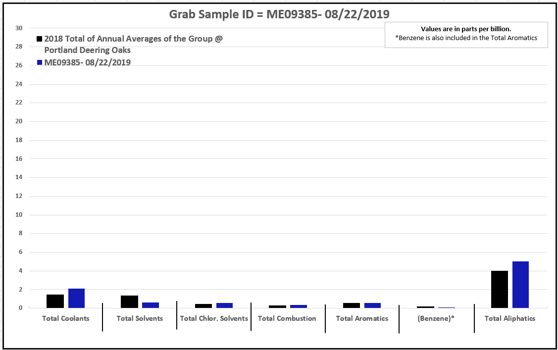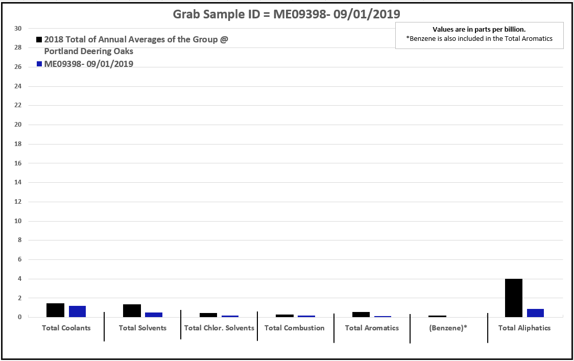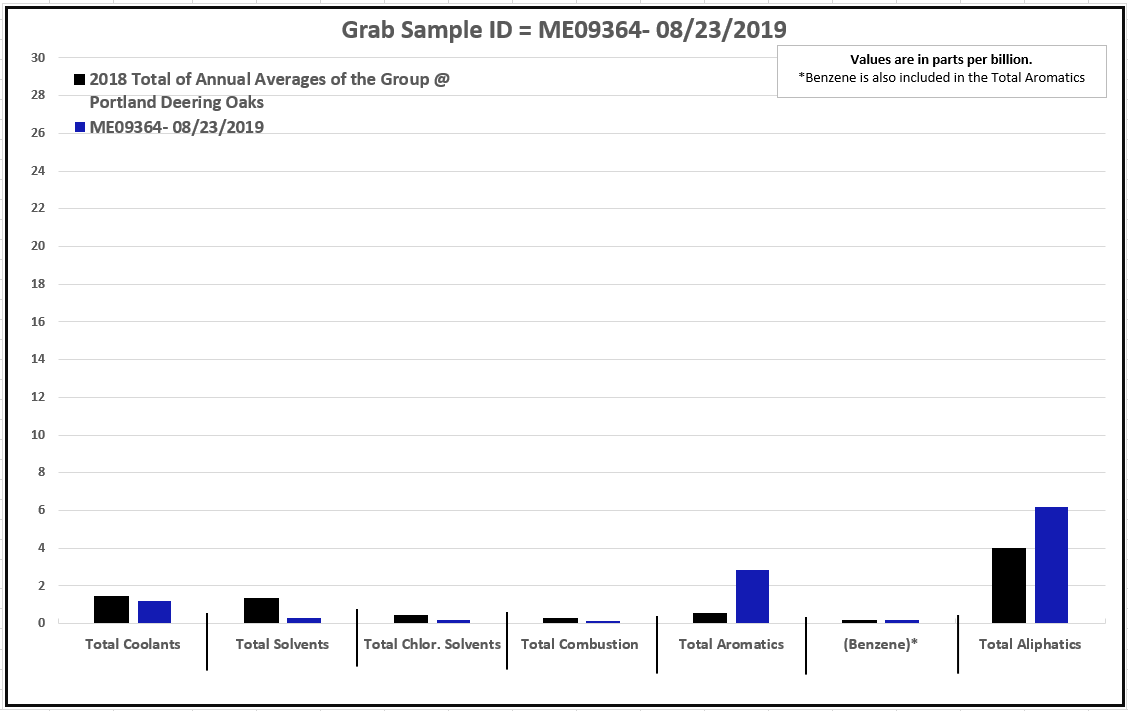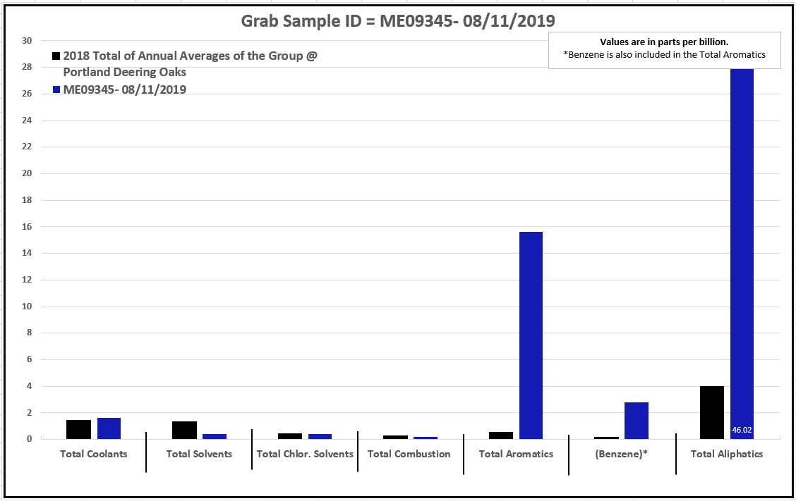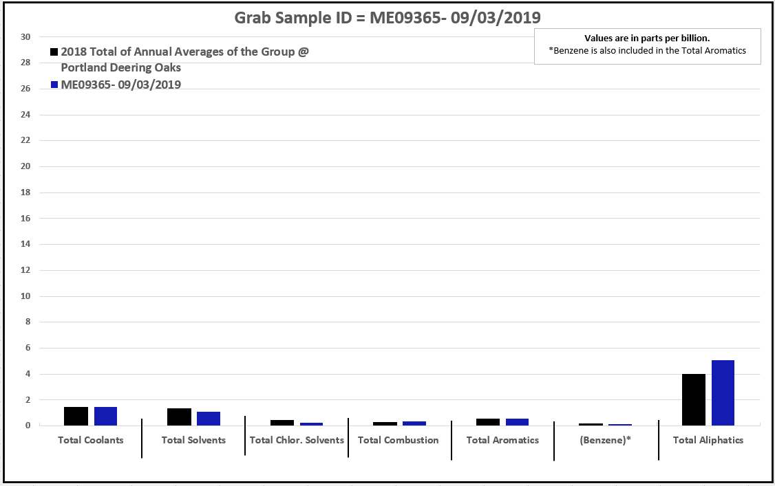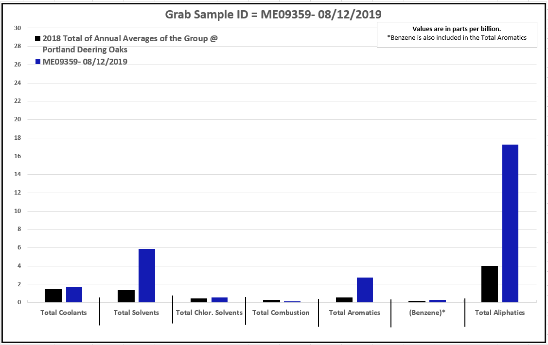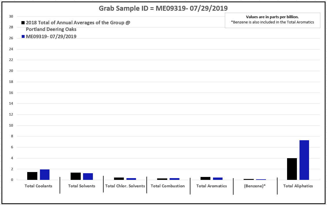 CAUTION to grab sampling data users: It is not appropriate to use grab sample data for any comparison to longer term average (e.g. annual) levels, guidelines or standards for health assessment purposes. Staff from the Maine Center for Disease Control (CDC) gave a presentation (PDF) to the South Portland City Council on November 26, 2019 that describes and illustrates their approach to interpreting this data from a health perspective. The grab sample data charts we’ve created here are intended to simply be a visualization of each sample’s results from an air quality perspective, comparing them to the 2018 annual averages from our Portland Deering Oaks site, which for this purpose are being used as reference or background concentrations for the area.