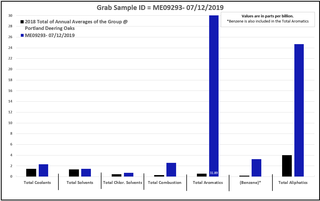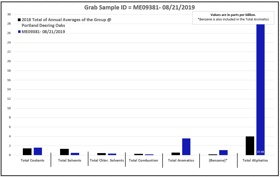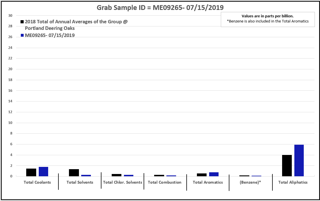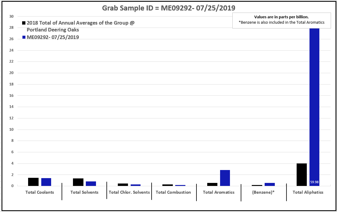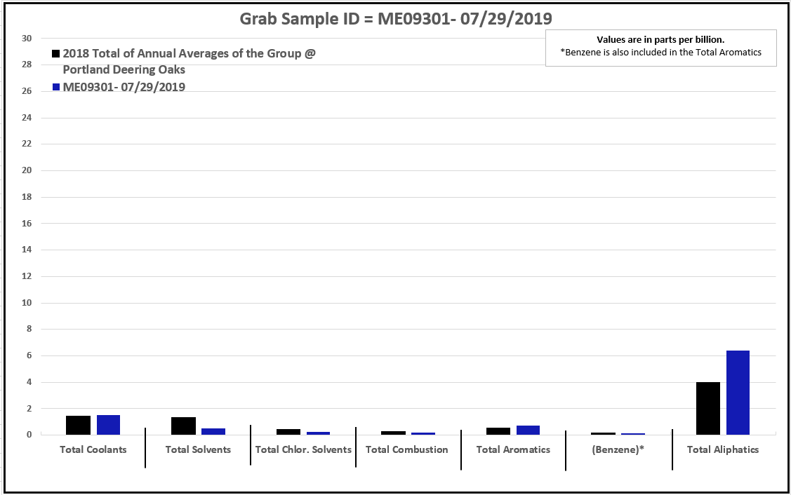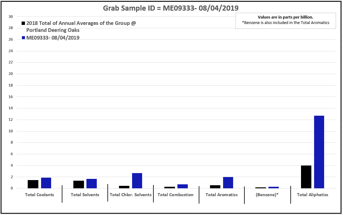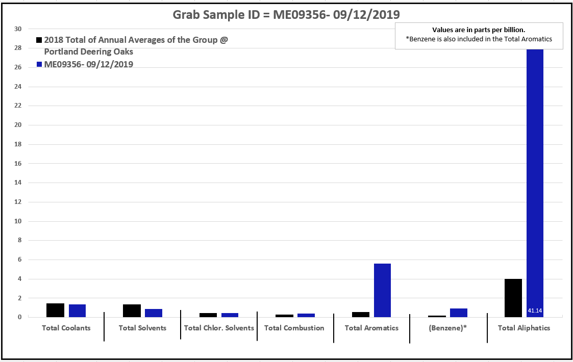 CAUTION to grab sampling data users: It is not appropriate to use grab sample data for any comparison to longer term average (e.g. annual) levels, guidelines or standards for health assessment purposes. Staff from the Maine Center for Disease Control (CDC) gave a presentation (PDF) to the South Portland City Council on November 26, 2019 that describes and illustrates their approach to interpreting this data from a health perspective. The grab sample data charts we’ve created here are intended to simply be a visualization of each sample’s results from an air quality perspective, comparing them to the 2018 annual averages from our Portland Deering Oaks site, which for this purpose are being used as reference or background concentrations for the area.