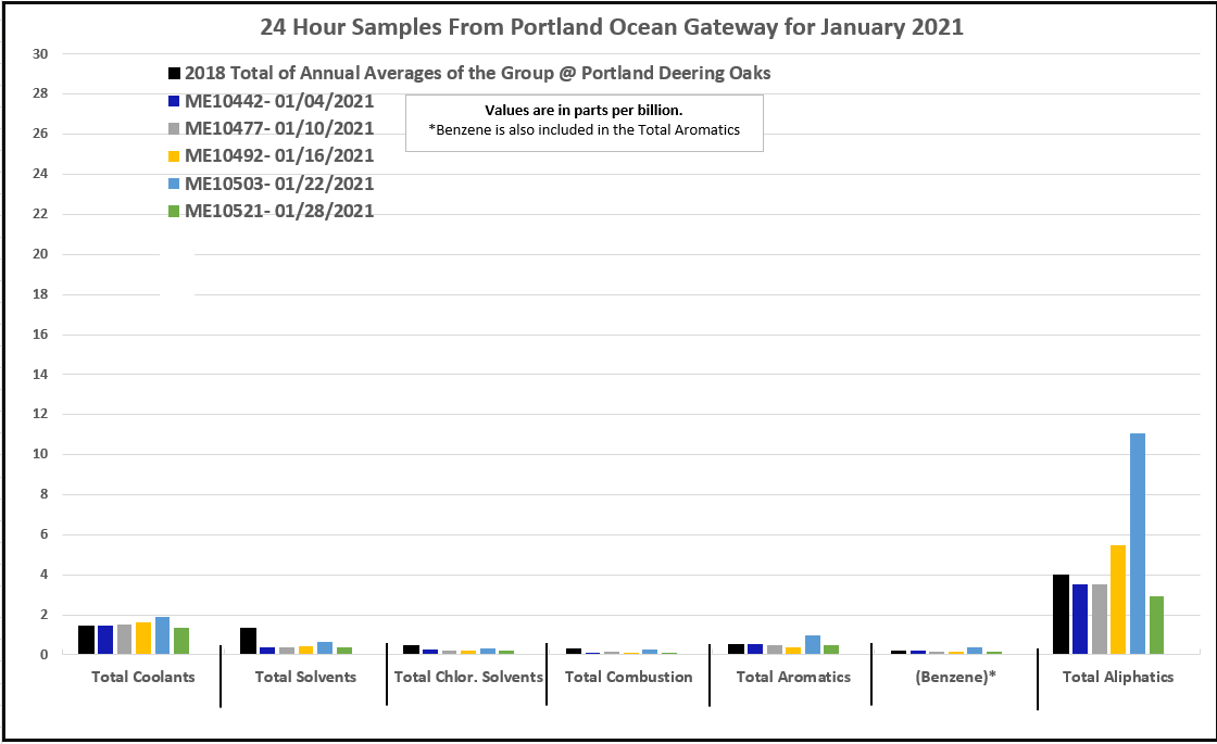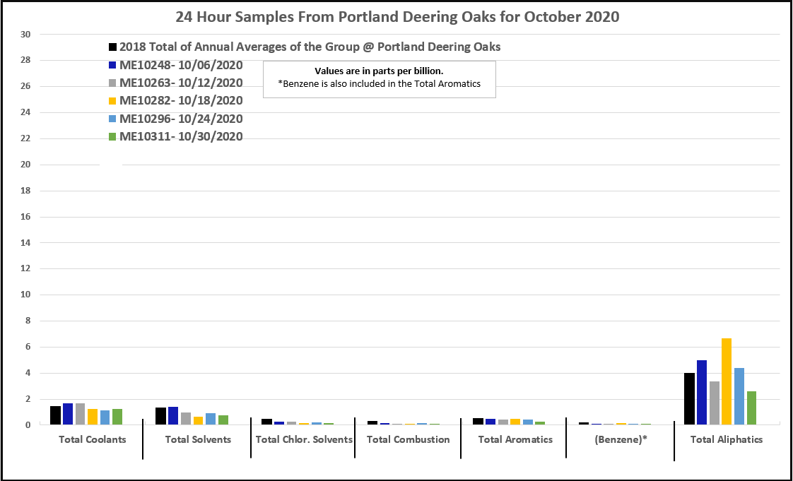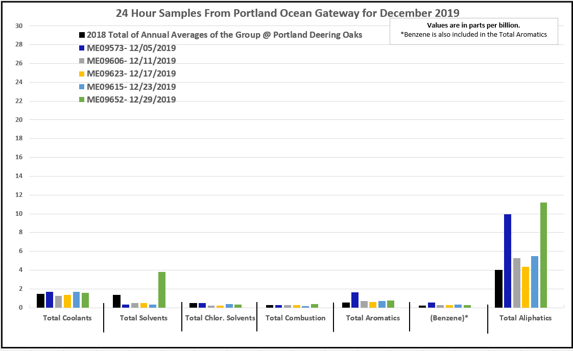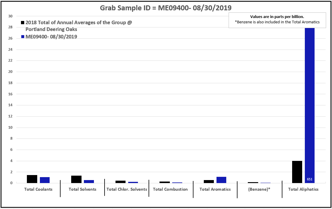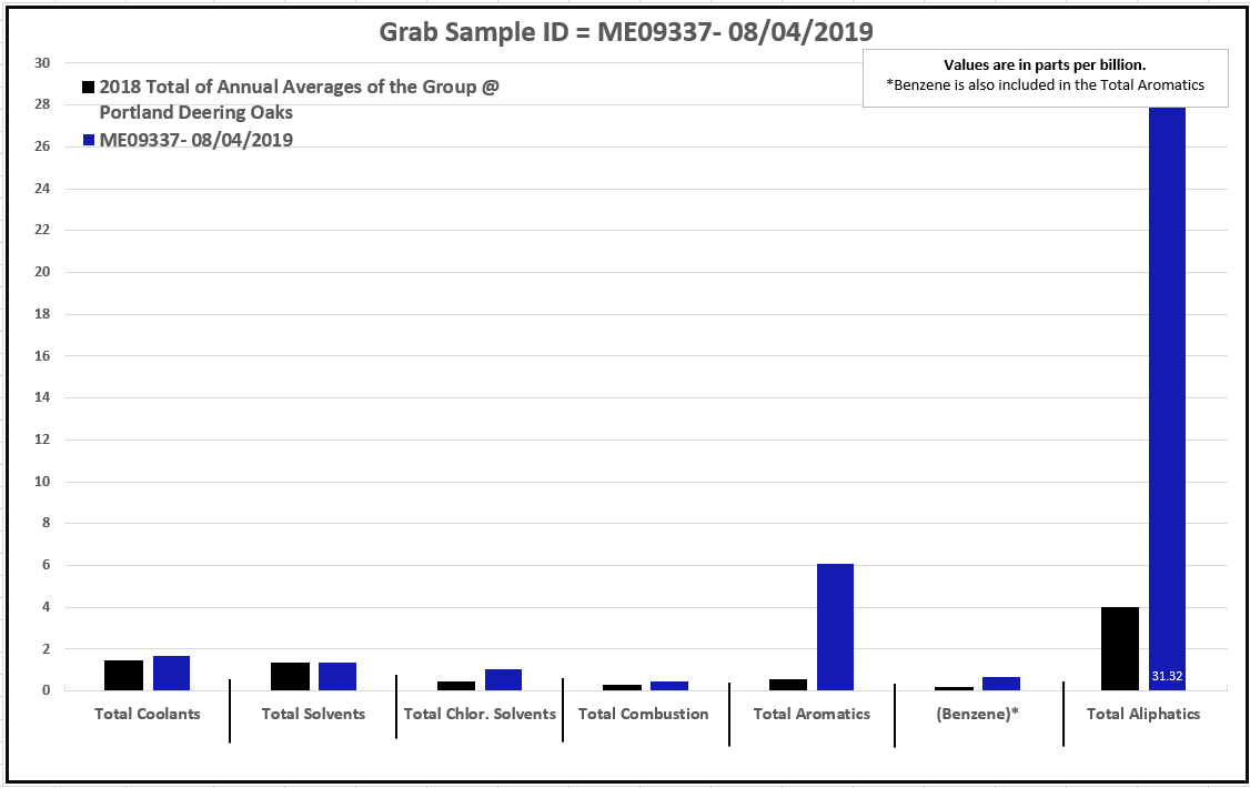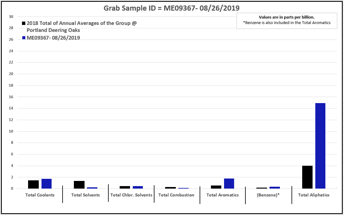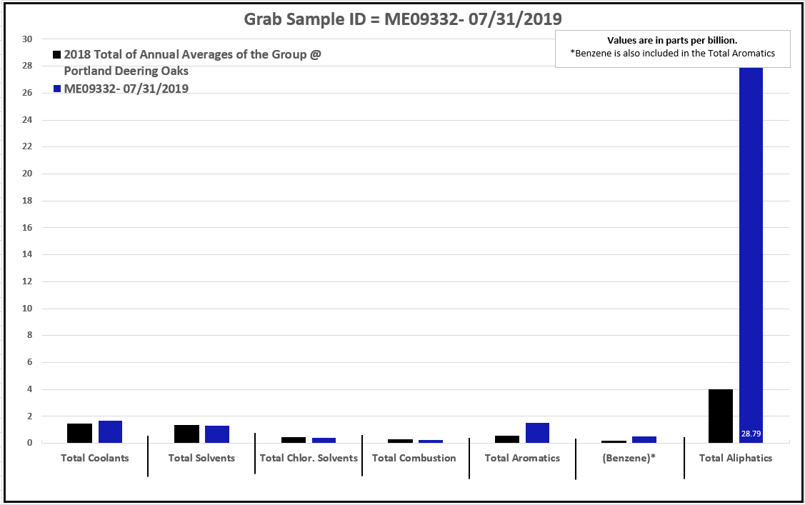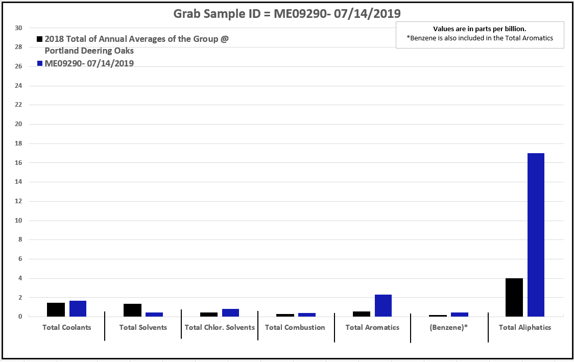 CAUTION to grab sampling data users: It is not appropriate to use grab sample data for any comparison to longer term average (e.g. annual) levels, guidelines or standards for health assessment purposes. Staff from the Maine Center for Disease Control (CDC) gave a presentation (PDF) to the South Portland City Council on November 26, 2019 that describes and illustrates their approach to interpreting this data from a health perspective. The grab sample data charts we’ve created here are intended to simply be a visualization of each sample’s results from an air quality perspective, comparing them to the 2018 annual averages from our Portland Deering Oaks site, which for this purpose are being used as reference or background concentrations for the area.