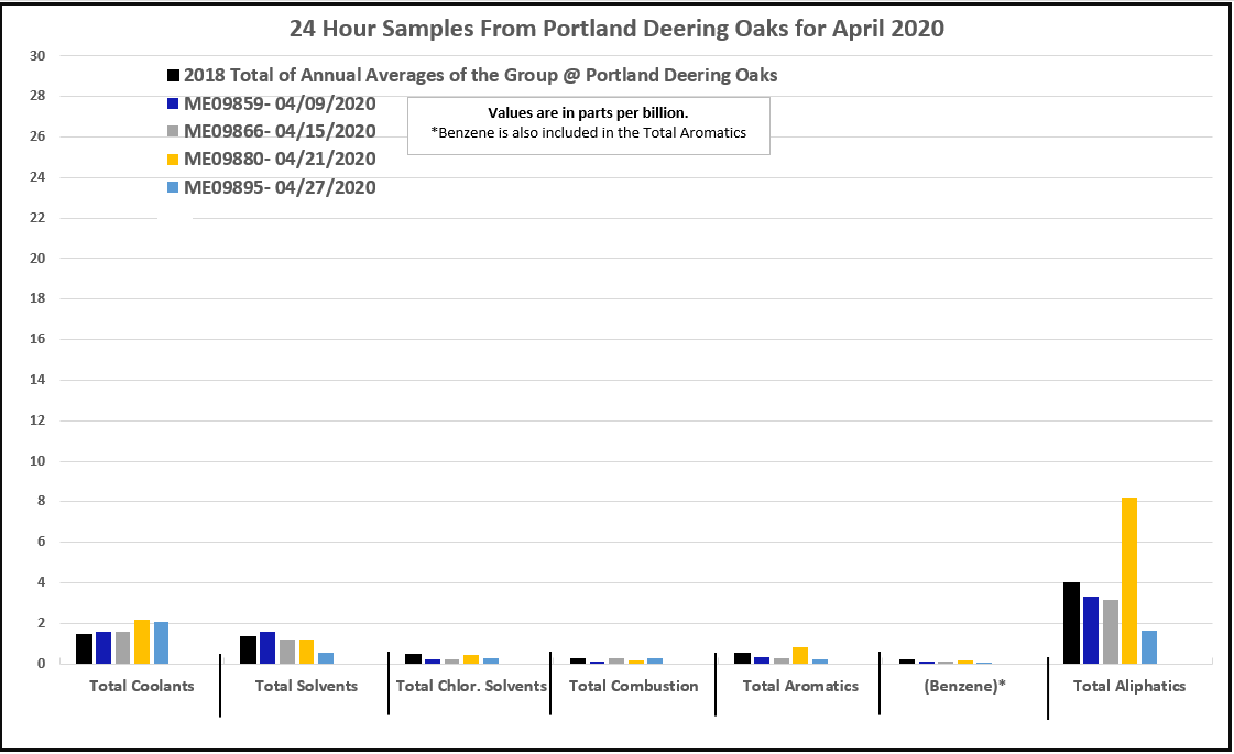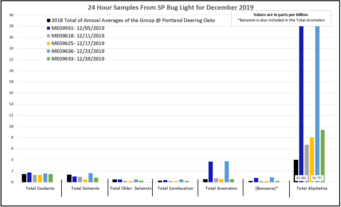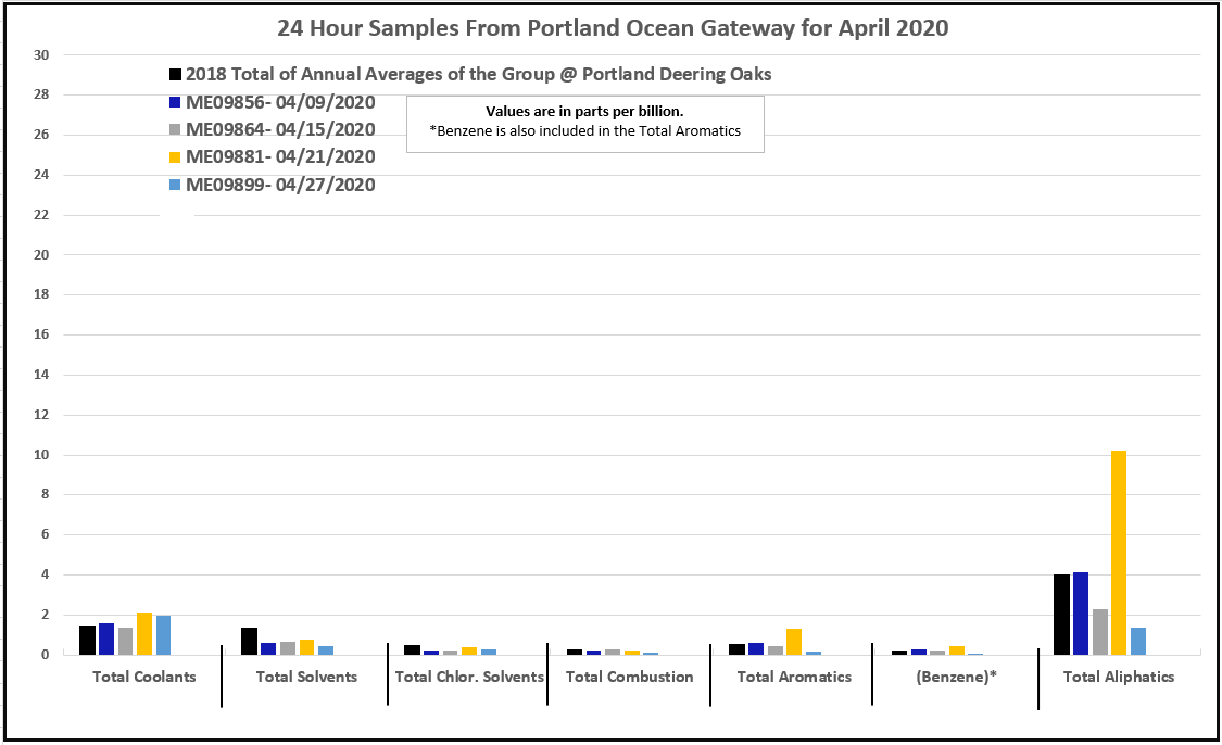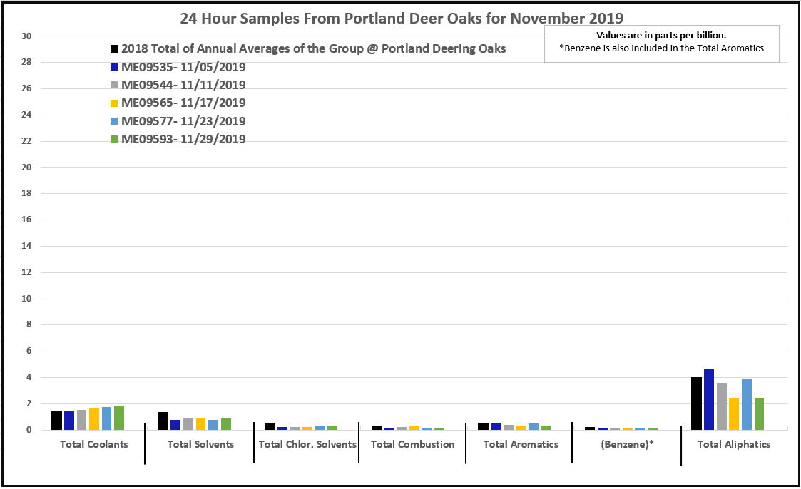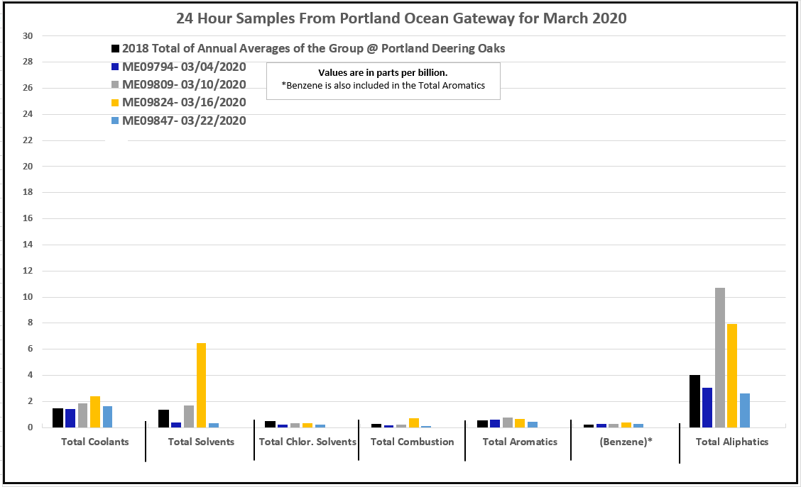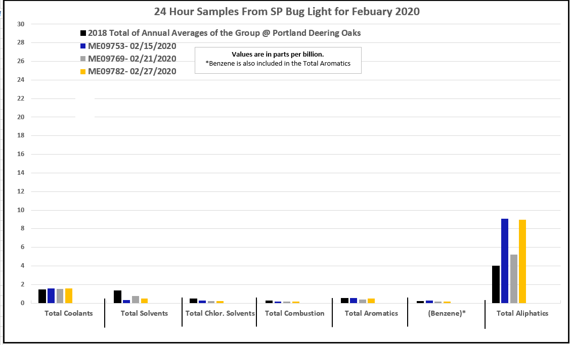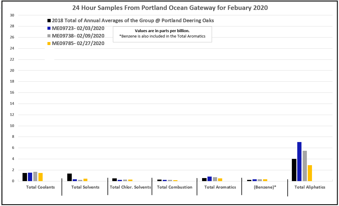 CAUTION to grab sampling data users: It is not appropriate to use grab sample data for any comparison to longer term average (e.g. annual) levels, guidelines or standards for health assessment purposes. Staff from the Maine Center for Disease Control (CDC) gave a presentation (PDF) to the South Portland City Council on November 26, 2019 that describes and illustrates their approach to interpreting this data from a health perspective. The grab sample data charts we’ve created here are intended to simply be a visualization of each sample’s results from an air quality perspective, comparing them to the 2018 annual averages from our Portland Deering Oaks site, which for this purpose are being used as reference or background concentrations for the area.