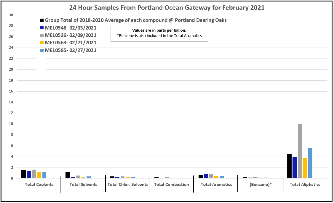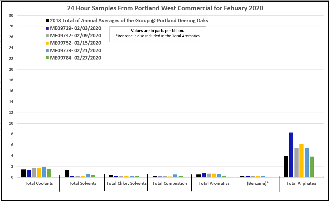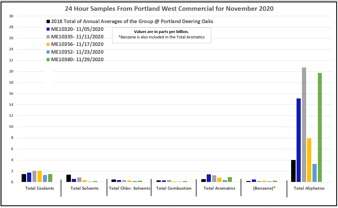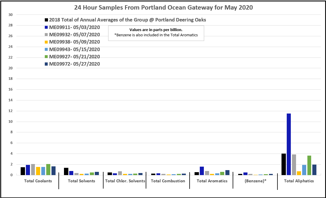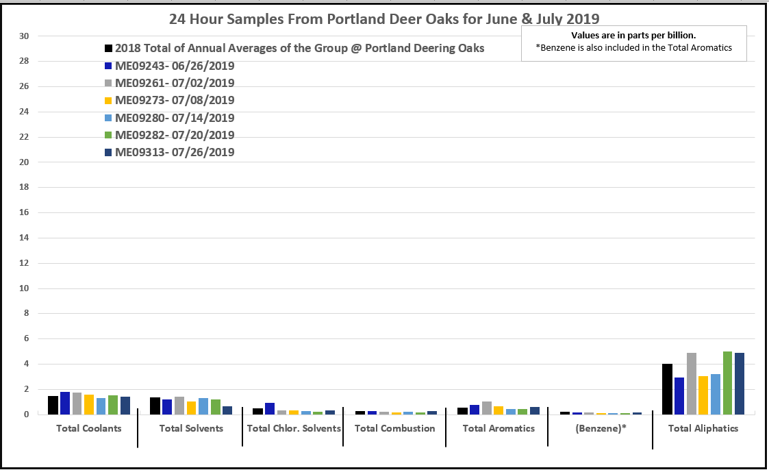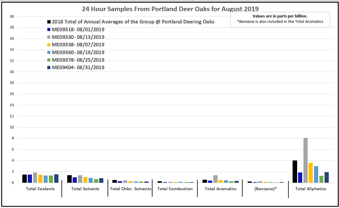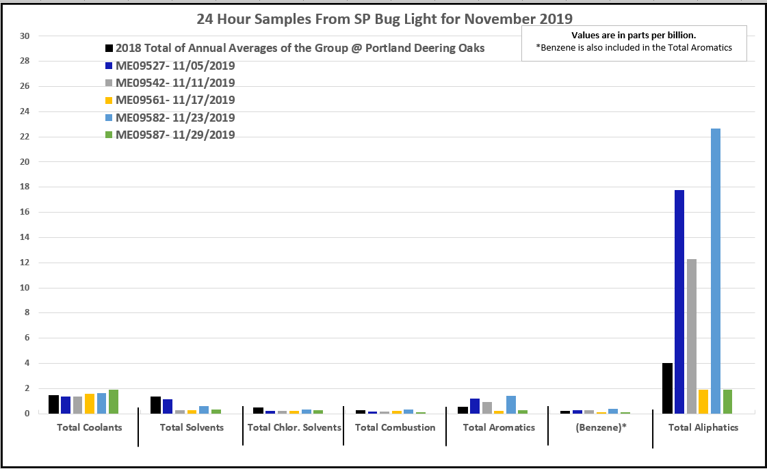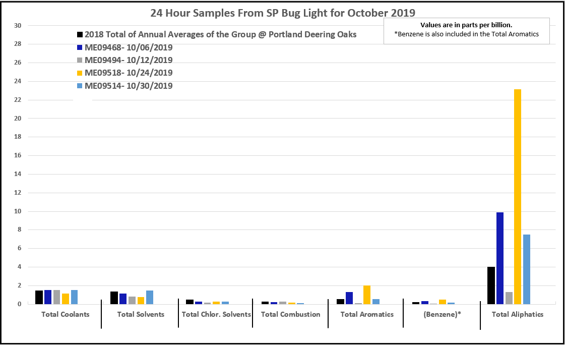 CAUTION to grab sampling data users: It is not appropriate to use grab sample data for any comparison to longer term average (e.g. annual) levels, guidelines or standards for health assessment purposes. Staff from the Maine Center for Disease Control (CDC) gave a presentation (PDF) to the South Portland City Council on November 26, 2019 that describes and illustrates their approach to interpreting this data from a health perspective. The grab sample data charts we’ve created here are intended to simply be a visualization of each sample’s results from an air quality perspective, comparing them to the 2018 annual averages from our Portland Deering Oaks site, which for this purpose are being used as reference or background concentrations for the area.