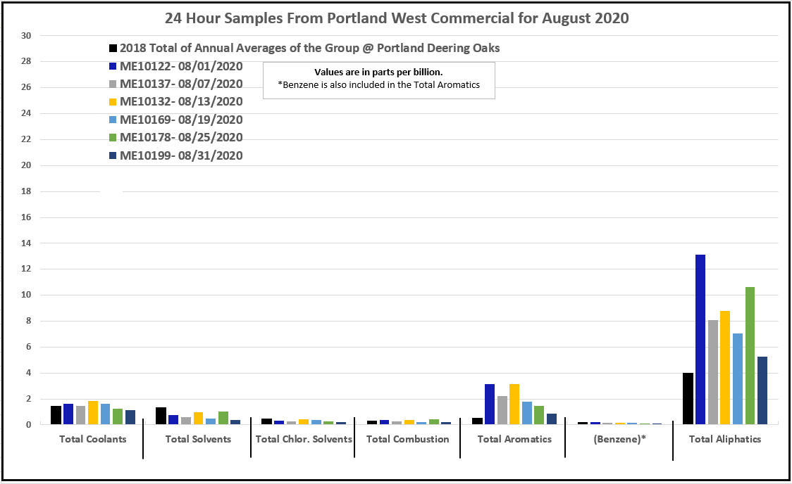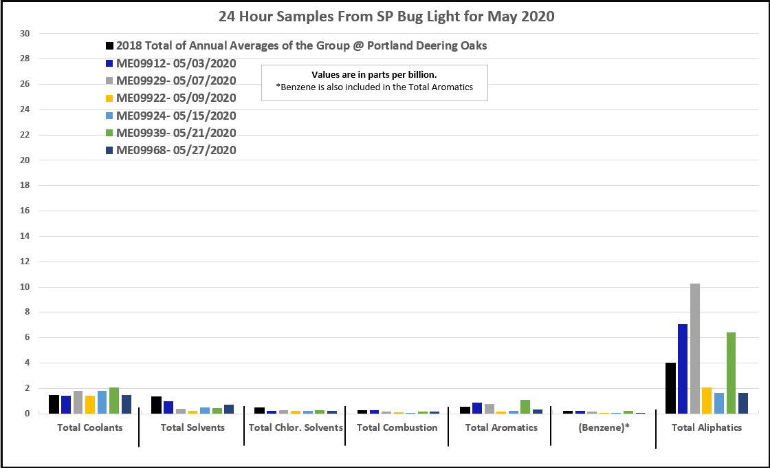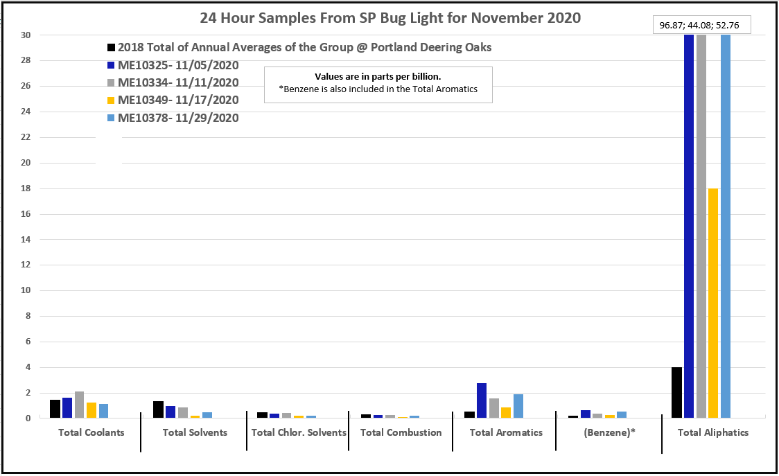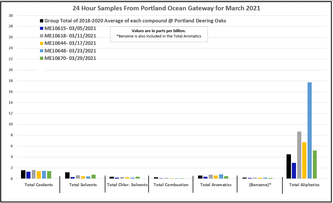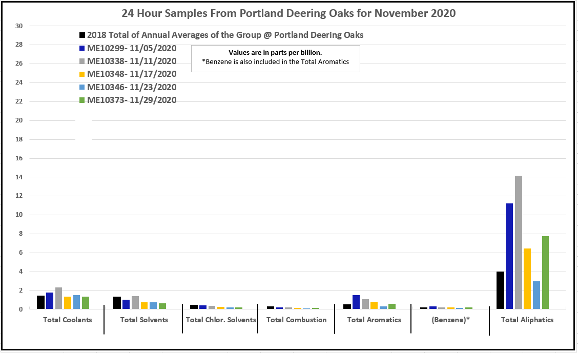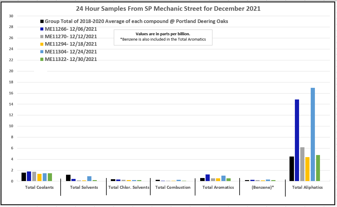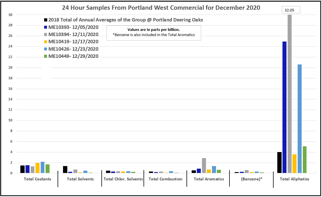 CAUTION to grab sampling data users: It is not appropriate to use grab sample data for any comparison to longer term average (e.g. annual) levels, guidelines or standards for health assessment purposes. Staff from the Maine Center for Disease Control (CDC) gave a presentation (PDF) to the South Portland City Council on November 26, 2019 that describes and illustrates their approach to interpreting this data from a health perspective. The grab sample data charts we’ve created here are intended to simply be a visualization of each sample’s results from an air quality perspective, comparing them to the 2018 annual averages from our Portland Deering Oaks site, which for this purpose are being used as reference or background concentrations for the area.