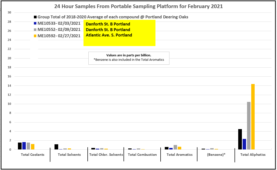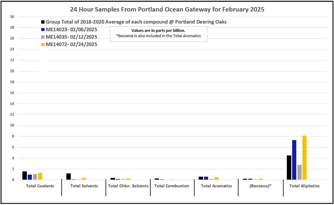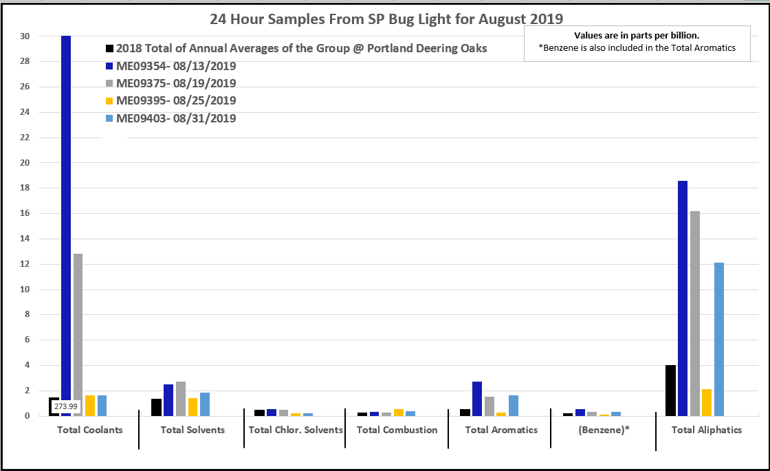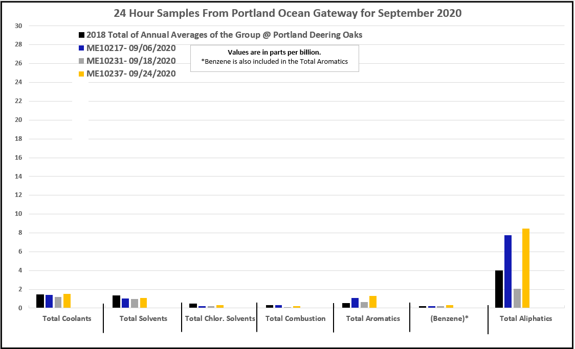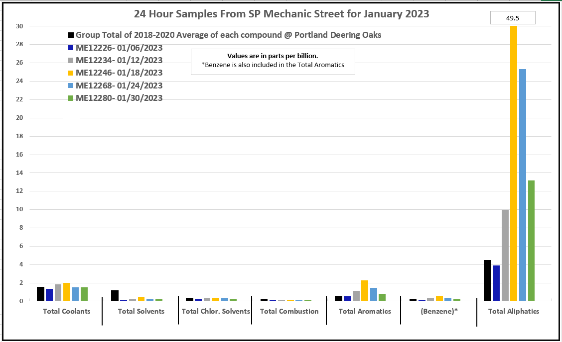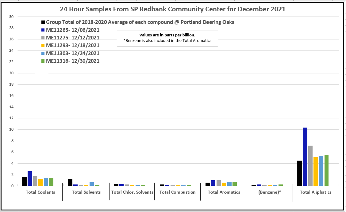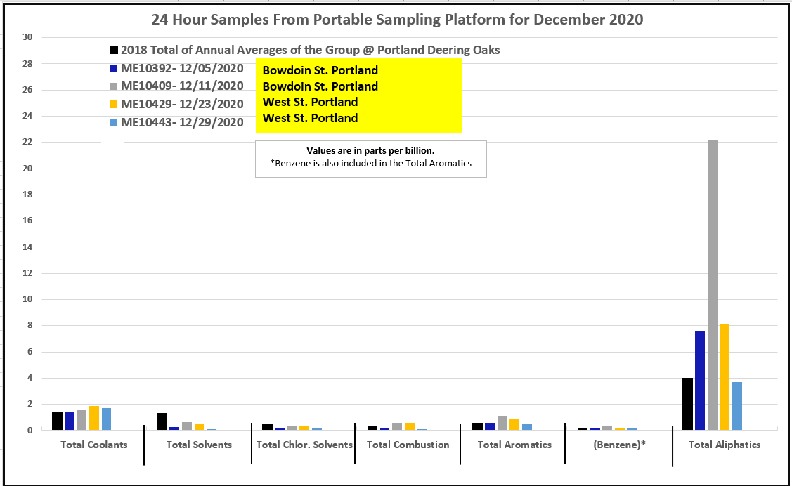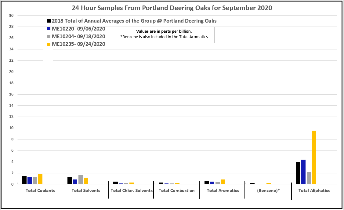 CAUTION to grab sampling data users: It is not appropriate to use grab sample data for any comparison to longer term average (e.g. annual) levels, guidelines or standards for health assessment purposes. Staff from the Maine Center for Disease Control (CDC) gave a presentation (PDF) to the South Portland City Council on November 26, 2019 that describes and illustrates their approach to interpreting this data from a health perspective. The grab sample data charts we’ve created here are intended to simply be a visualization of each sample’s results from an air quality perspective, comparing them to the 2018 annual averages from our Portland Deering Oaks site, which for this purpose are being used as reference or background concentrations for the area.