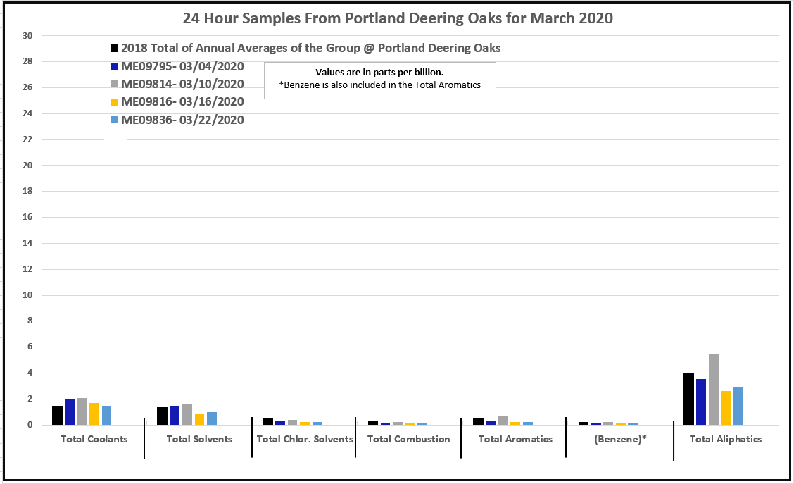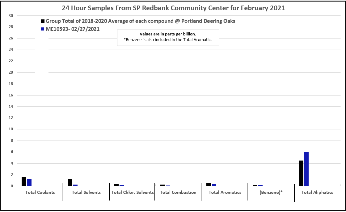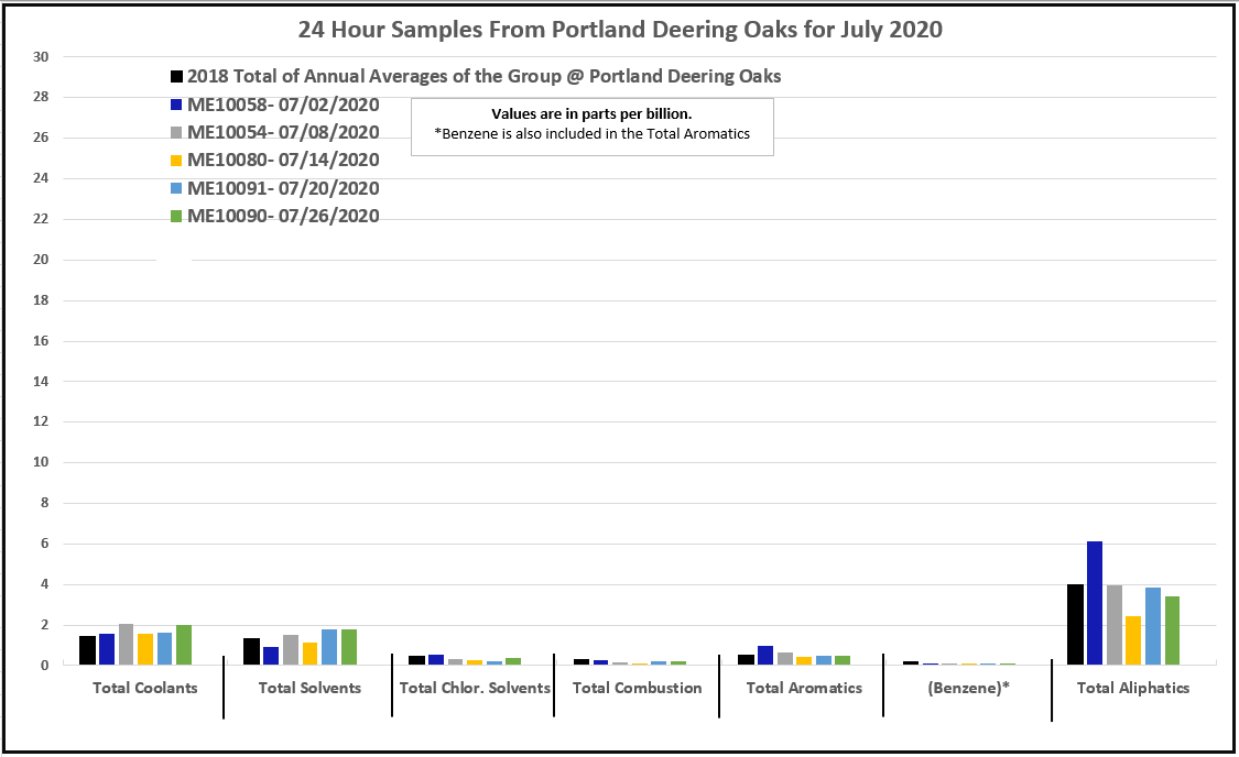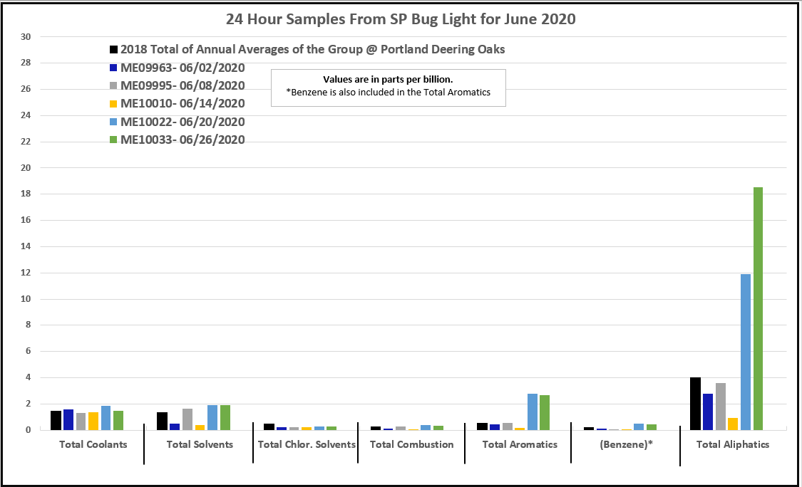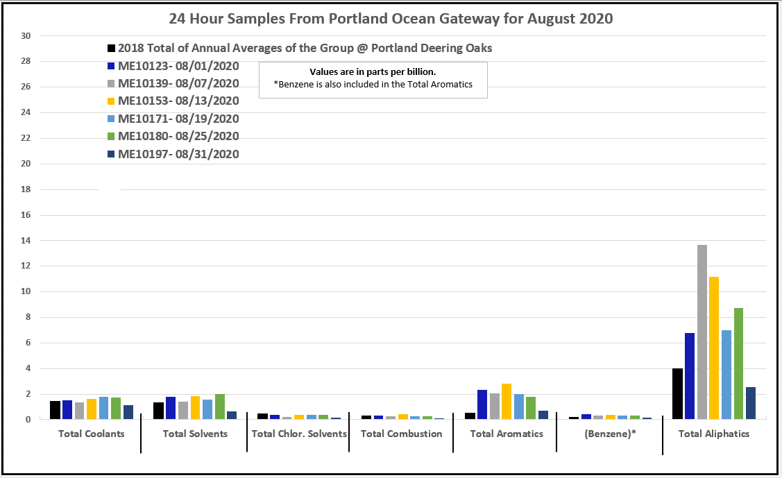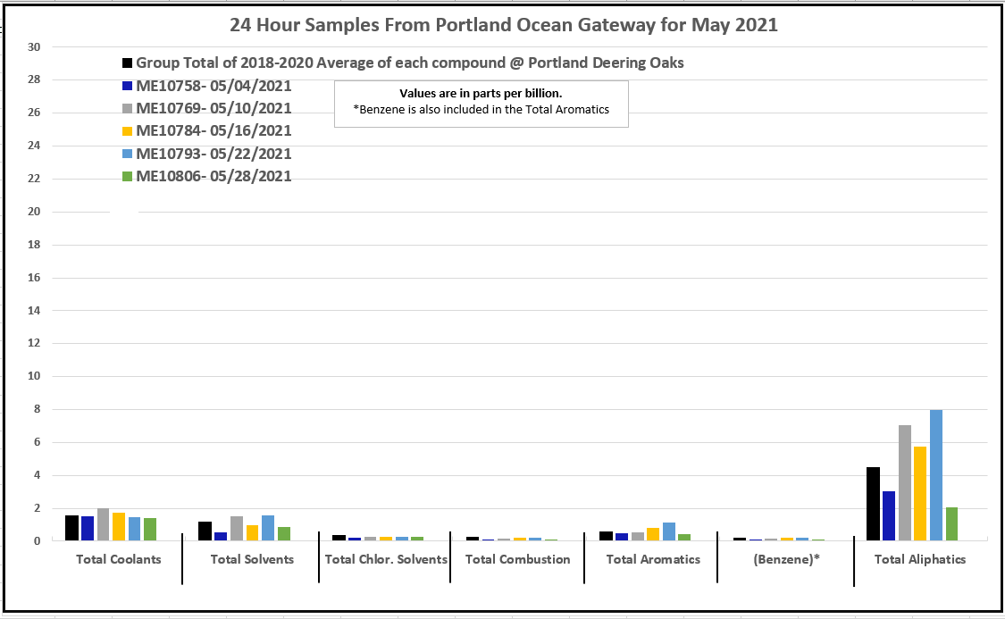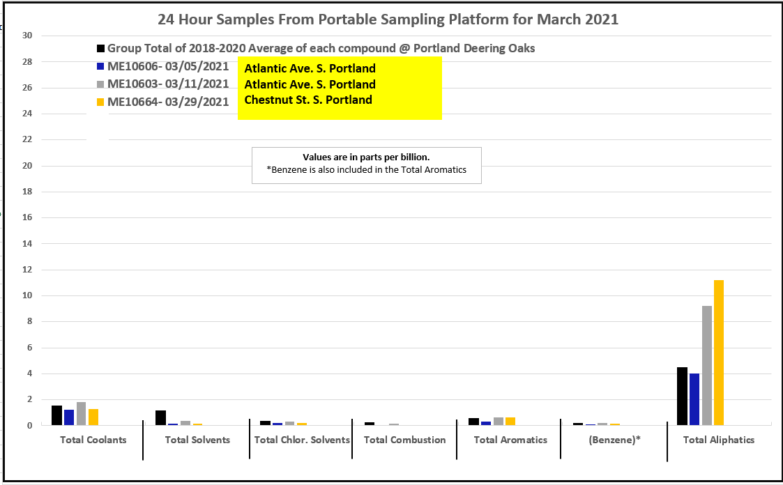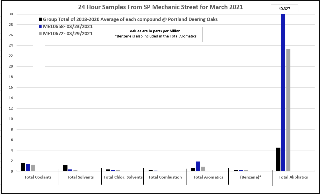 CAUTION to grab sampling data users: It is not appropriate to use grab sample data for any comparison to longer term average (e.g. annual) levels, guidelines or standards for health assessment purposes. Staff from the Maine Center for Disease Control (CDC) gave a presentation (PDF) to the South Portland City Council on November 26, 2019 that describes and illustrates their approach to interpreting this data from a health perspective. The grab sample data charts we’ve created here are intended to simply be a visualization of each sample’s results from an air quality perspective, comparing them to the 2018 annual averages from our Portland Deering Oaks site, which for this purpose are being used as reference or background concentrations for the area.