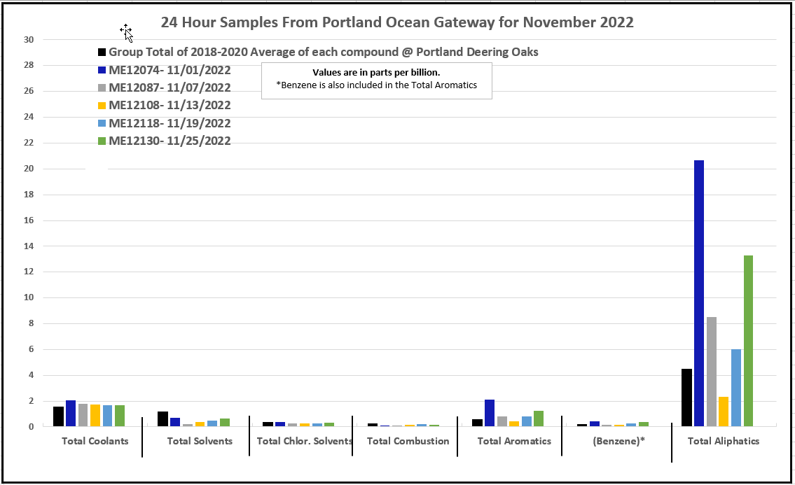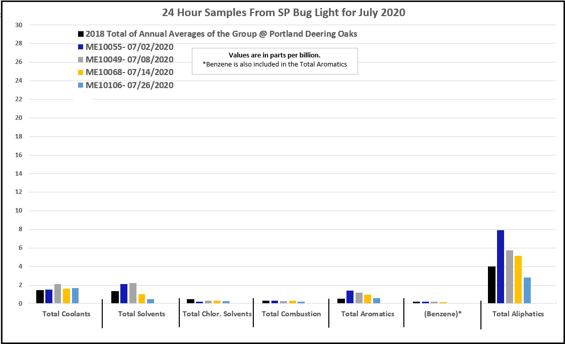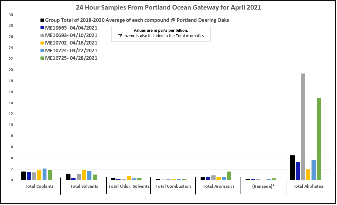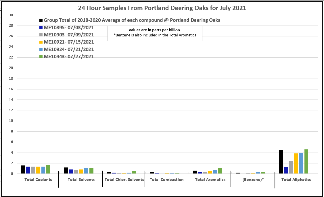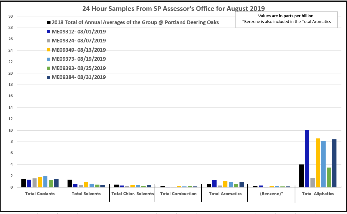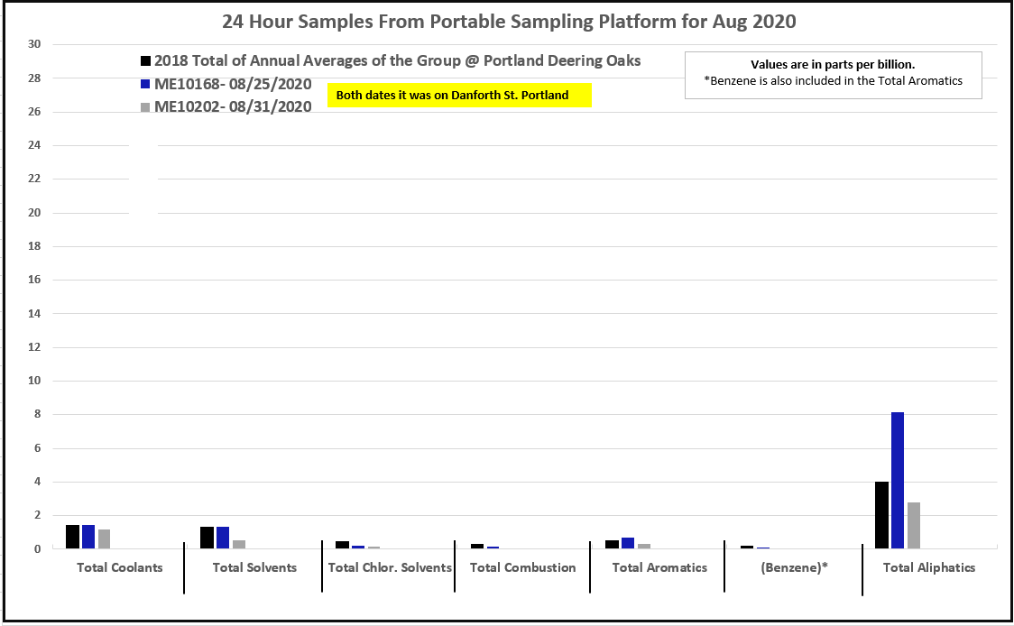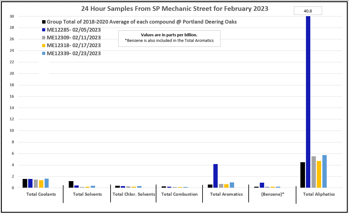 CAUTION to grab sampling data users: It is not appropriate to use grab sample data for any comparison to longer term average (e.g. annual) levels, guidelines or standards for health assessment purposes. Staff from the Maine Center for Disease Control (CDC) gave a presentation (PDF) to the South Portland City Council on November 26, 2019 that describes and illustrates their approach to interpreting this data from a health perspective. The grab sample data charts we’ve created here are intended to simply be a visualization of each sample’s results from an air quality perspective, comparing them to the 2018 annual averages from our Portland Deering Oaks site, which for this purpose are being used as reference or background concentrations for the area.
