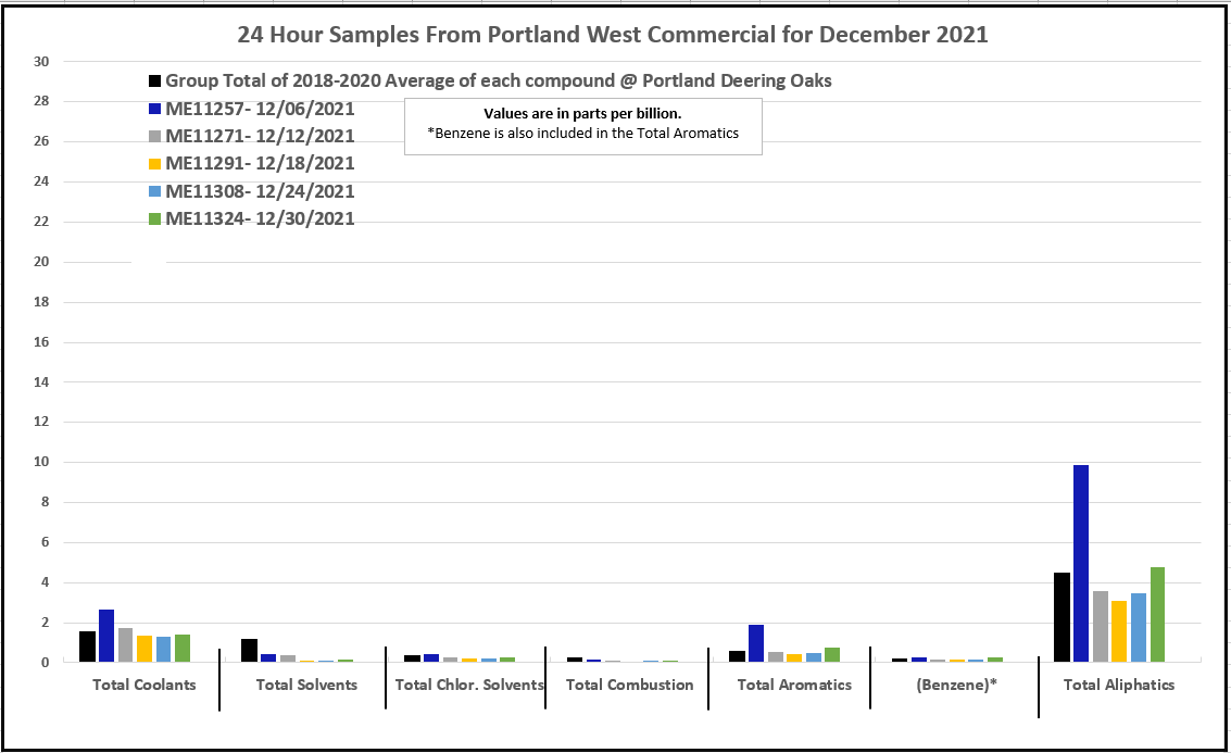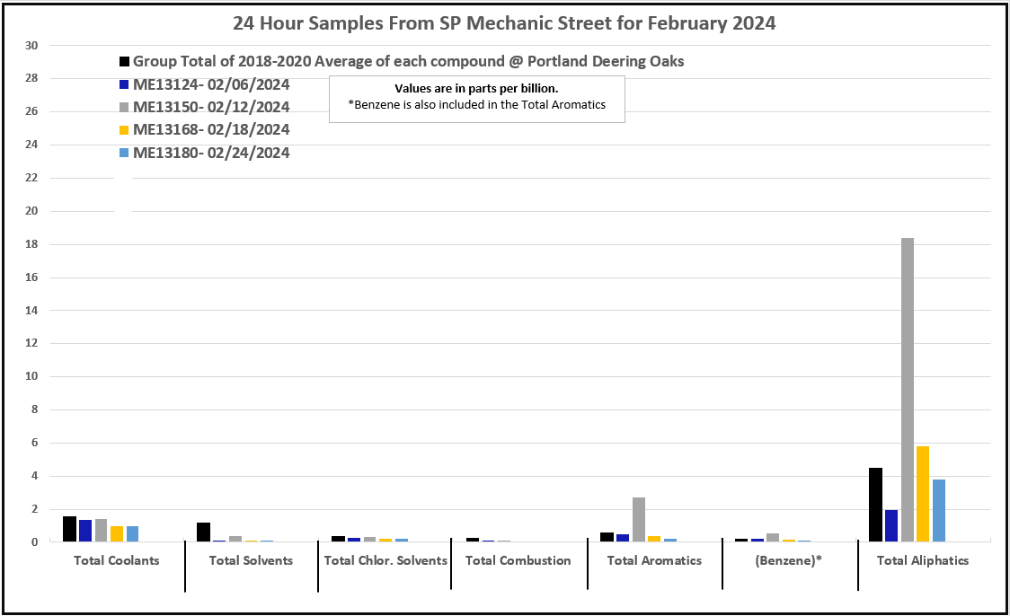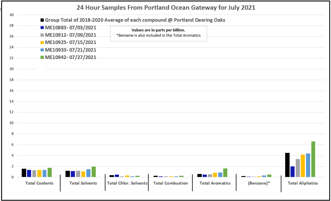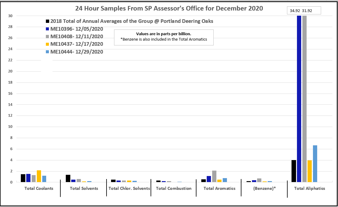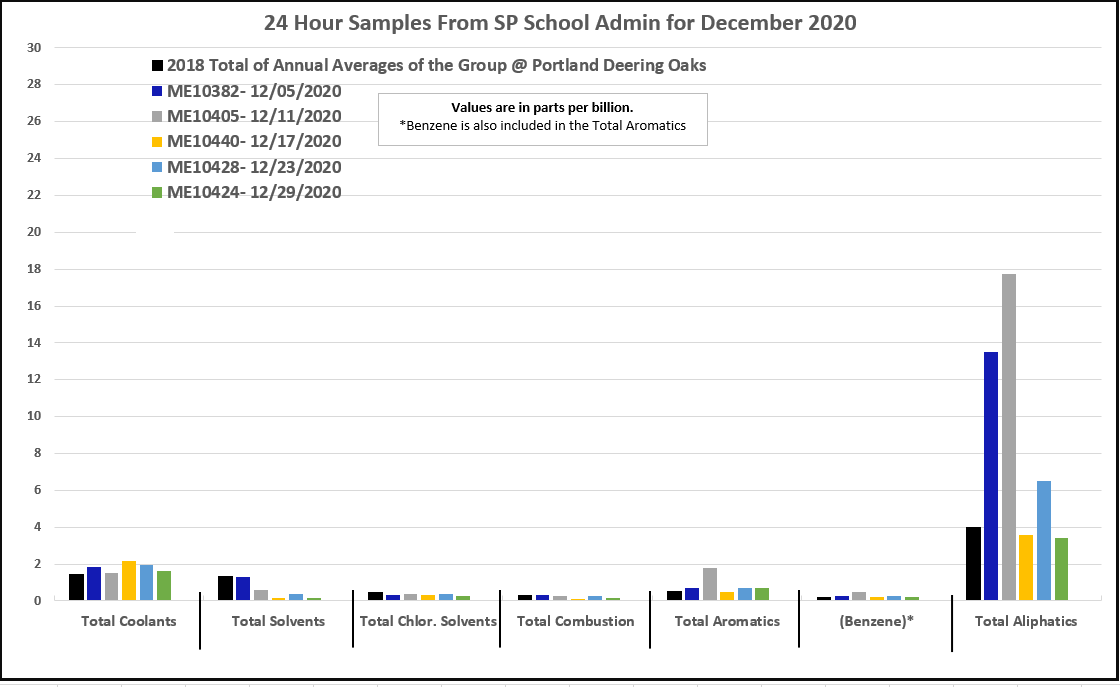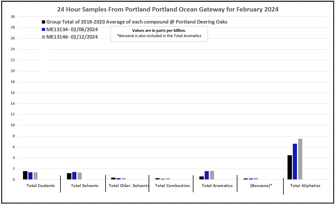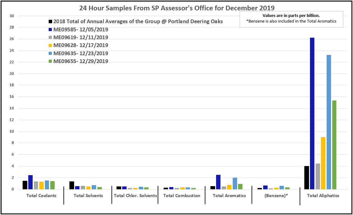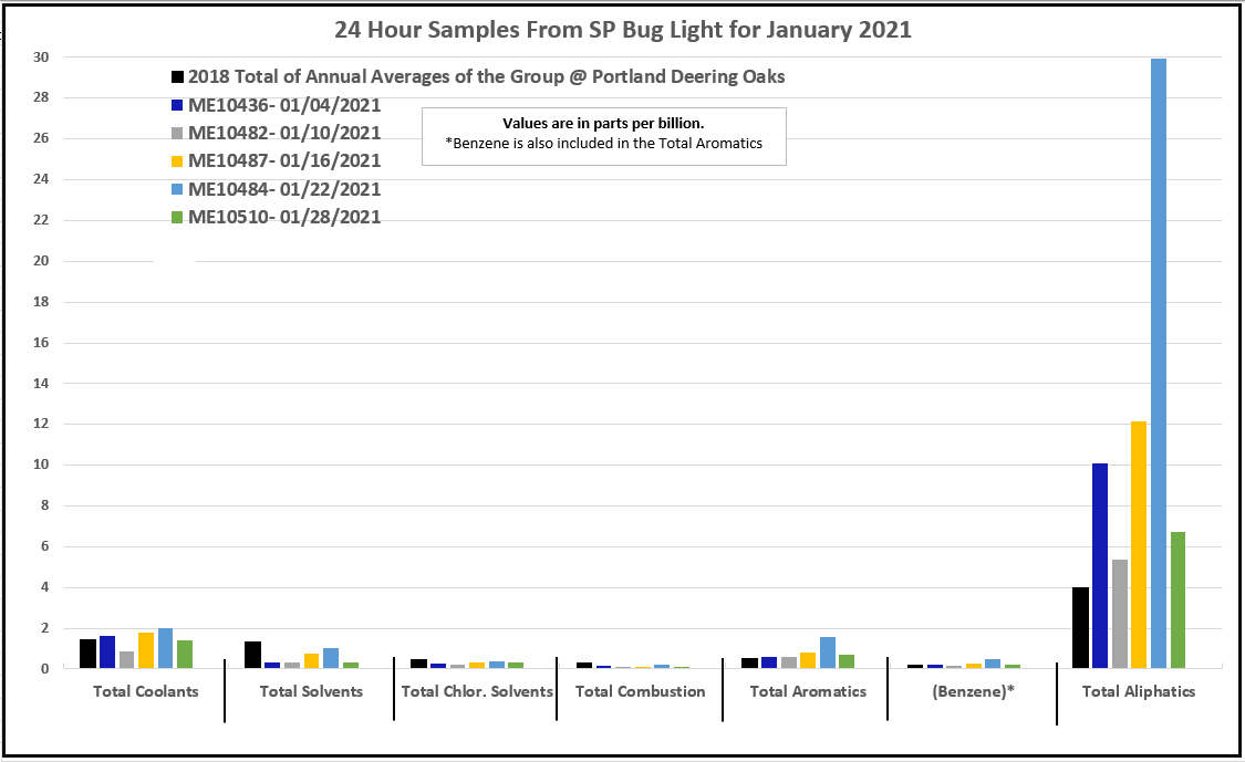 CAUTION to grab sampling data users: It is not appropriate to use grab sample data for any comparison to longer term average (e.g. annual) levels, guidelines or standards for health assessment purposes. Staff from the Maine Center for Disease Control (CDC) gave a presentation (PDF) to the South Portland City Council on November 26, 2019 that describes and illustrates their approach to interpreting this data from a health perspective. The grab sample data charts we’ve created here are intended to simply be a visualization of each sample’s results from an air quality perspective, comparing them to the 2018 annual averages from our Portland Deering Oaks site, which for this purpose are being used as reference or background concentrations for the area.