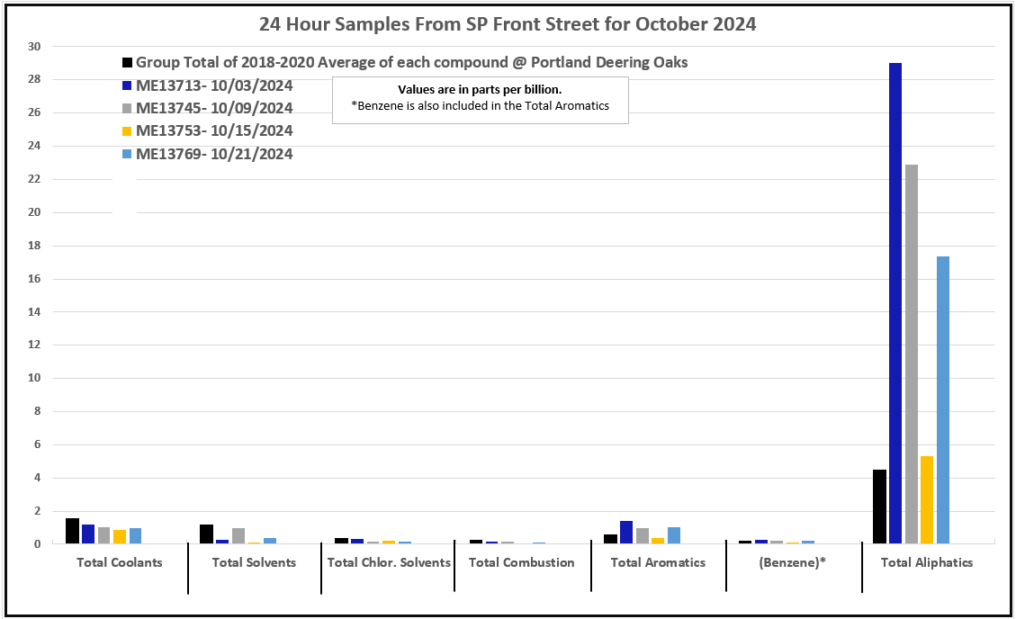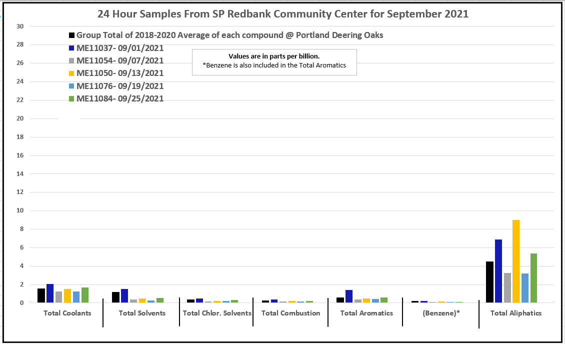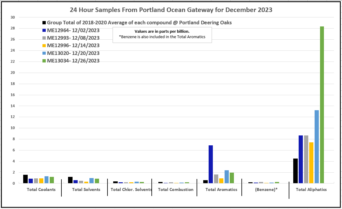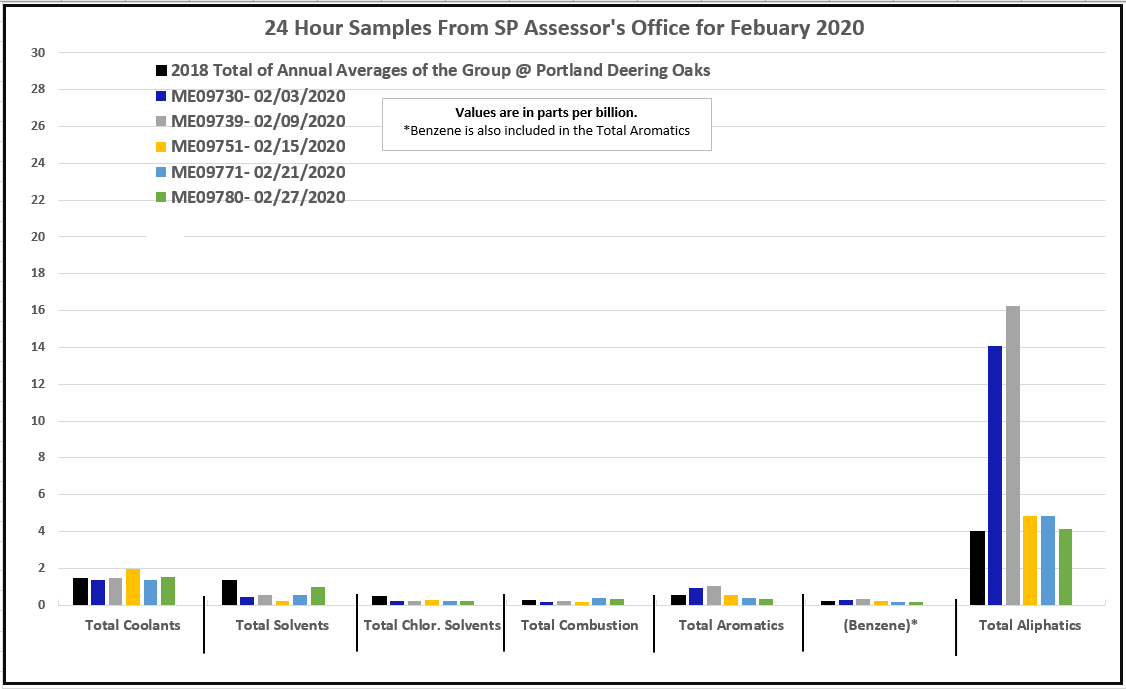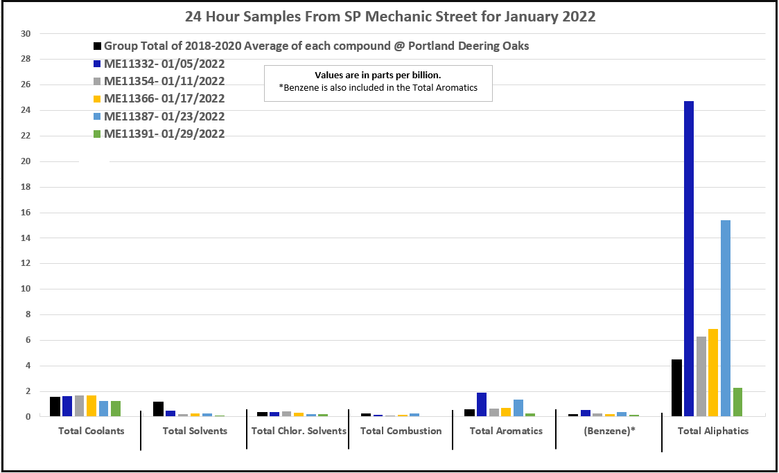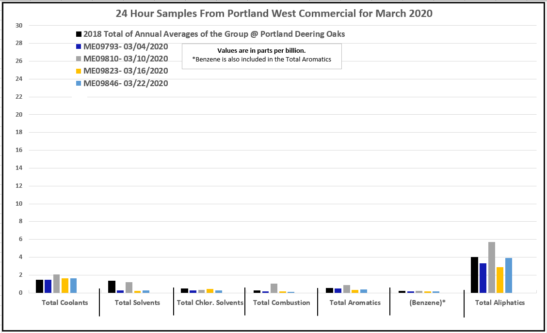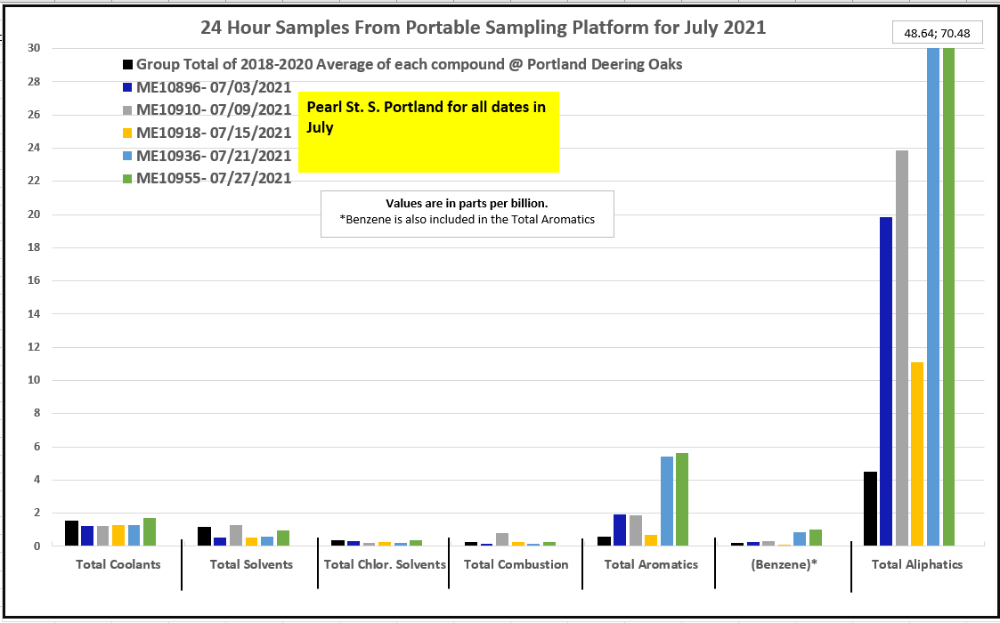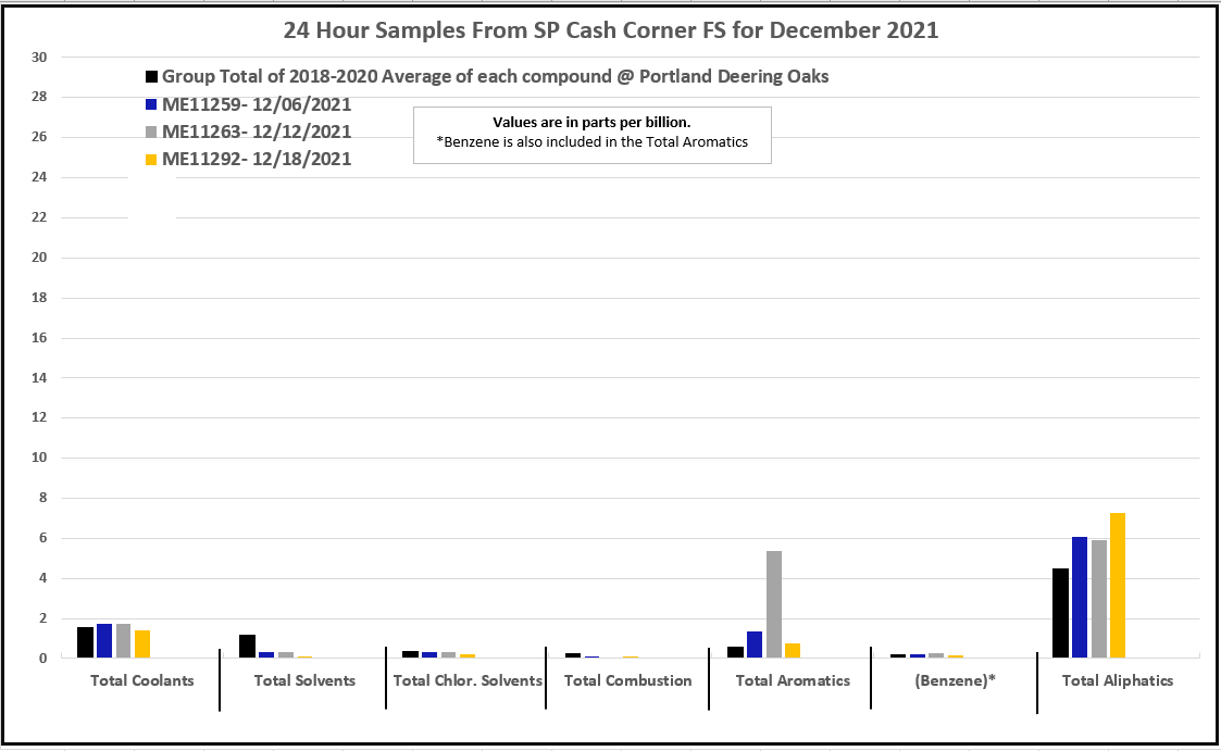 CAUTION to grab sampling data users: It is not appropriate to use grab sample data for any comparison to longer term average (e.g. annual) levels, guidelines or standards for health assessment purposes. Staff from the Maine Center for Disease Control (CDC) gave a presentation (PDF) to the South Portland City Council on November 26, 2019 that describes and illustrates their approach to interpreting this data from a health perspective. The grab sample data charts we’ve created here are intended to simply be a visualization of each sample’s results from an air quality perspective, comparing them to the 2018 annual averages from our Portland Deering Oaks site, which for this purpose are being used as reference or background concentrations for the area.