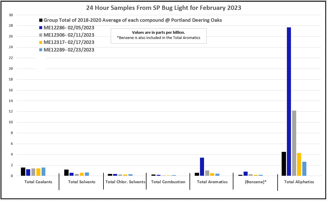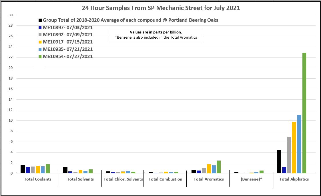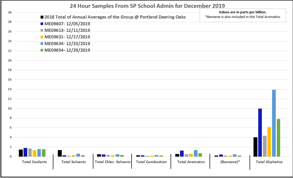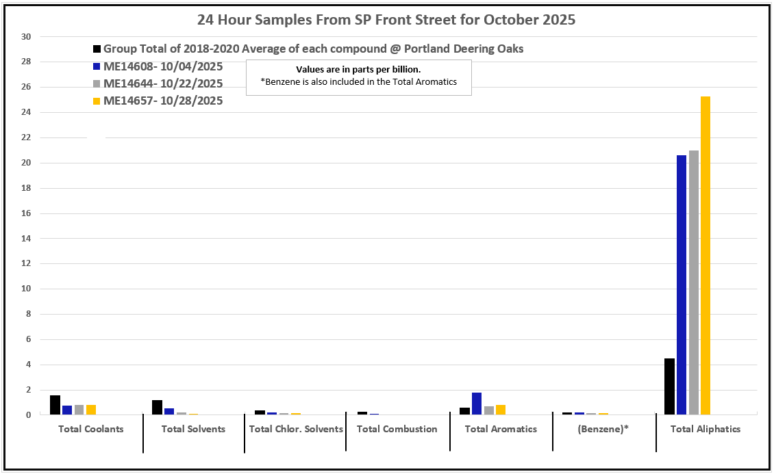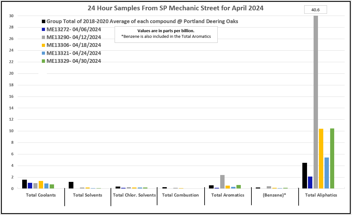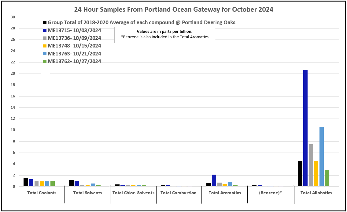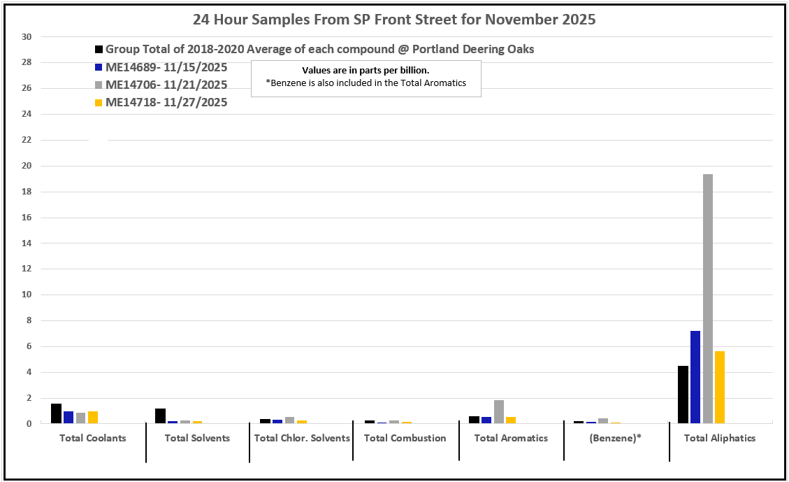 CAUTION to grab sampling data users: It is not appropriate to use grab sample data for any comparison to longer term average (e.g. annual) levels, guidelines or standards for health assessment purposes. Staff from the Maine Center for Disease Control (CDC) gave a presentation (PDF) to the South Portland City Council on November 26, 2019 that describes and illustrates their approach to interpreting this data from a health perspective. The grab sample data charts we’ve created here are intended to simply be a visualization of each sample’s results from an air quality perspective, comparing them to the 2018 annual averages from our Portland Deering Oaks site, which for this purpose are being used as reference or background concentrations for the area.