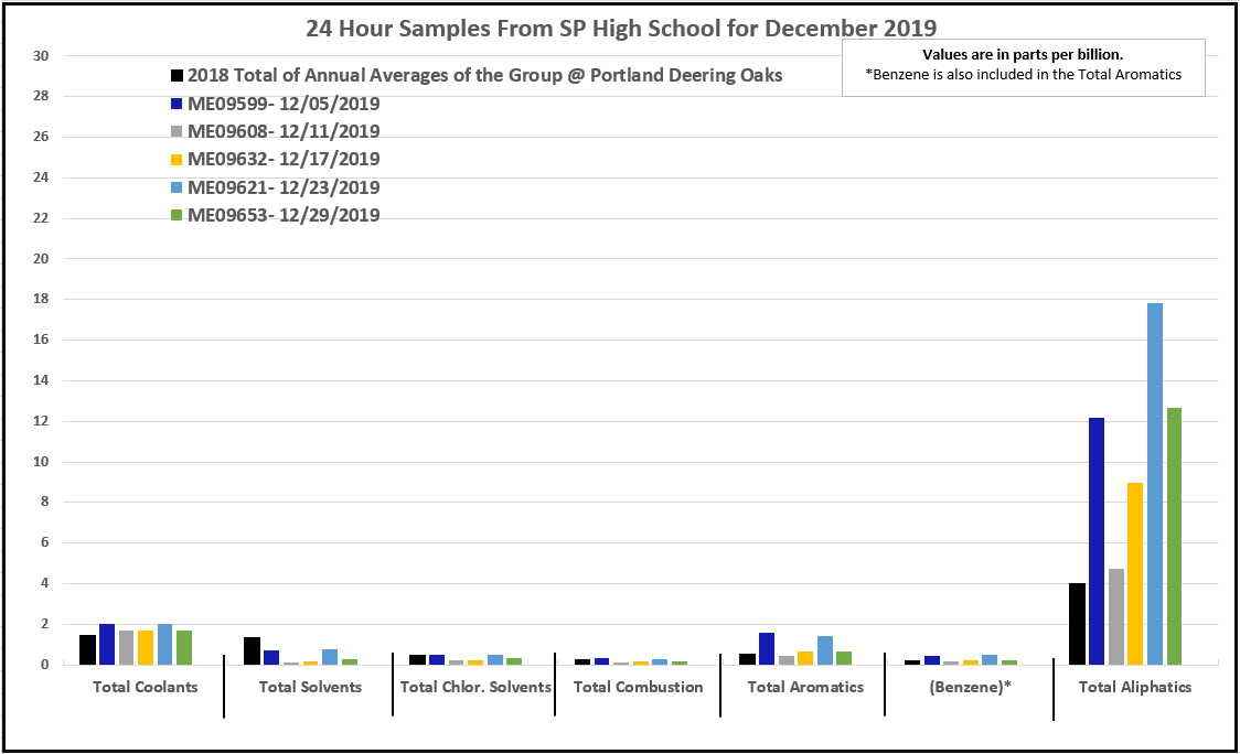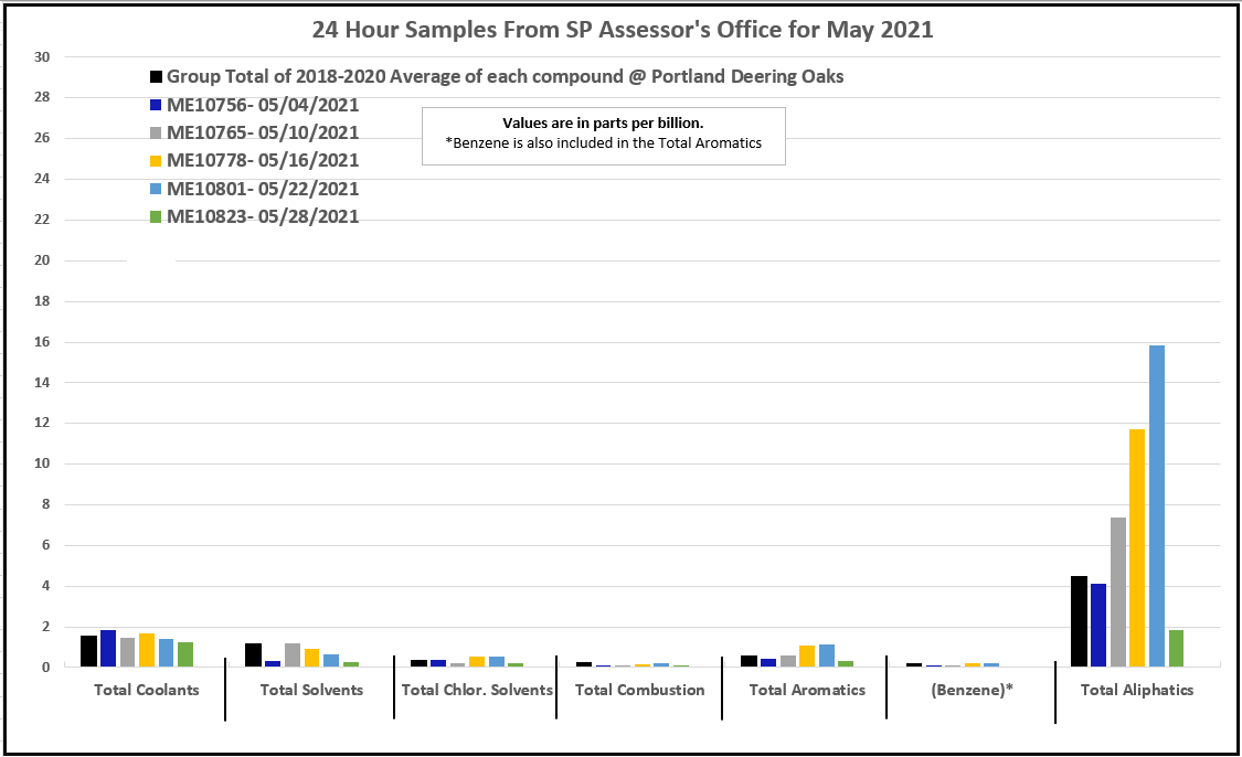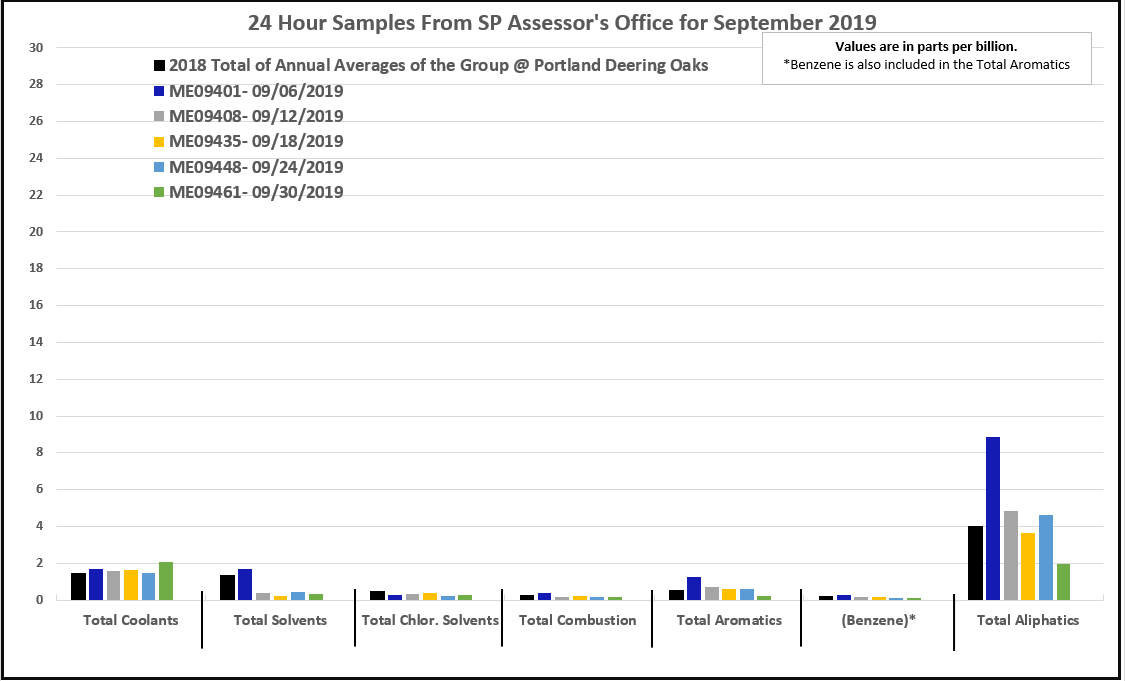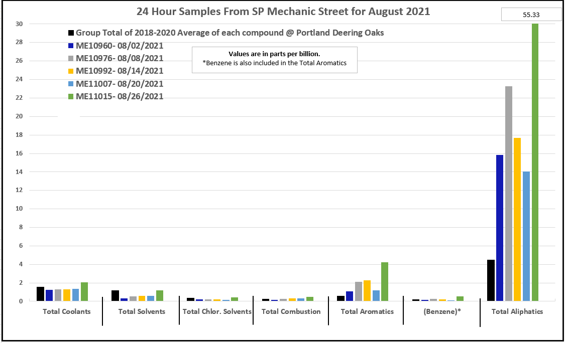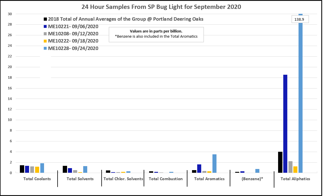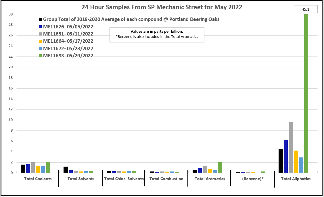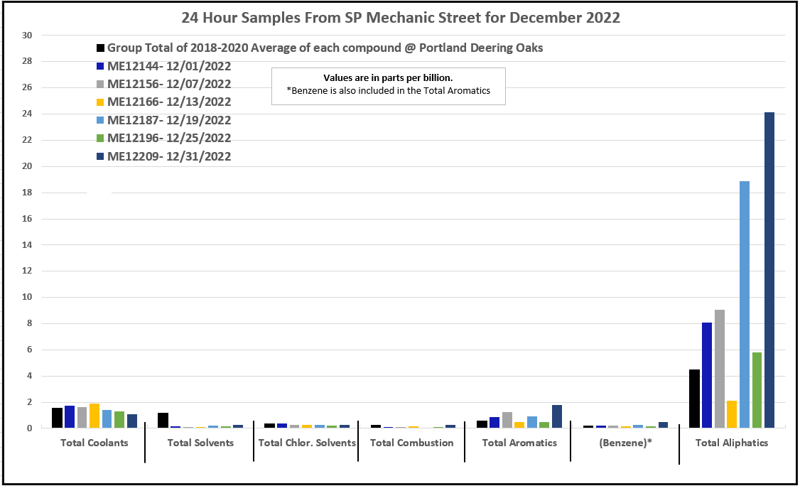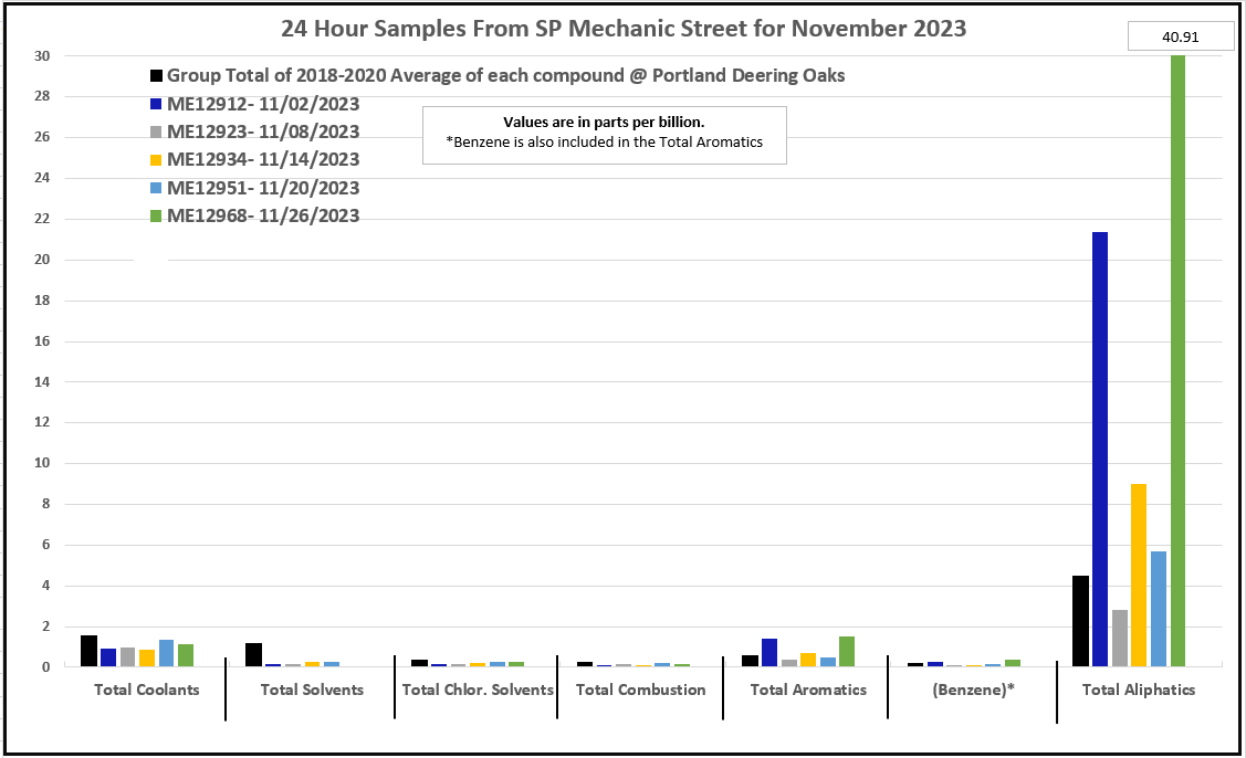 CAUTION to grab sampling data users: It is not appropriate to use grab sample data for any comparison to longer term average (e.g. annual) levels, guidelines or standards for health assessment purposes. Staff from the Maine Center for Disease Control (CDC) gave a presentation (PDF) to the South Portland City Council on November 26, 2019 that describes and illustrates their approach to interpreting this data from a health perspective. The grab sample data charts we’ve created here are intended to simply be a visualization of each sample’s results from an air quality perspective, comparing them to the 2018 annual averages from our Portland Deering Oaks site, which for this purpose are being used as reference or background concentrations for the area.