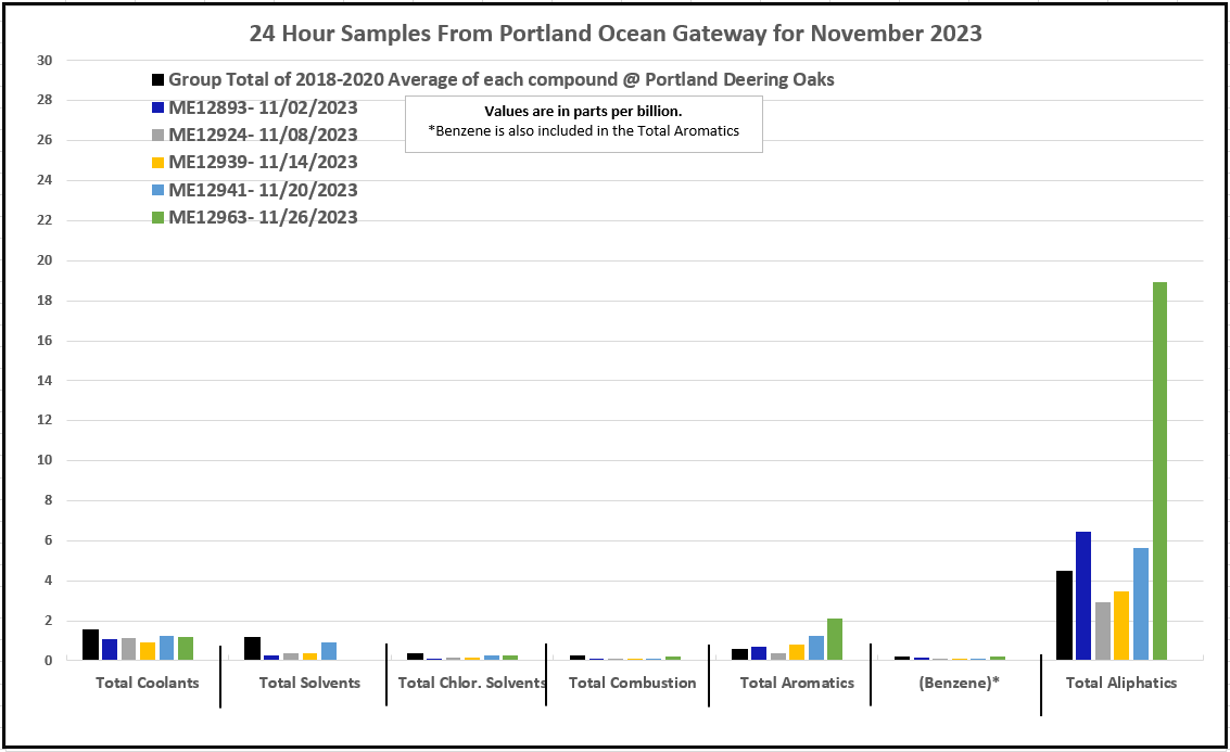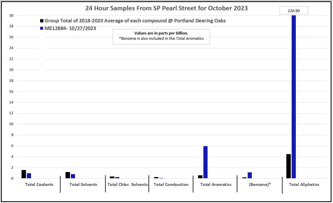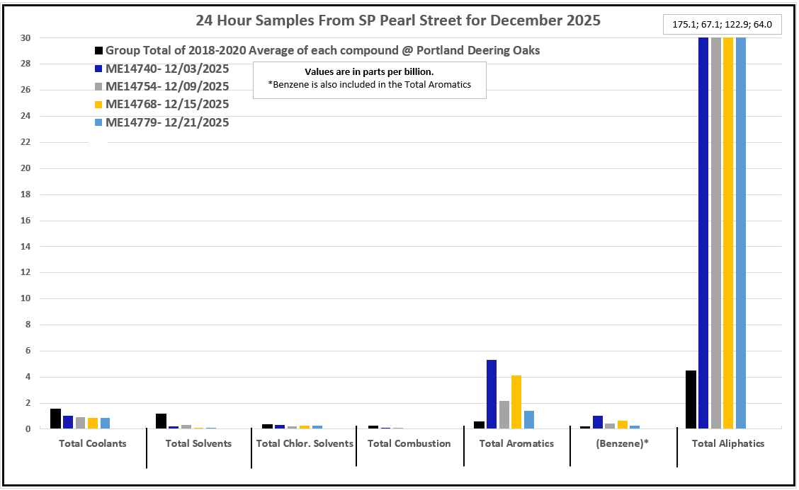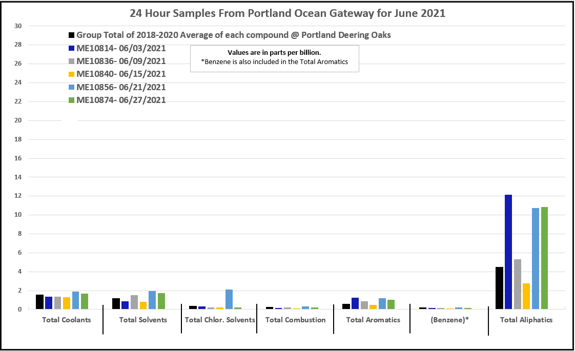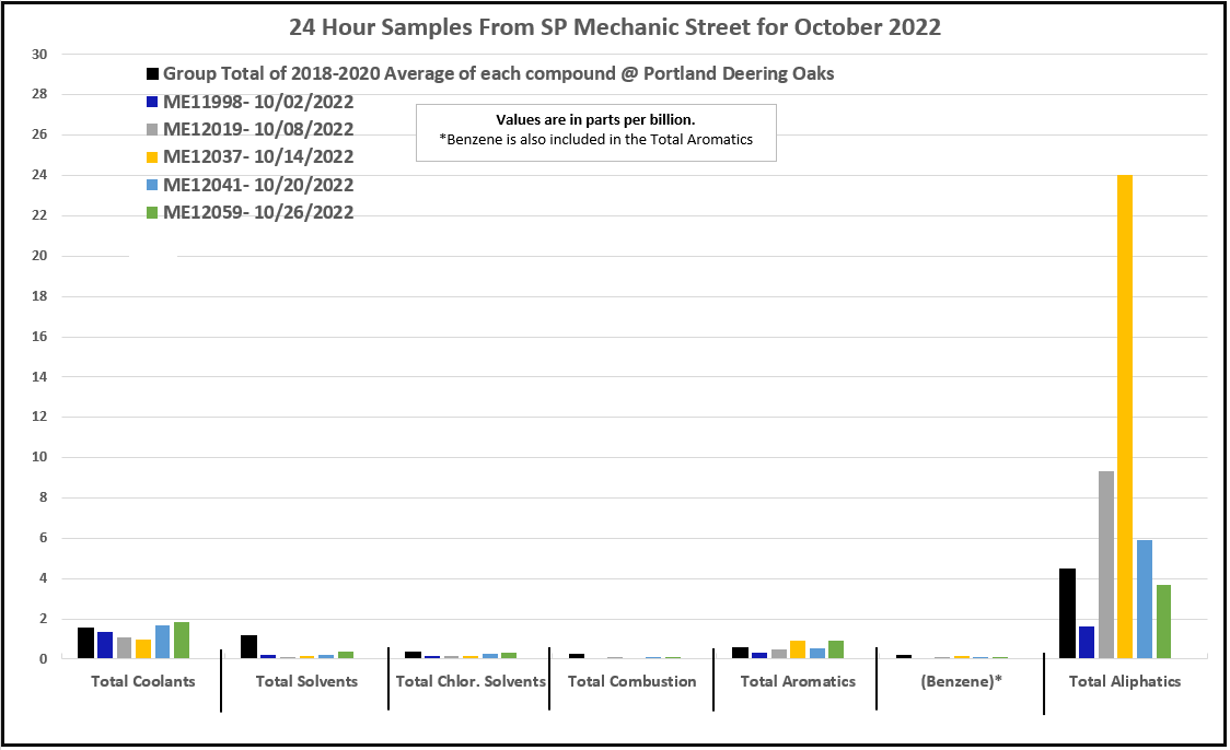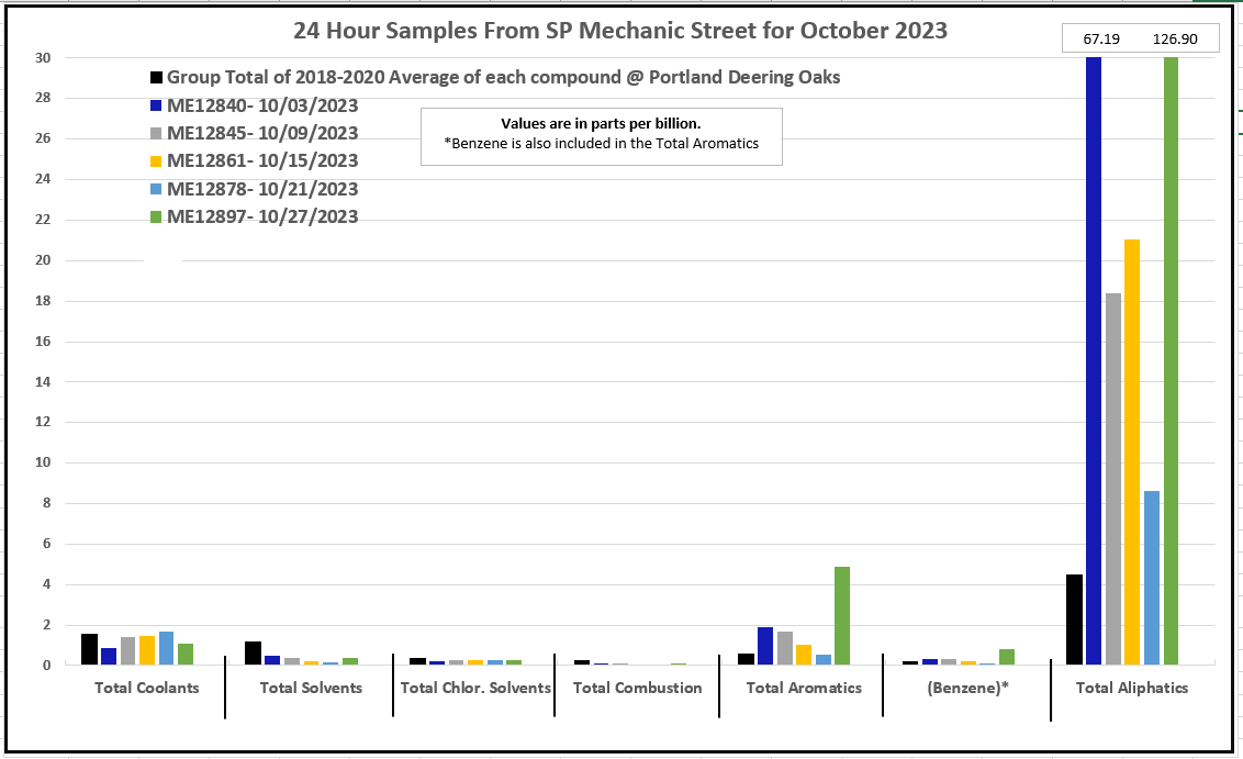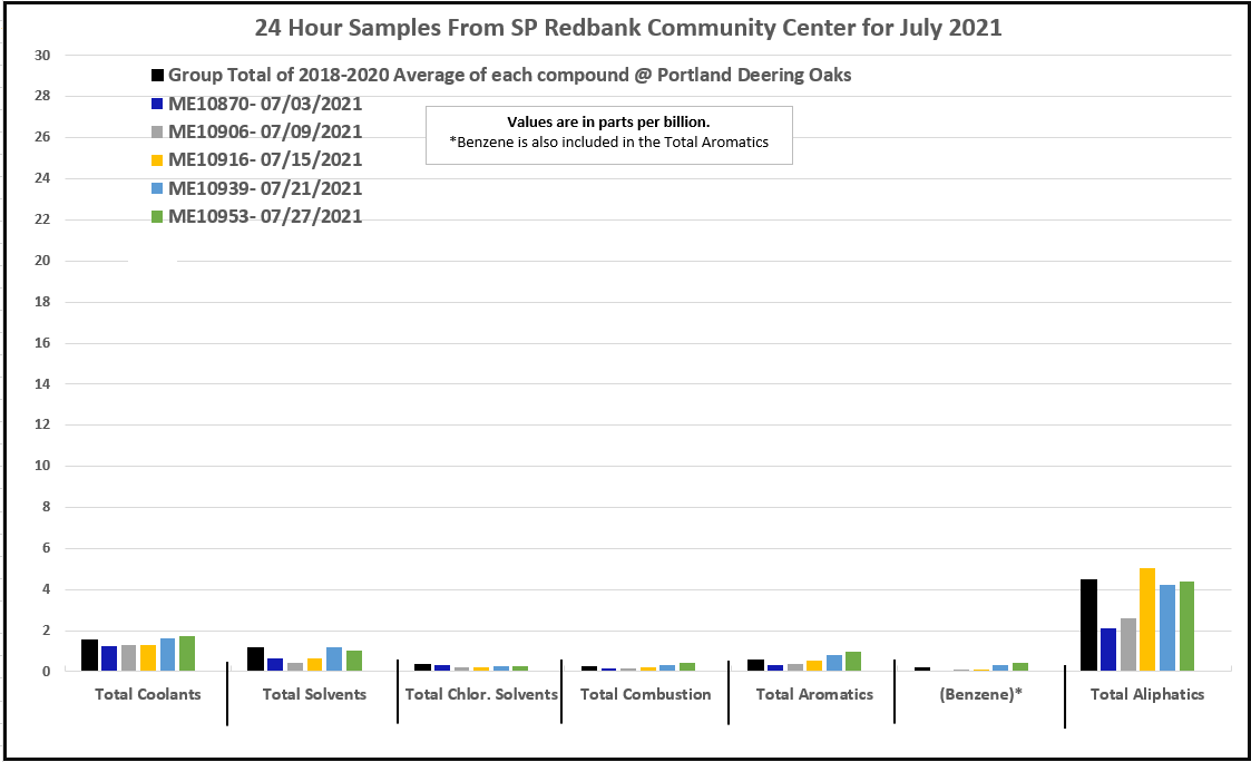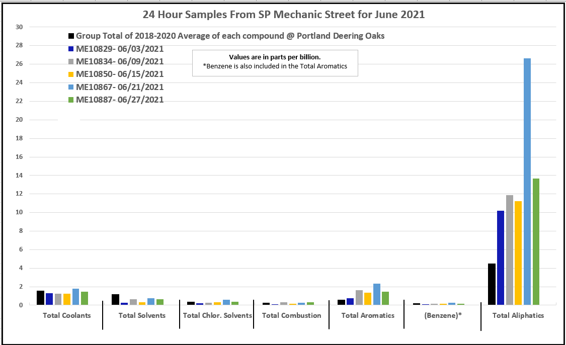 CAUTION to grab sampling data users: It is not appropriate to use grab sample data for any comparison to longer term average (e.g. annual) levels, guidelines or standards for health assessment purposes. Staff from the Maine Center for Disease Control (CDC) gave a presentation (PDF) to the South Portland City Council on November 26, 2019 that describes and illustrates their approach to interpreting this data from a health perspective. The grab sample data charts we’ve created here are intended to simply be a visualization of each sample’s results from an air quality perspective, comparing them to the 2018 annual averages from our Portland Deering Oaks site, which for this purpose are being used as reference or background concentrations for the area.