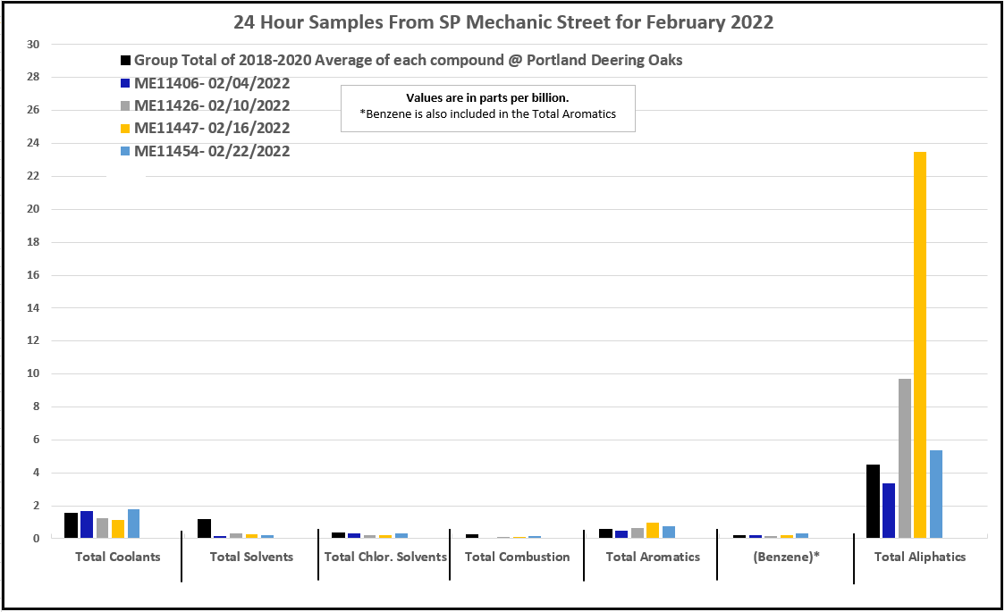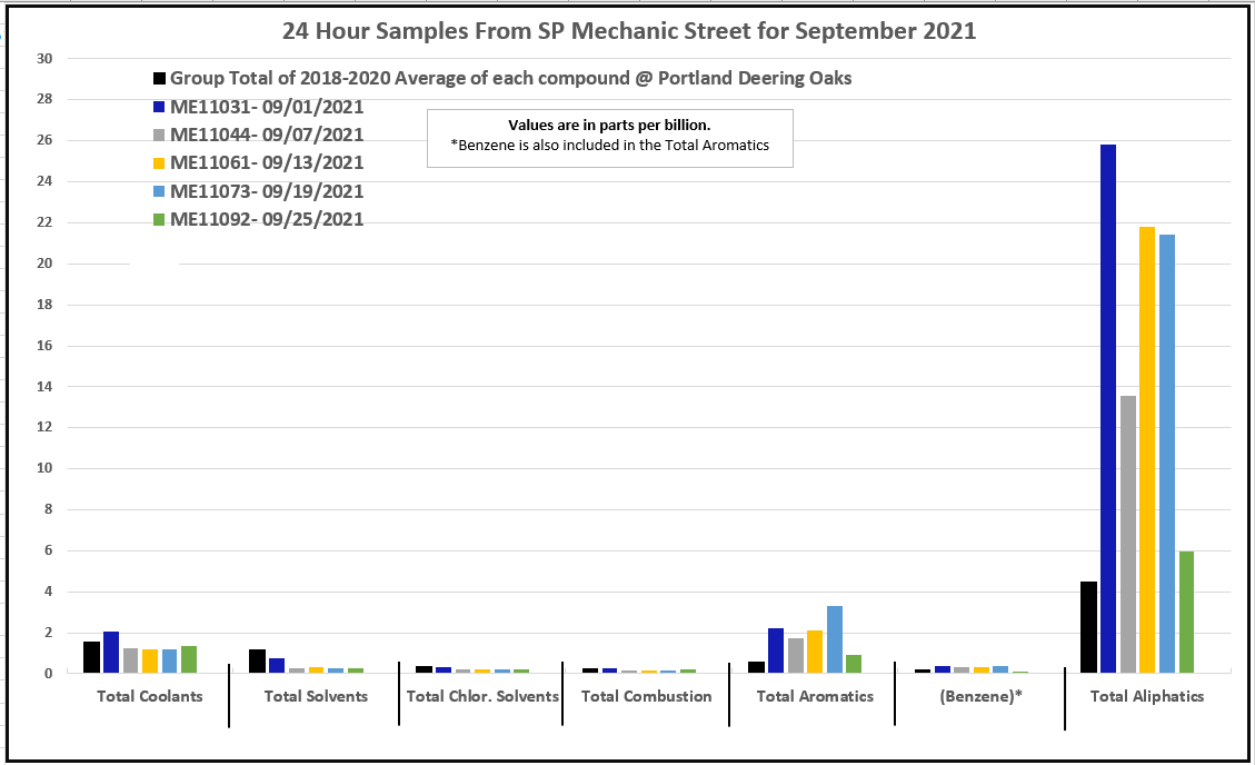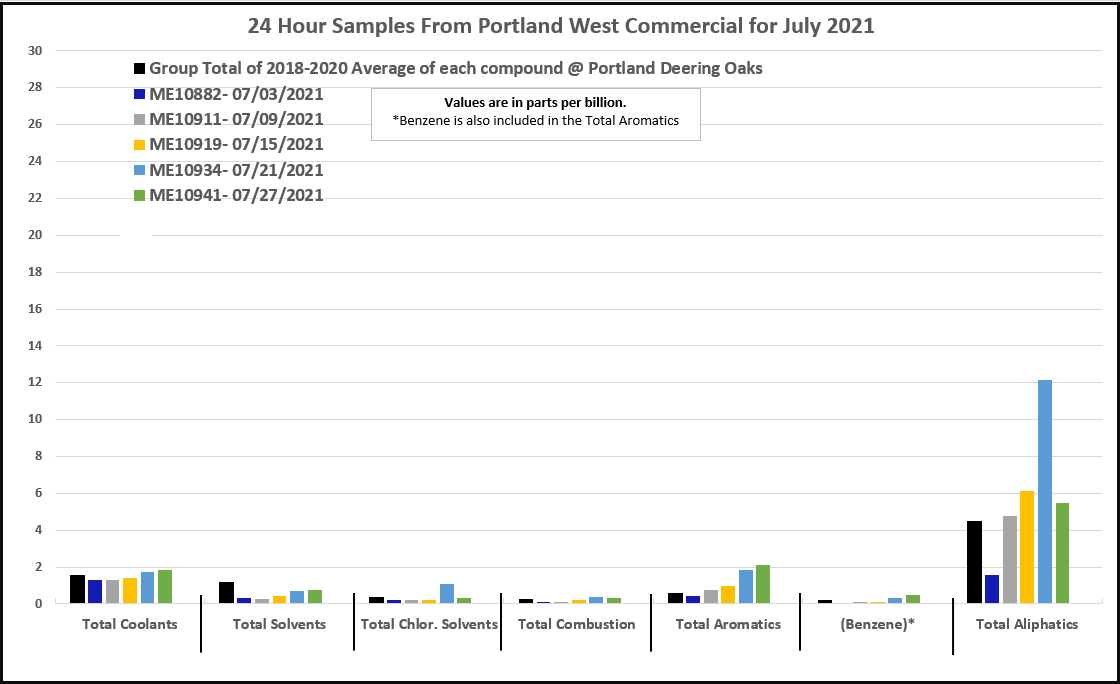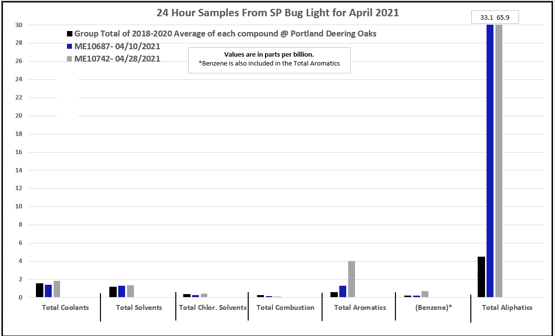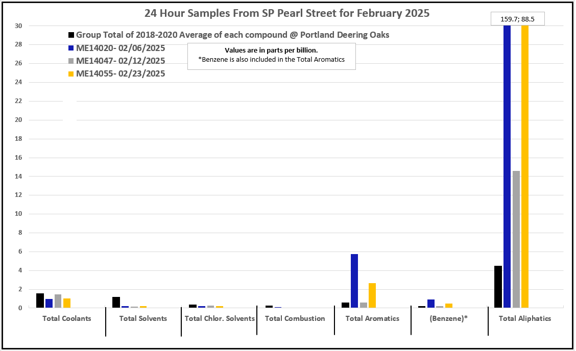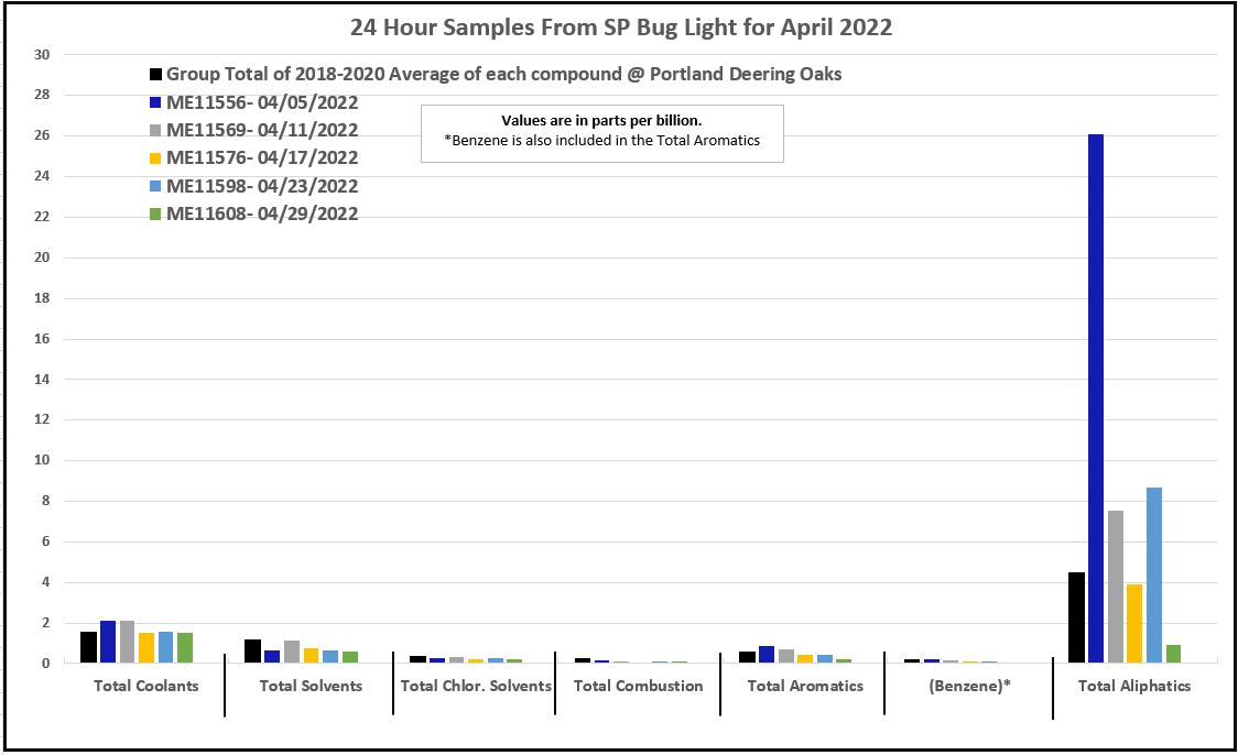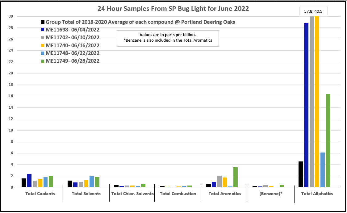 CAUTION to grab sampling data users: It is not appropriate to use grab sample data for any comparison to longer term average (e.g. annual) levels, guidelines or standards for health assessment purposes. Staff from the Maine Center for Disease Control (CDC) gave a presentation (PDF) to the South Portland City Council on November 26, 2019 that describes and illustrates their approach to interpreting this data from a health perspective. The grab sample data charts we’ve created here are intended to simply be a visualization of each sample’s results from an air quality perspective, comparing them to the 2018 annual averages from our Portland Deering Oaks site, which for this purpose are being used as reference or background concentrations for the area.