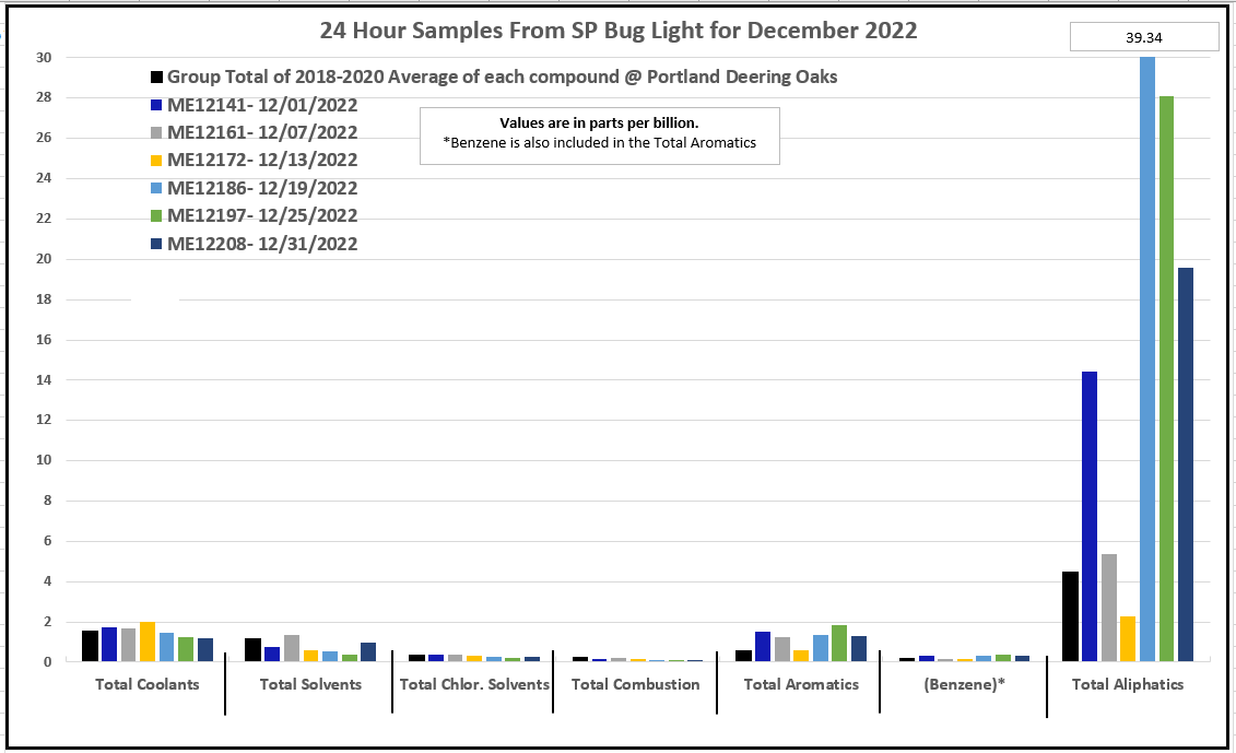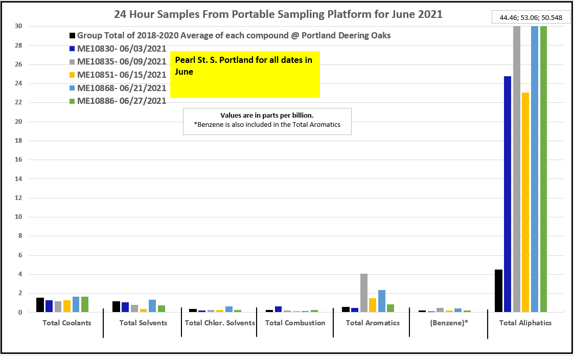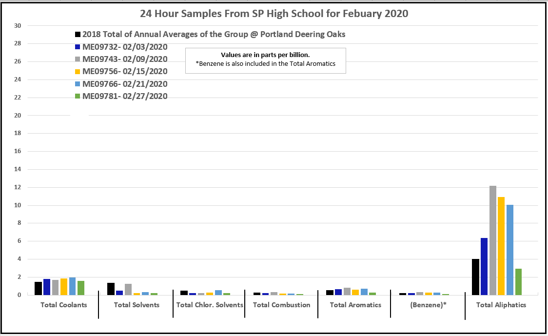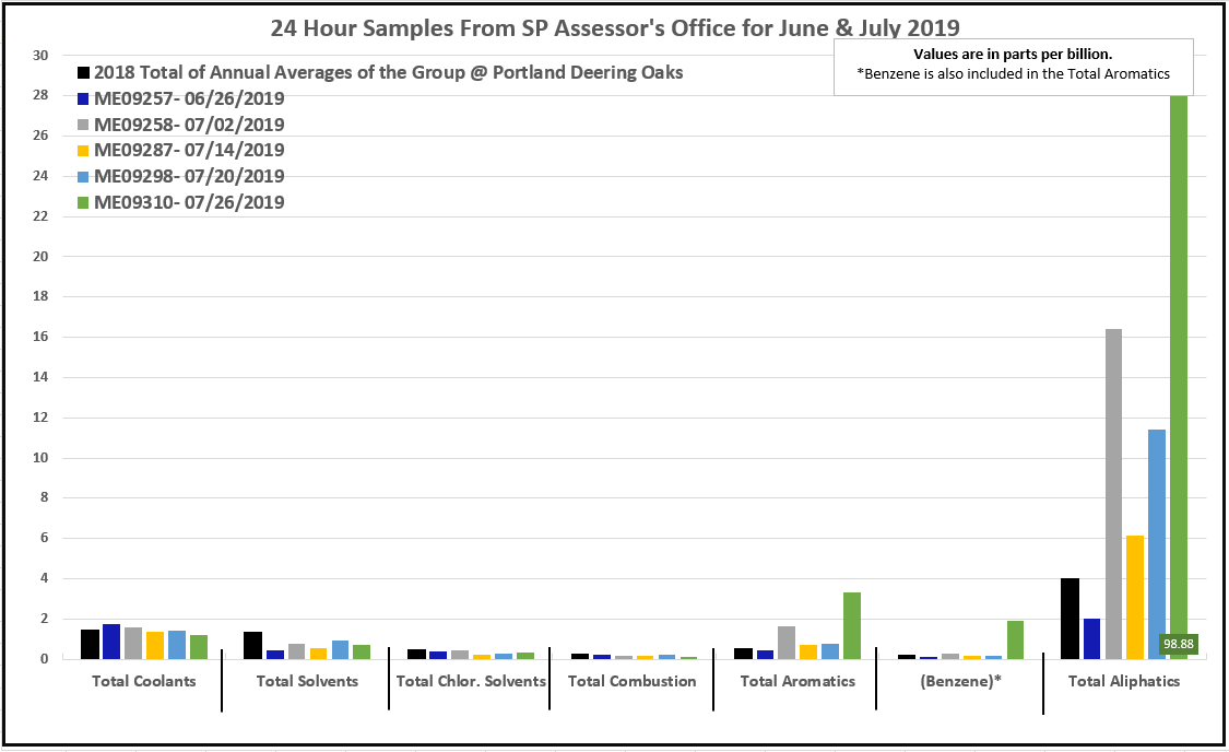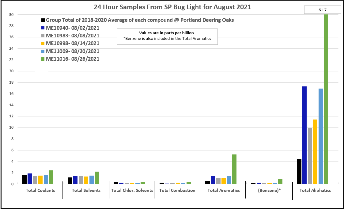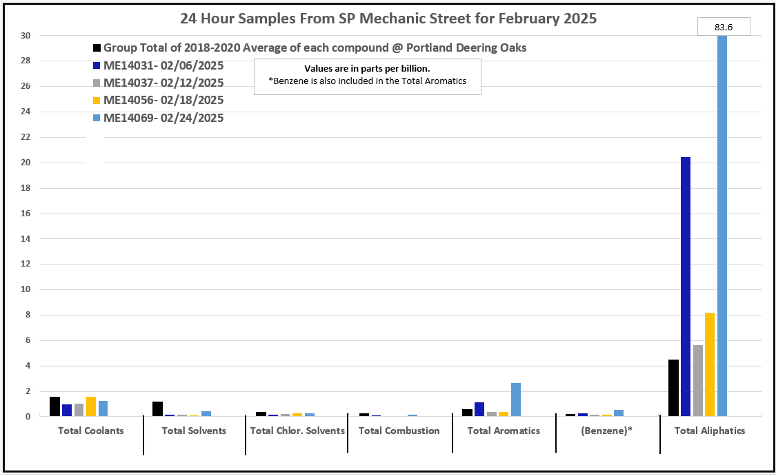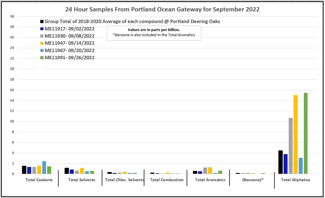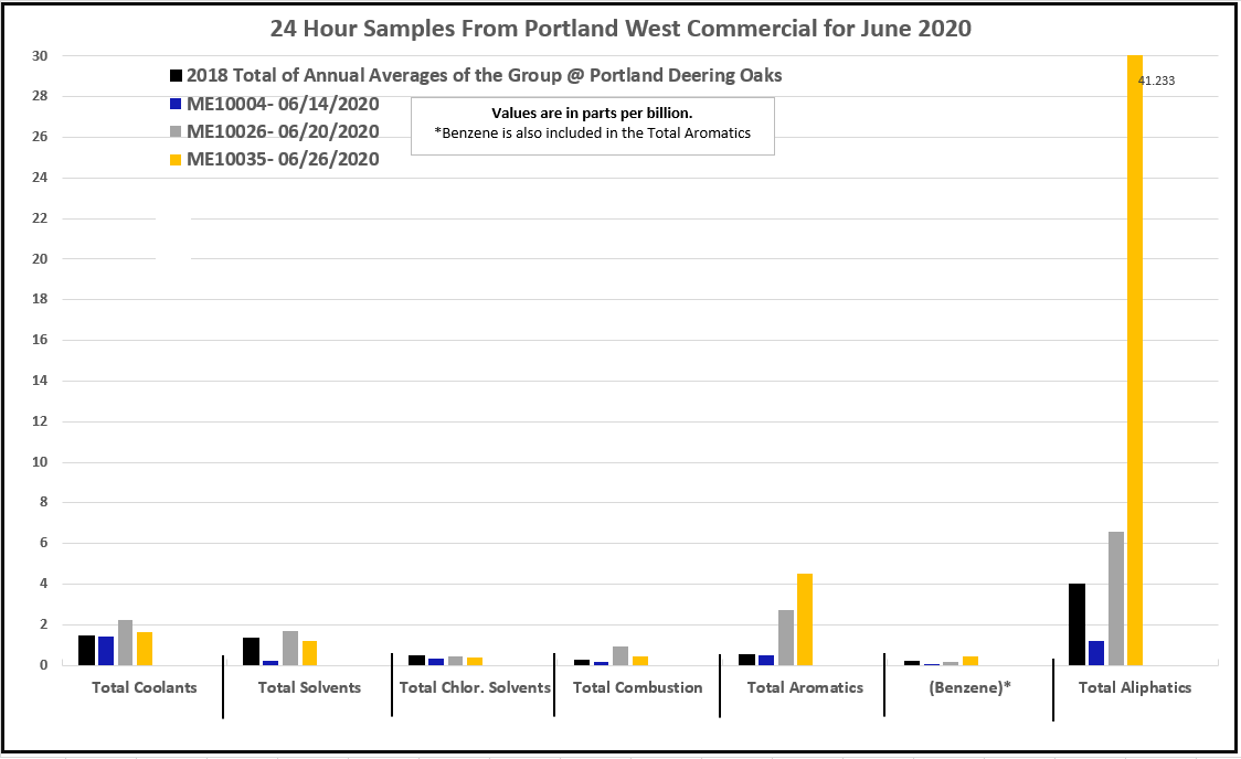 CAUTION to grab sampling data users: It is not appropriate to use grab sample data for any comparison to longer term average (e.g. annual) levels, guidelines or standards for health assessment purposes. Staff from the Maine Center for Disease Control (CDC) gave a presentation (PDF) to the South Portland City Council on November 26, 2019 that describes and illustrates their approach to interpreting this data from a health perspective. The grab sample data charts we’ve created here are intended to simply be a visualization of each sample’s results from an air quality perspective, comparing them to the 2018 annual averages from our Portland Deering Oaks site, which for this purpose are being used as reference or background concentrations for the area.