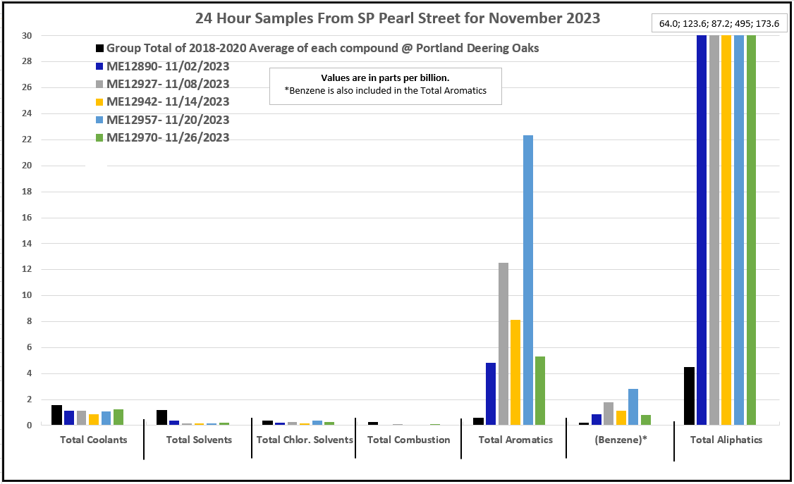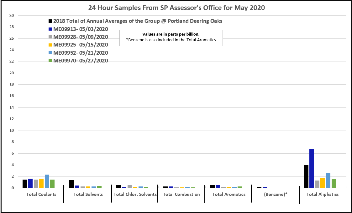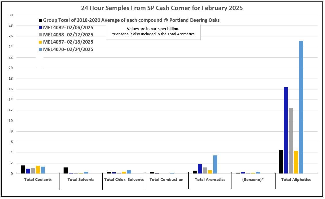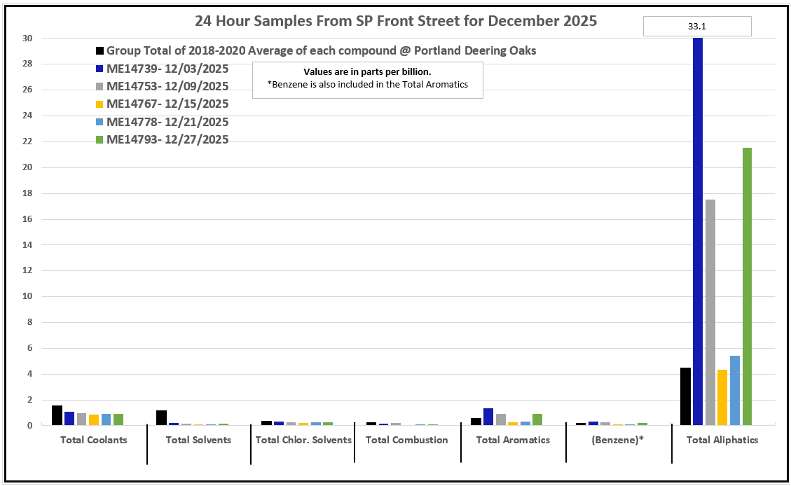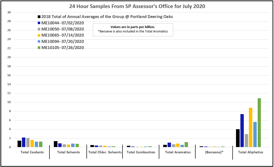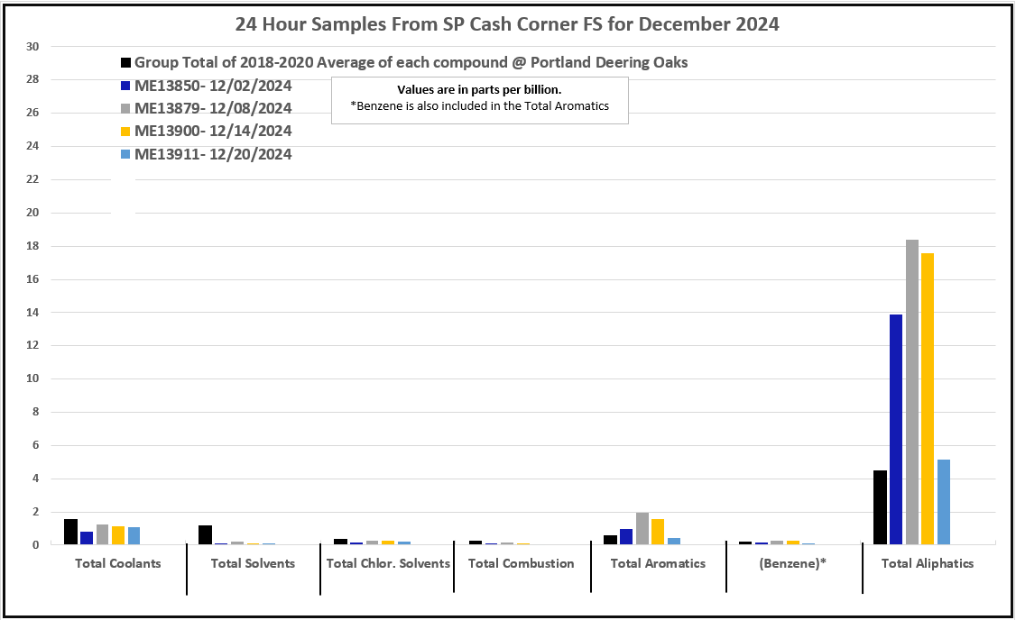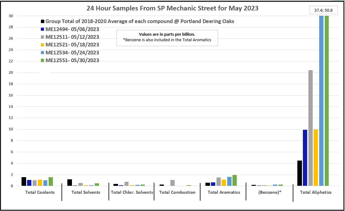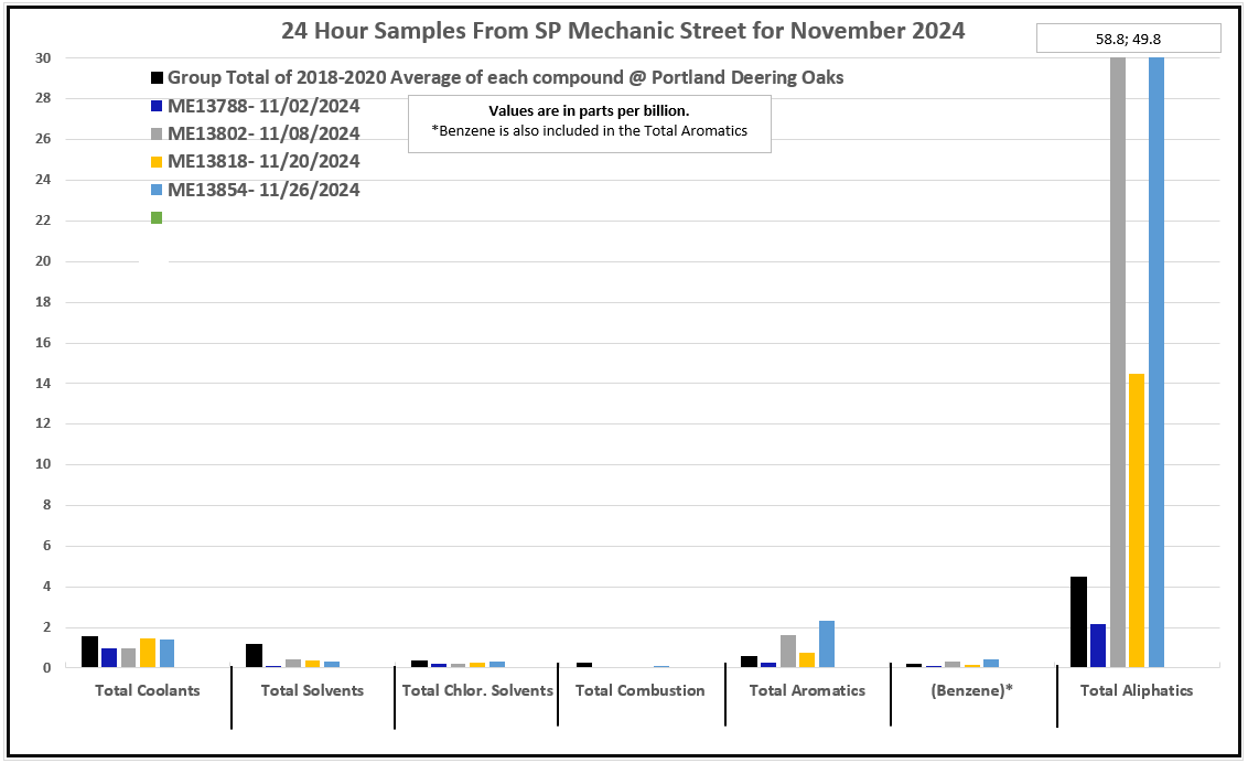 CAUTION to grab sampling data users: It is not appropriate to use grab sample data for any comparison to longer term average (e.g. annual) levels, guidelines or standards for health assessment purposes. Staff from the Maine Center for Disease Control (CDC) gave a presentation (PDF) to the South Portland City Council on November 26, 2019 that describes and illustrates their approach to interpreting this data from a health perspective. The grab sample data charts we’ve created here are intended to simply be a visualization of each sample’s results from an air quality perspective, comparing them to the 2018 annual averages from our Portland Deering Oaks site, which for this purpose are being used as reference or background concentrations for the area.