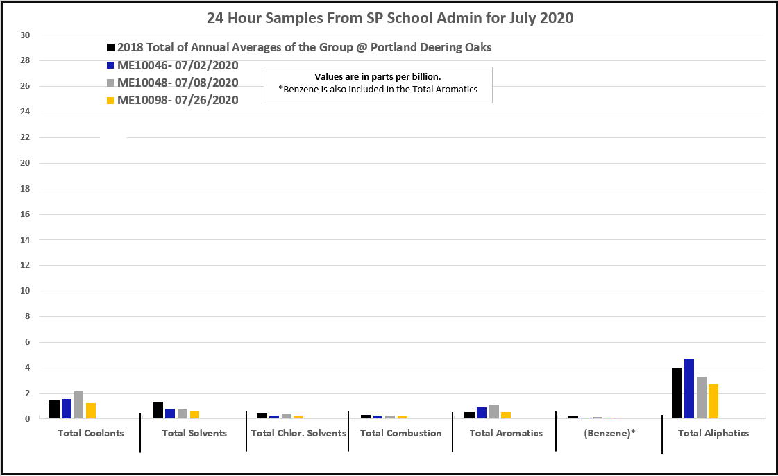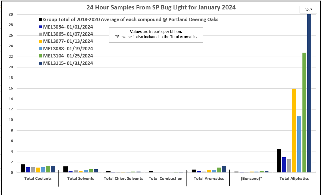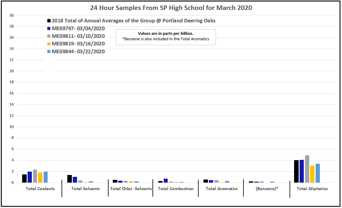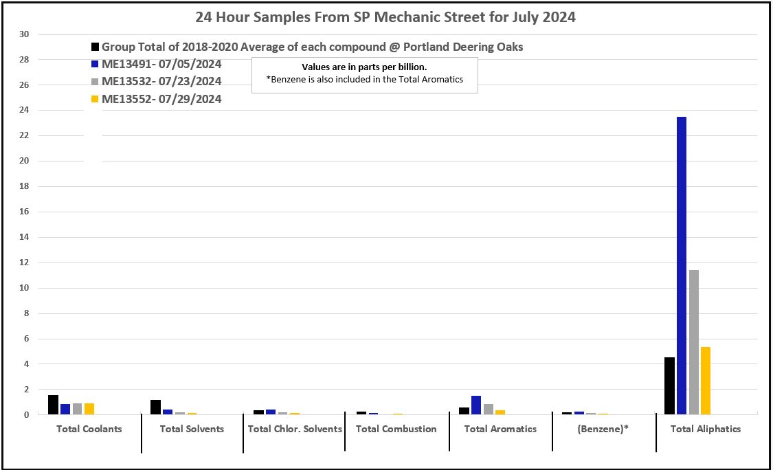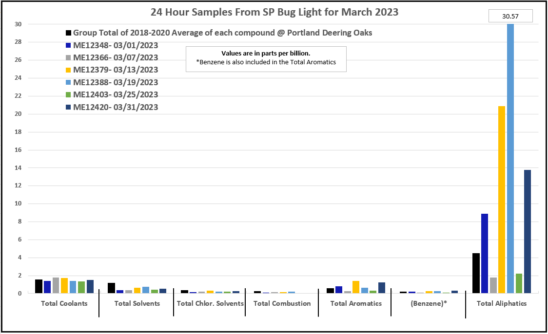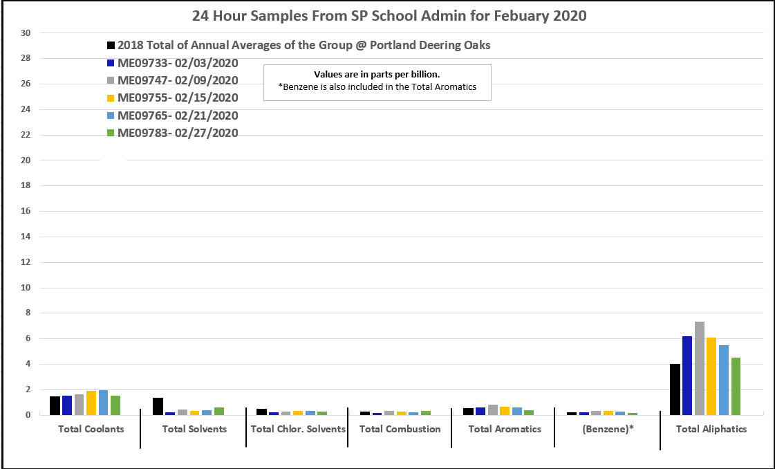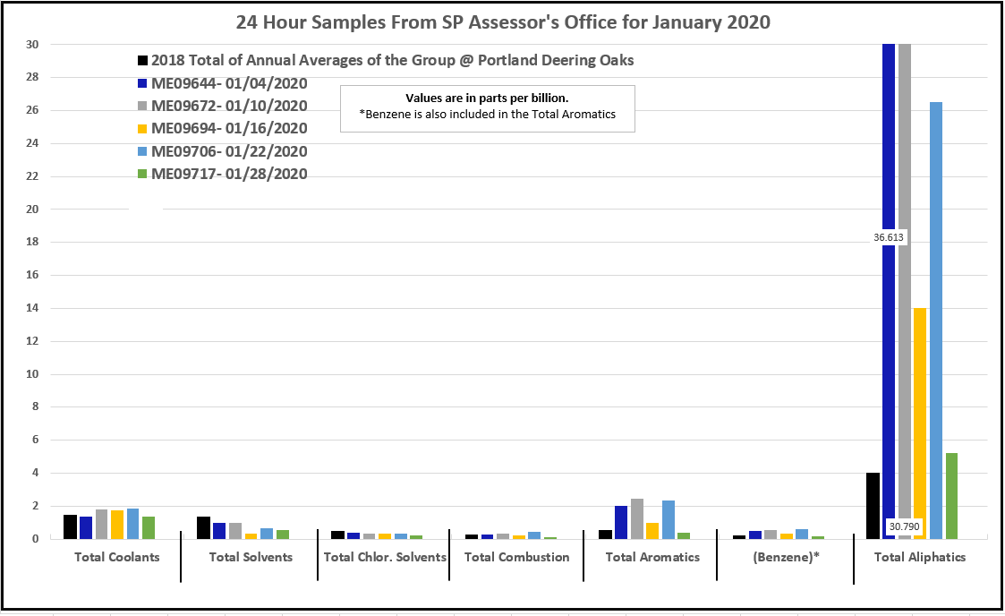 CAUTION to grab sampling data users: It is not appropriate to use grab sample data for any comparison to longer term average (e.g. annual) levels, guidelines or standards for health assessment purposes. Staff from the Maine Center for Disease Control (CDC) gave a presentation (PDF) to the South Portland City Council on November 26, 2019 that describes and illustrates their approach to interpreting this data from a health perspective. The grab sample data charts we’ve created here are intended to simply be a visualization of each sample’s results from an air quality perspective, comparing them to the 2018 annual averages from our Portland Deering Oaks site, which for this purpose are being used as reference or background concentrations for the area.