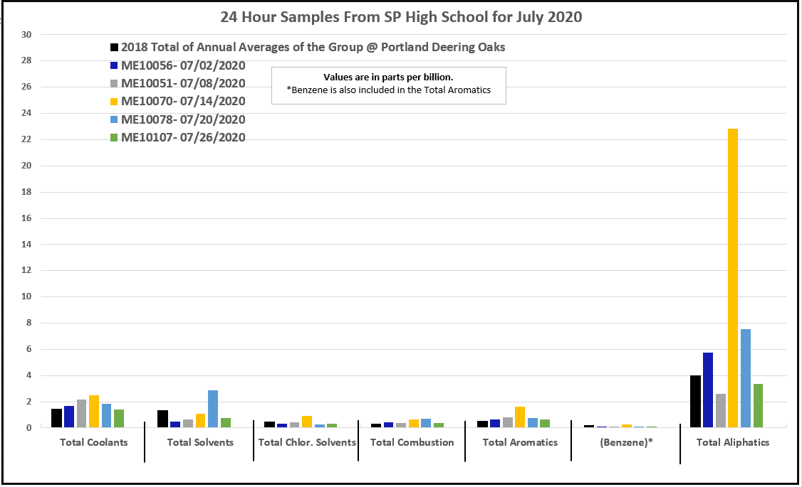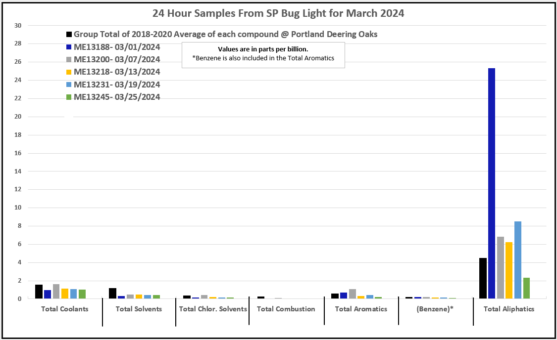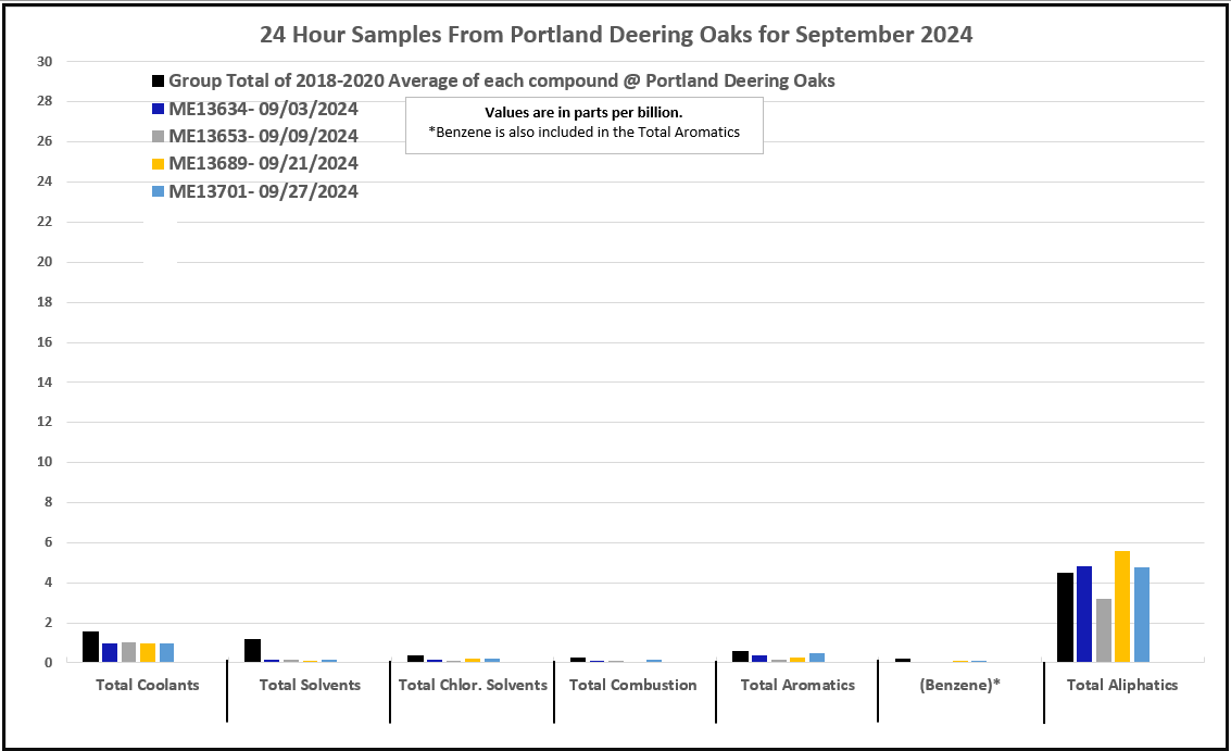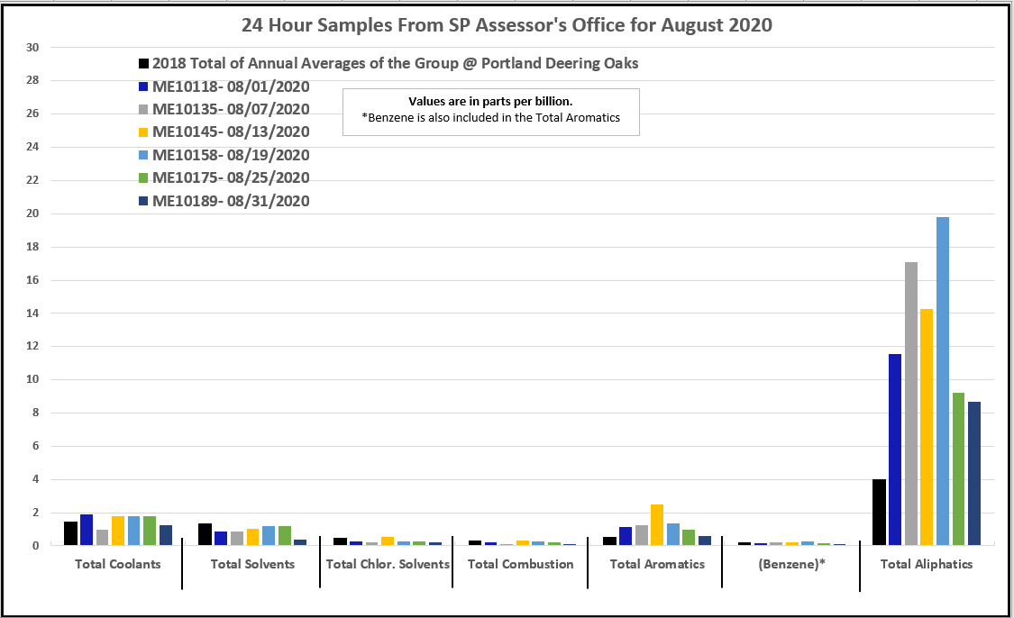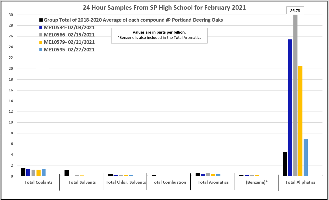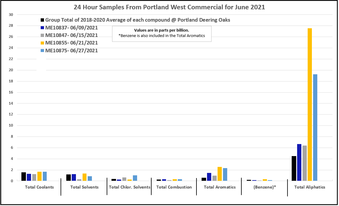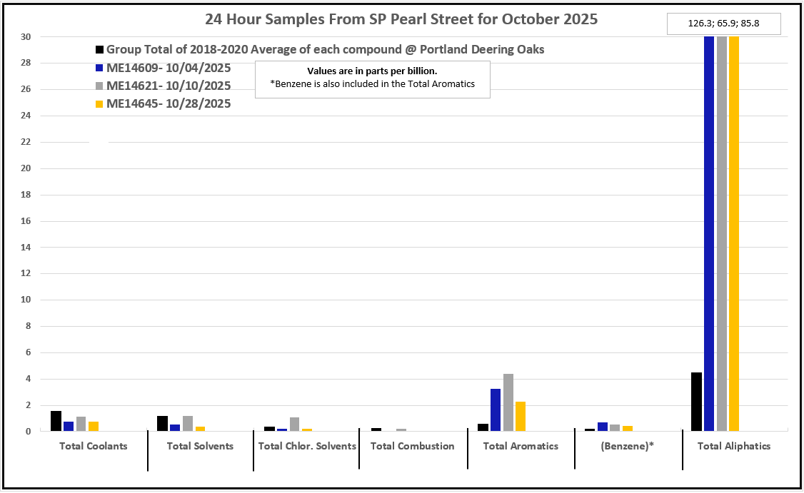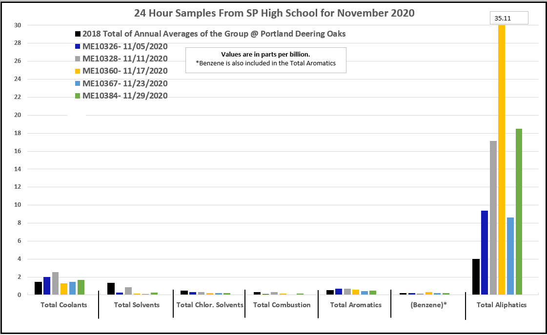 CAUTION to grab sampling data users: It is not appropriate to use grab sample data for any comparison to longer term average (e.g. annual) levels, guidelines or standards for health assessment purposes. Staff from the Maine Center for Disease Control (CDC) gave a presentation (PDF) to the South Portland City Council on November 26, 2019 that describes and illustrates their approach to interpreting this data from a health perspective. The grab sample data charts we’ve created here are intended to simply be a visualization of each sample’s results from an air quality perspective, comparing them to the 2018 annual averages from our Portland Deering Oaks site, which for this purpose are being used as reference or background concentrations for the area.
