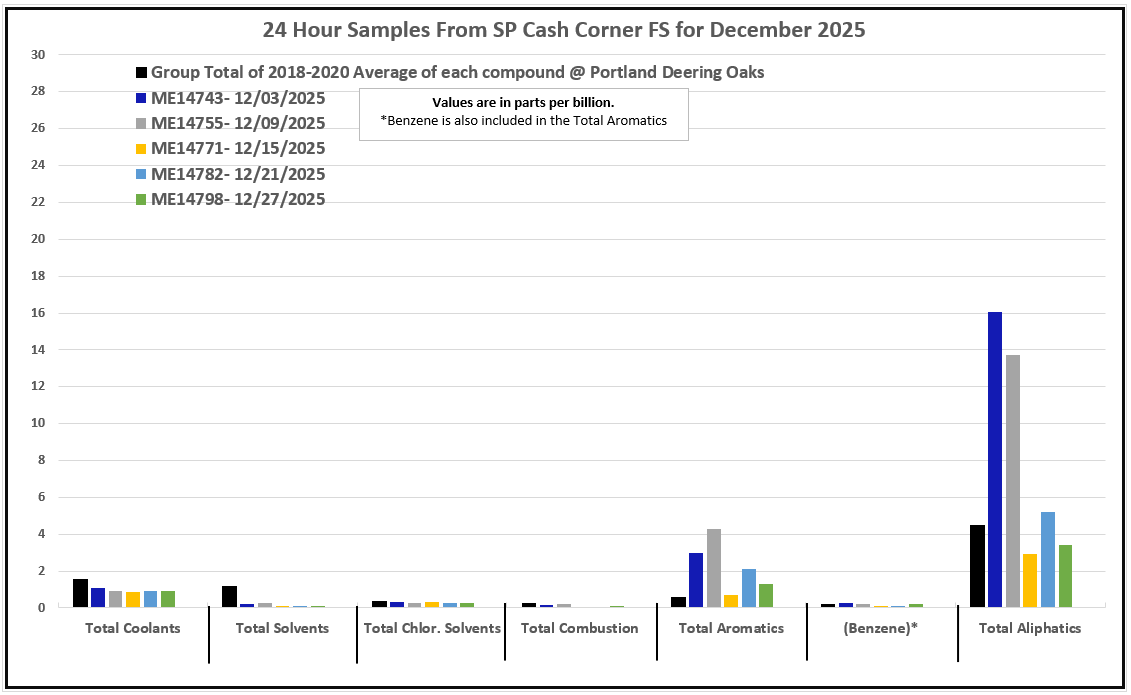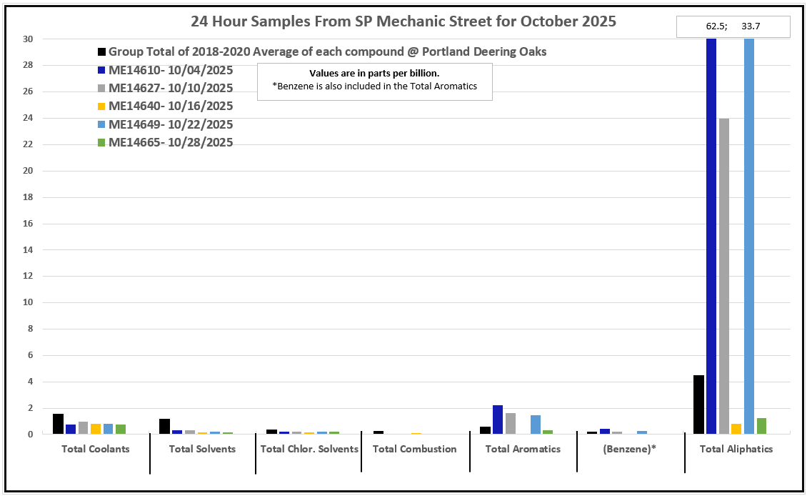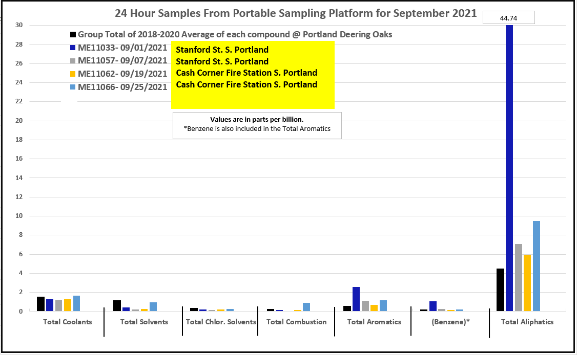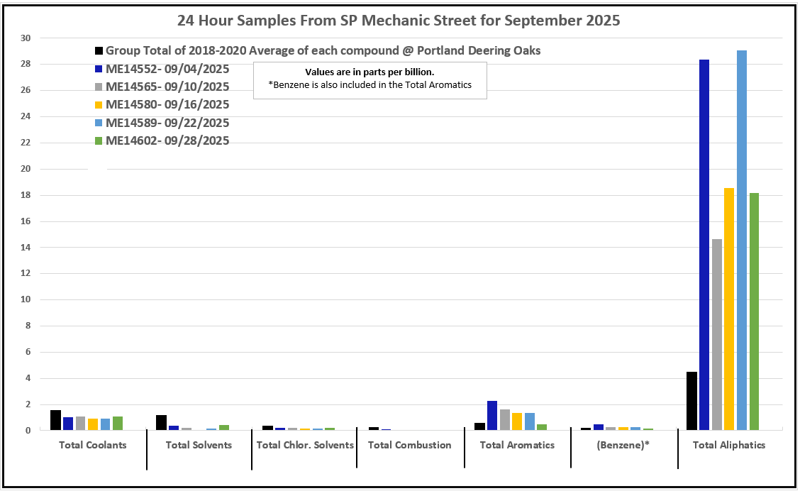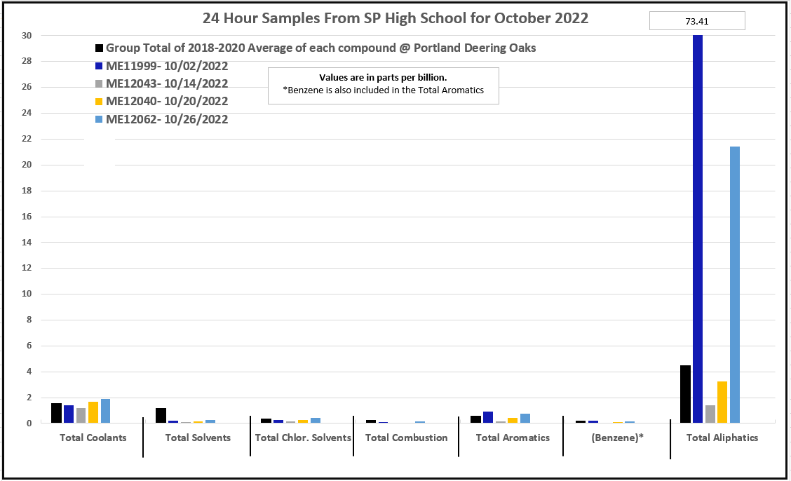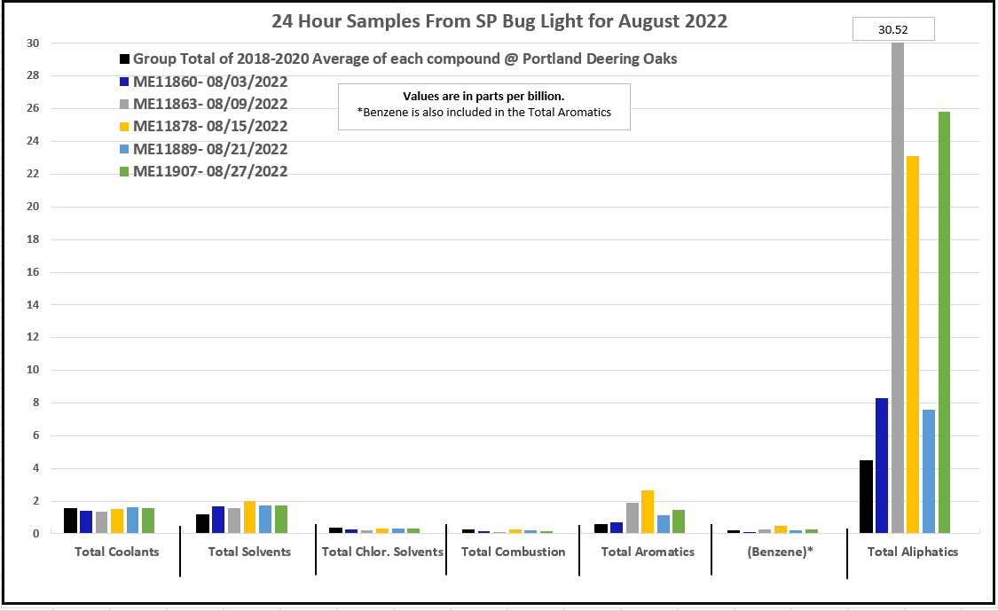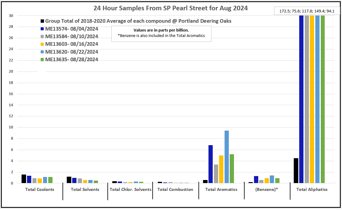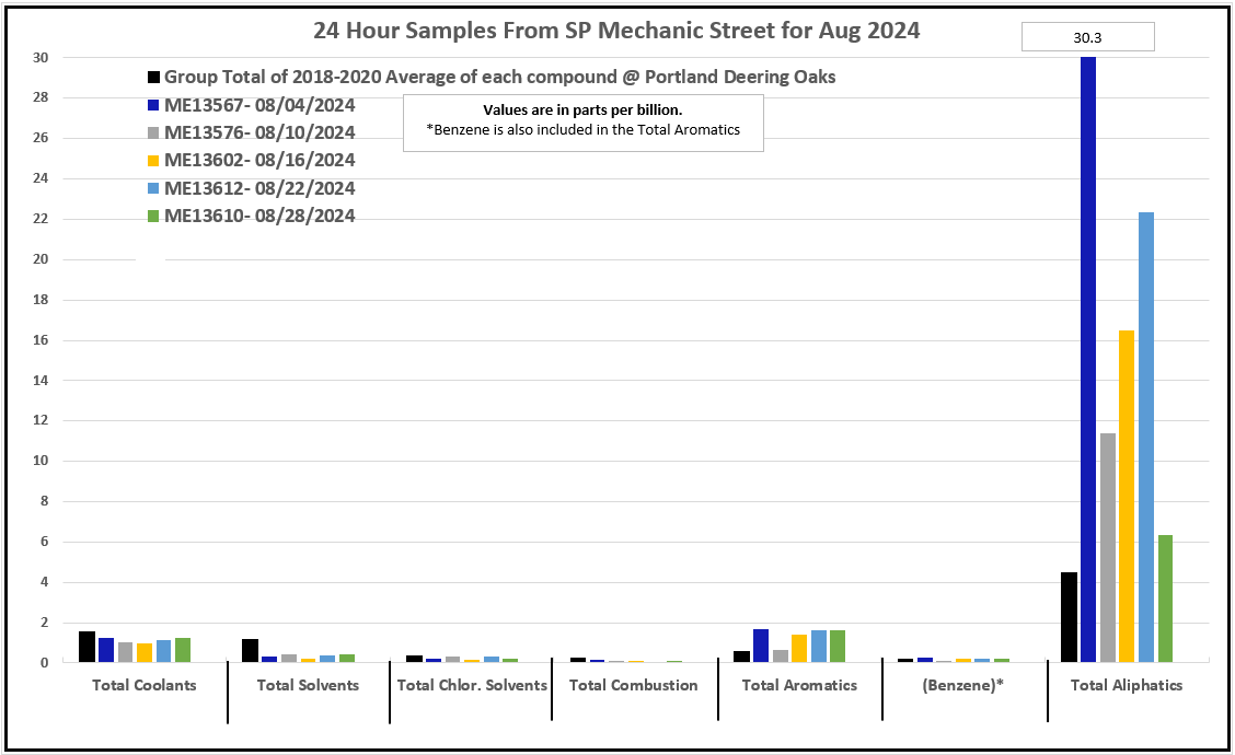 CAUTION to grab sampling data users: It is not appropriate to use grab sample data for any comparison to longer term average (e.g. annual) levels, guidelines or standards for health assessment purposes. Staff from the Maine Center for Disease Control (CDC) gave a presentation (PDF) to the South Portland City Council on November 26, 2019 that describes and illustrates their approach to interpreting this data from a health perspective. The grab sample data charts we’ve created here are intended to simply be a visualization of each sample’s results from an air quality perspective, comparing them to the 2018 annual averages from our Portland Deering Oaks site, which for this purpose are being used as reference or background concentrations for the area.