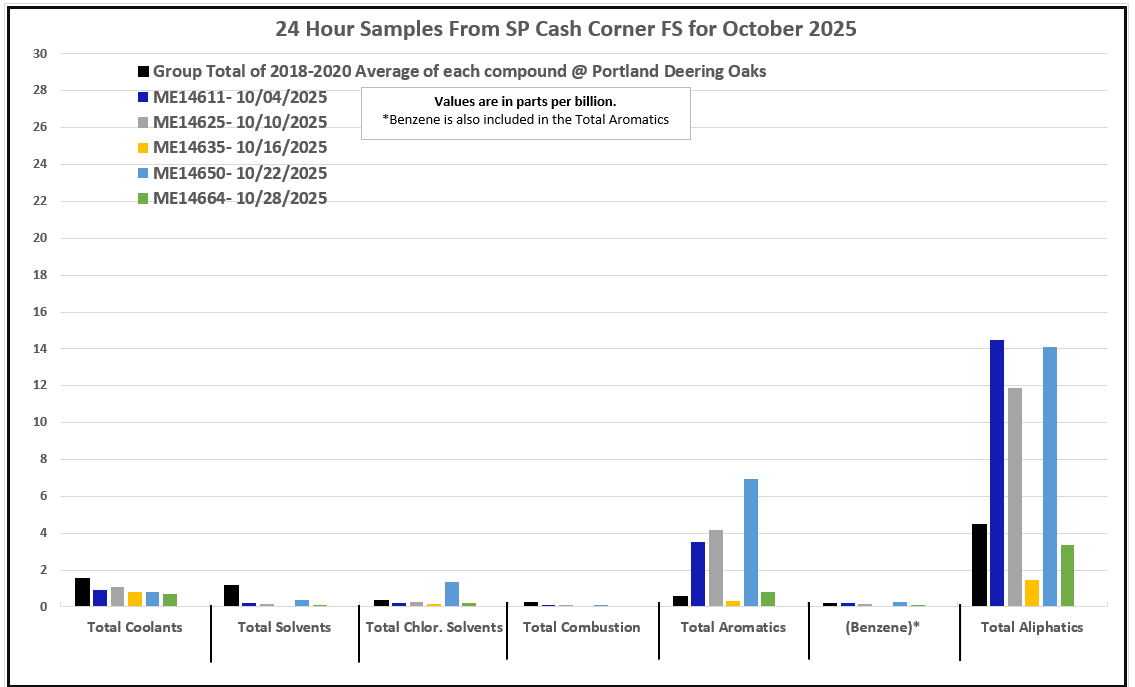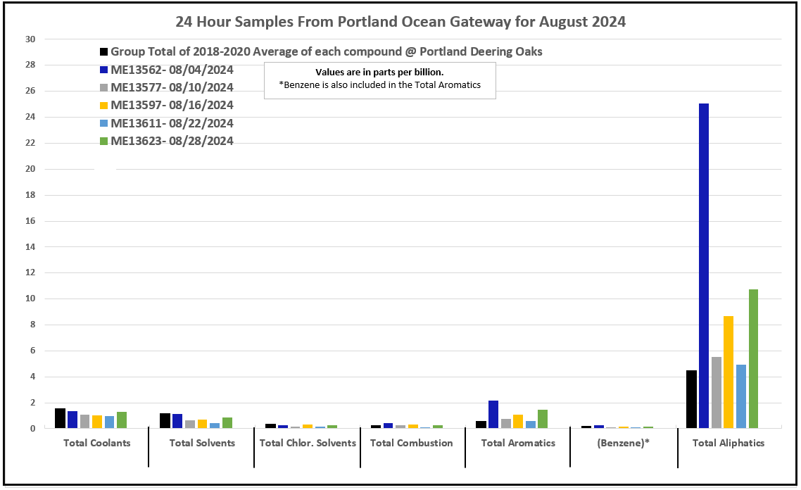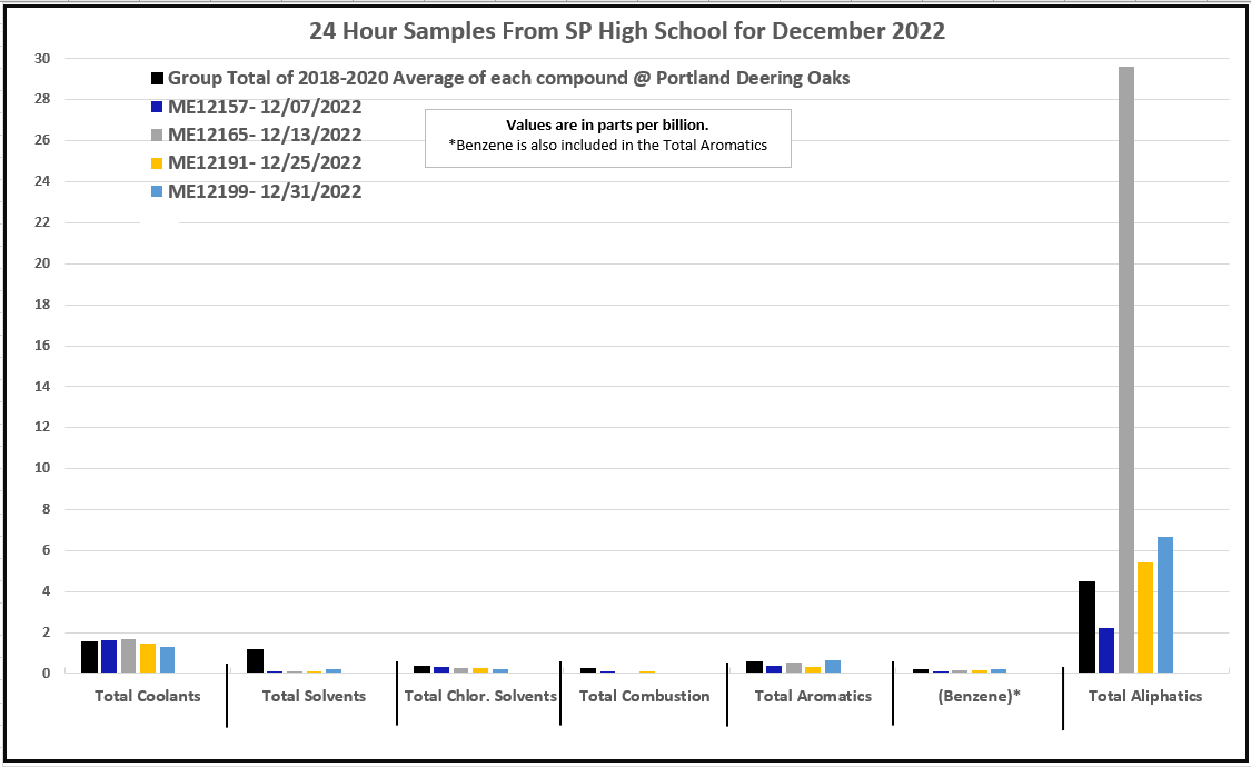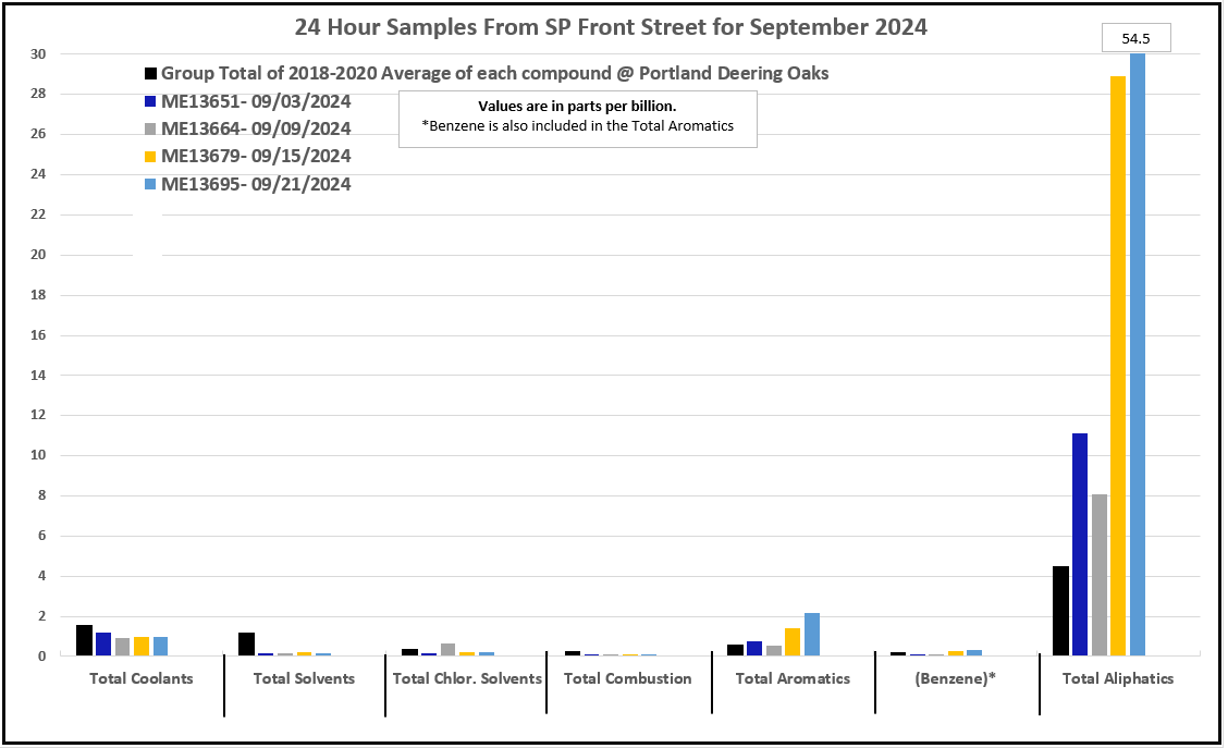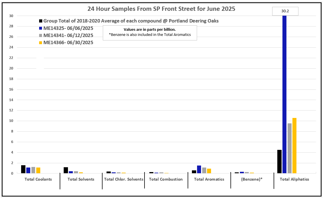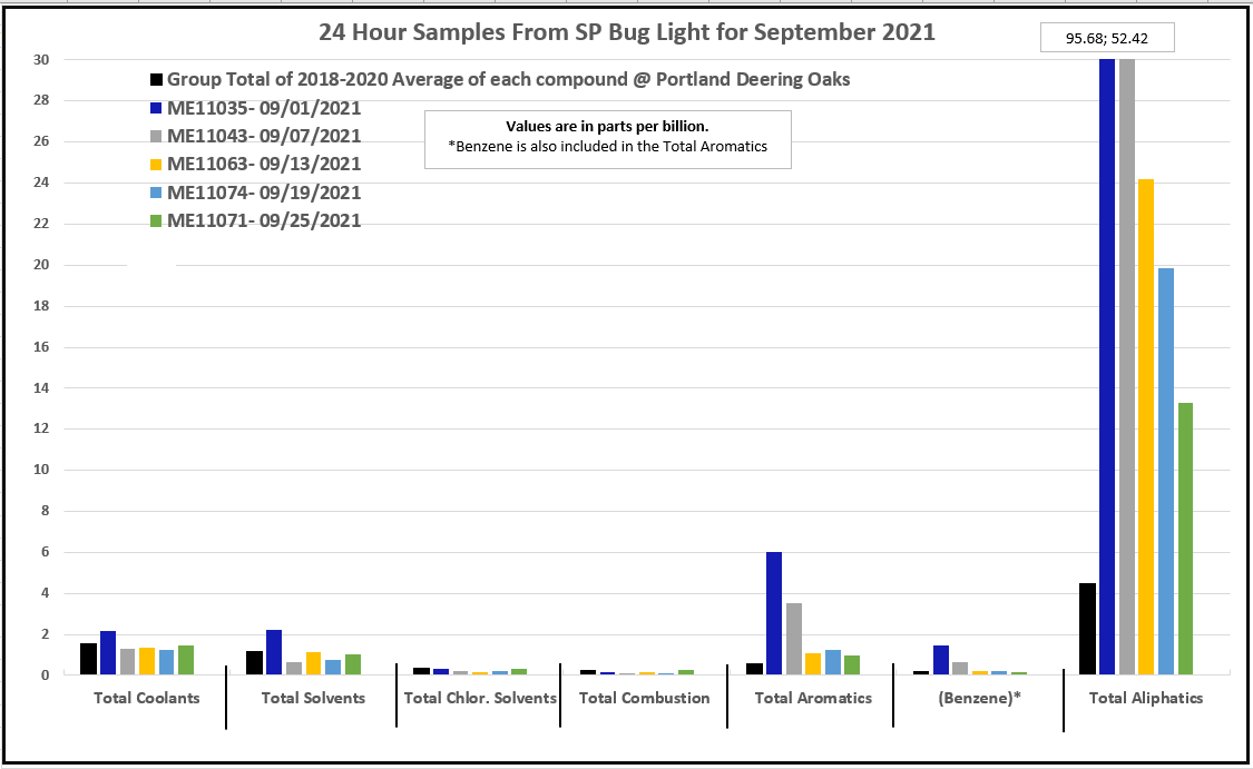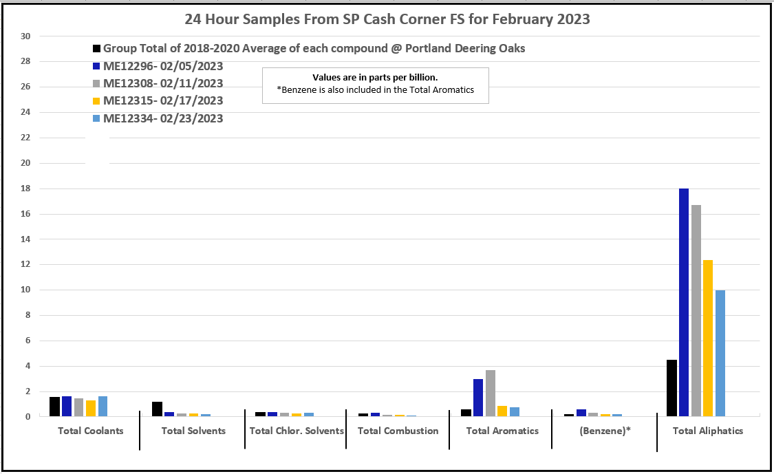 CAUTION to grab sampling data users: It is not appropriate to use grab sample data for any comparison to longer term average (e.g. annual) levels, guidelines or standards for health assessment purposes. Staff from the Maine Center for Disease Control (CDC) gave a presentation (PDF) to the South Portland City Council on November 26, 2019 that describes and illustrates their approach to interpreting this data from a health perspective. The grab sample data charts we’ve created here are intended to simply be a visualization of each sample’s results from an air quality perspective, comparing them to the 2018 annual averages from our Portland Deering Oaks site, which for this purpose are being used as reference or background concentrations for the area.