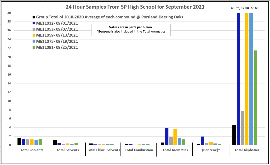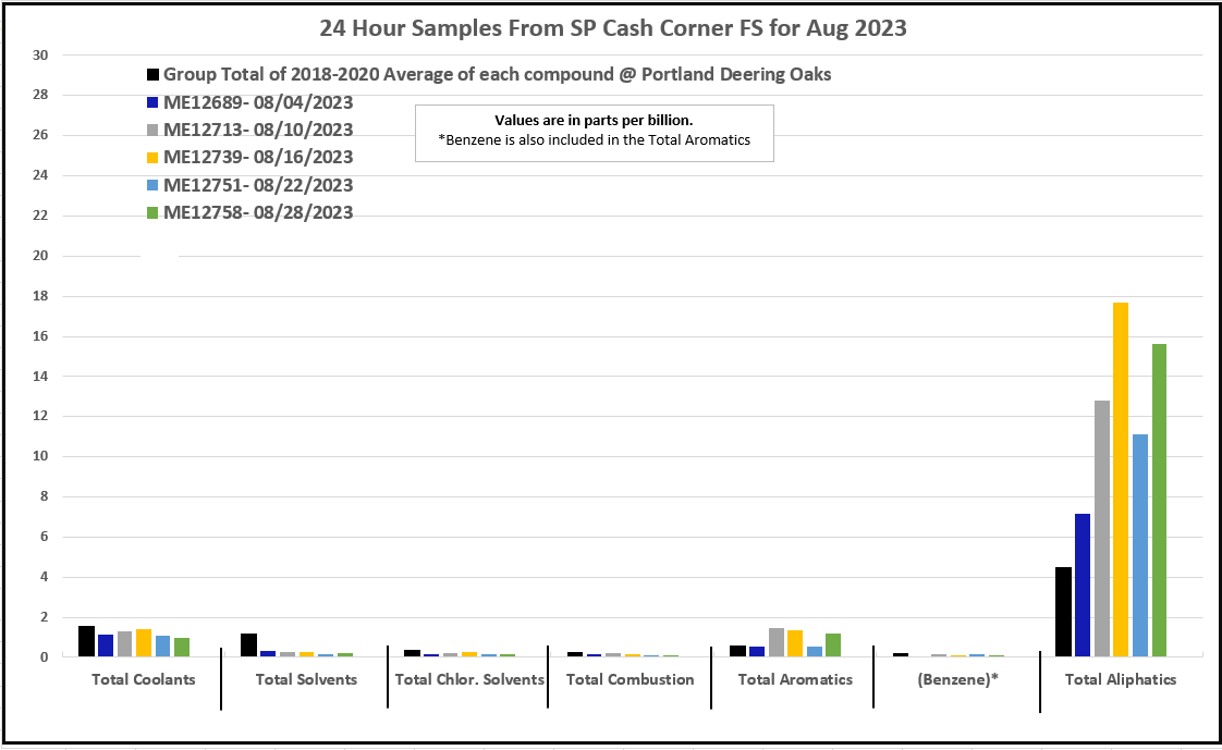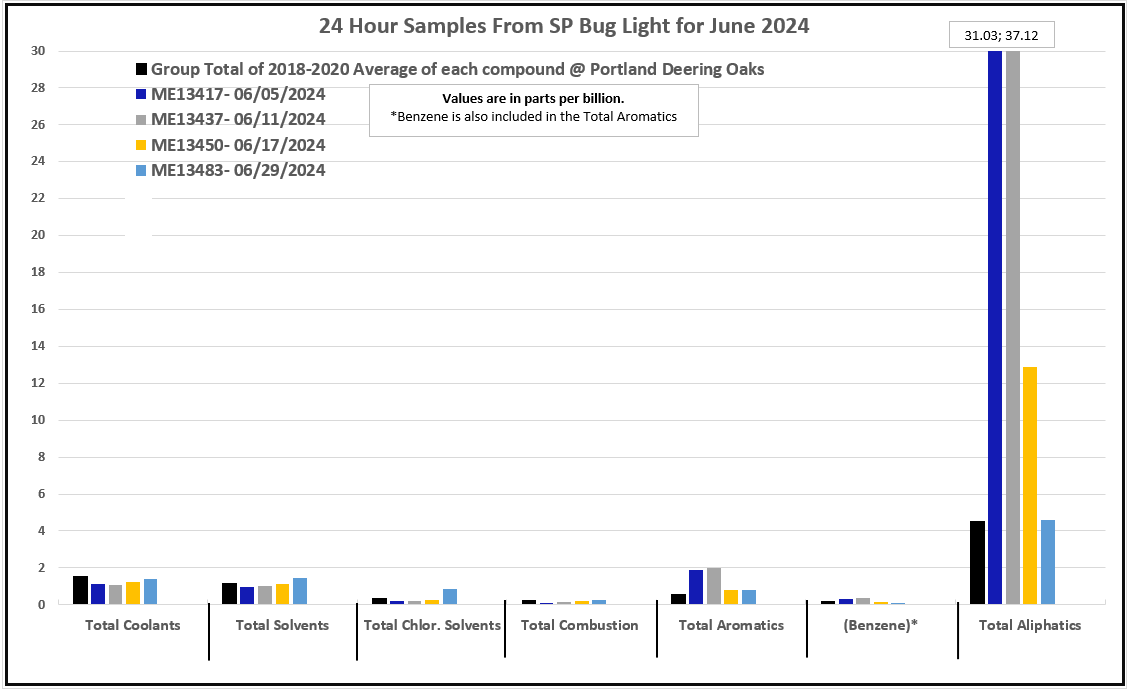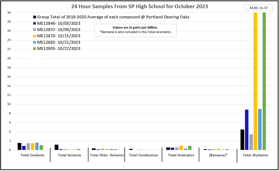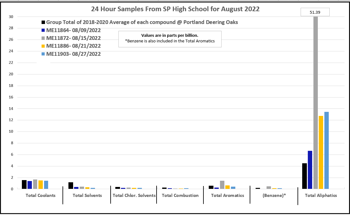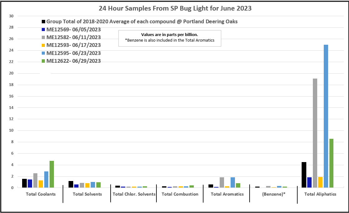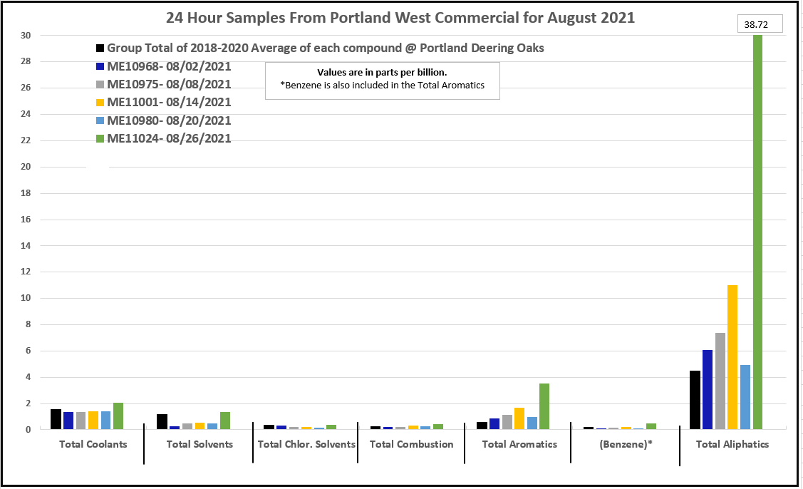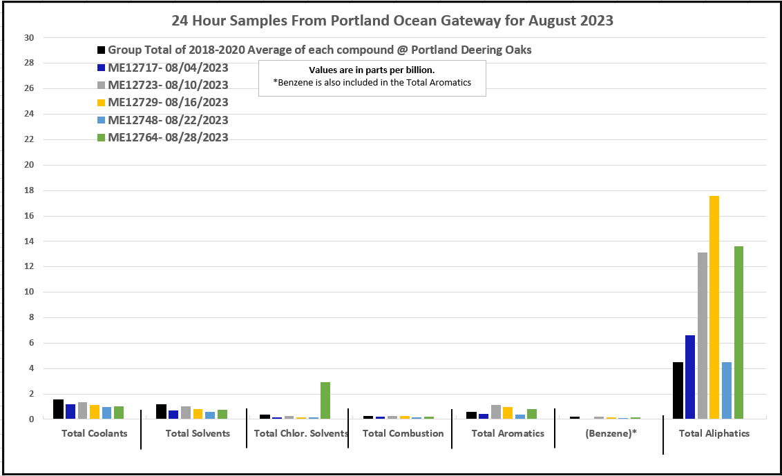 CAUTION to grab sampling data users: It is not appropriate to use grab sample data for any comparison to longer term average (e.g. annual) levels, guidelines or standards for health assessment purposes. Staff from the Maine Center for Disease Control (CDC) gave a presentation (PDF) to the South Portland City Council on November 26, 2019 that describes and illustrates their approach to interpreting this data from a health perspective. The grab sample data charts we’ve created here are intended to simply be a visualization of each sample’s results from an air quality perspective, comparing them to the 2018 annual averages from our Portland Deering Oaks site, which for this purpose are being used as reference or background concentrations for the area.