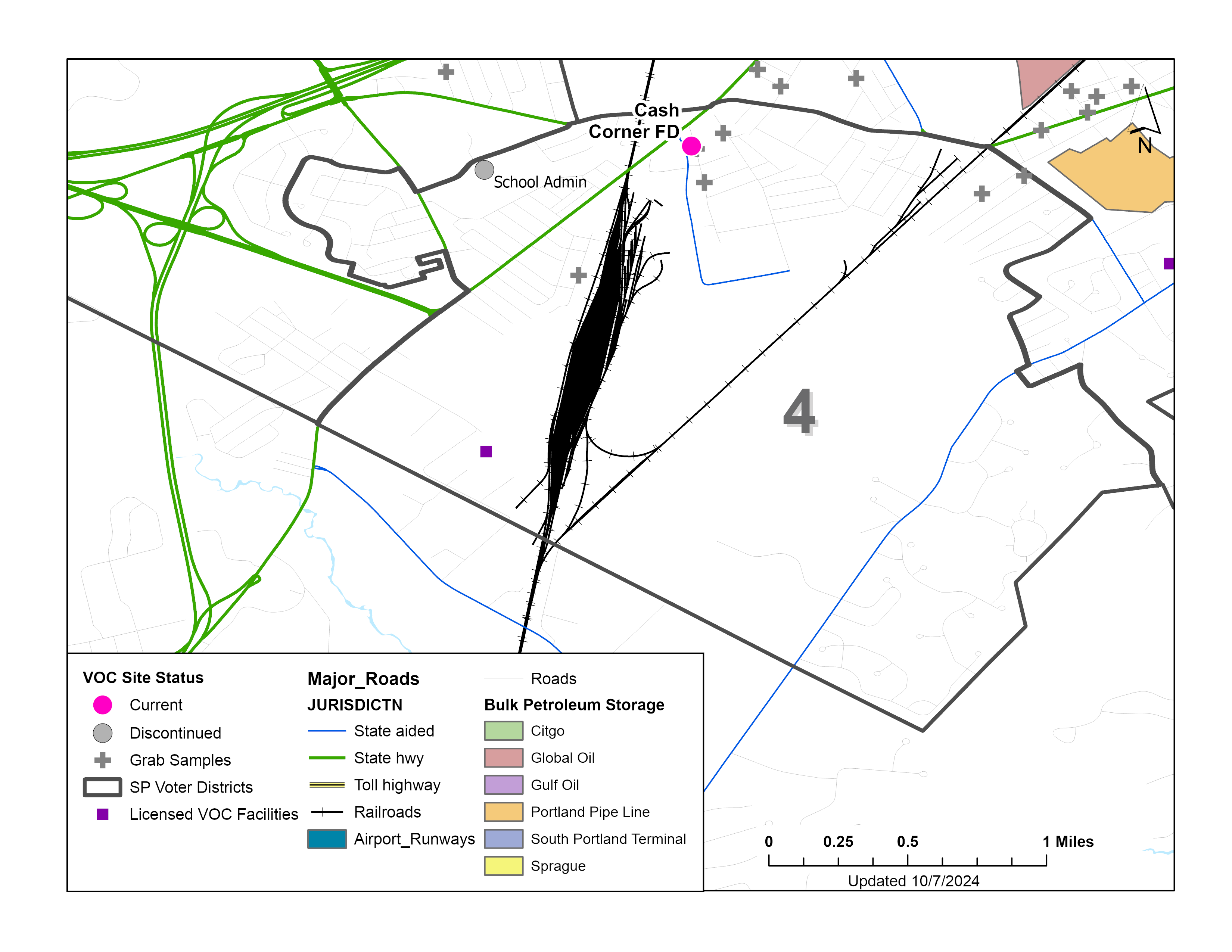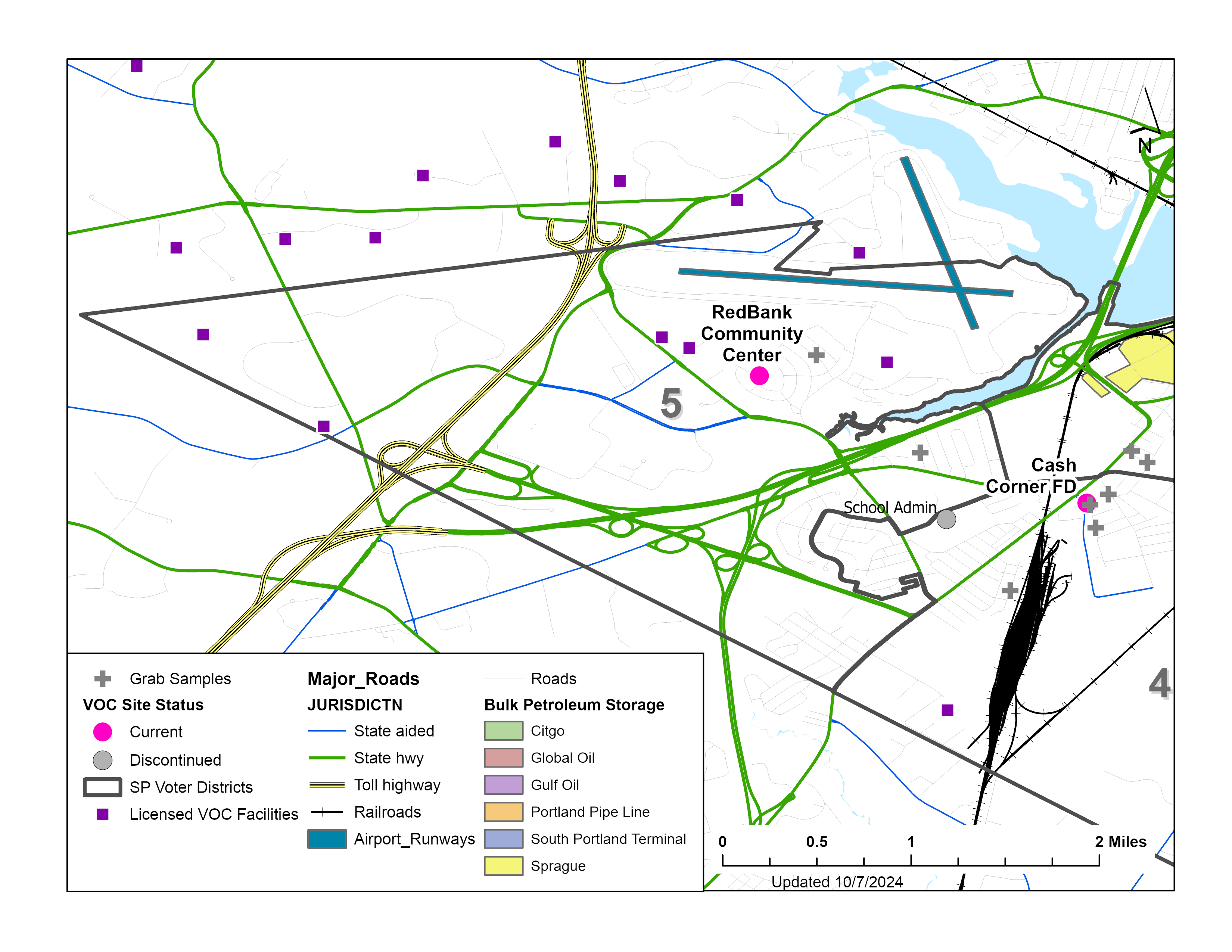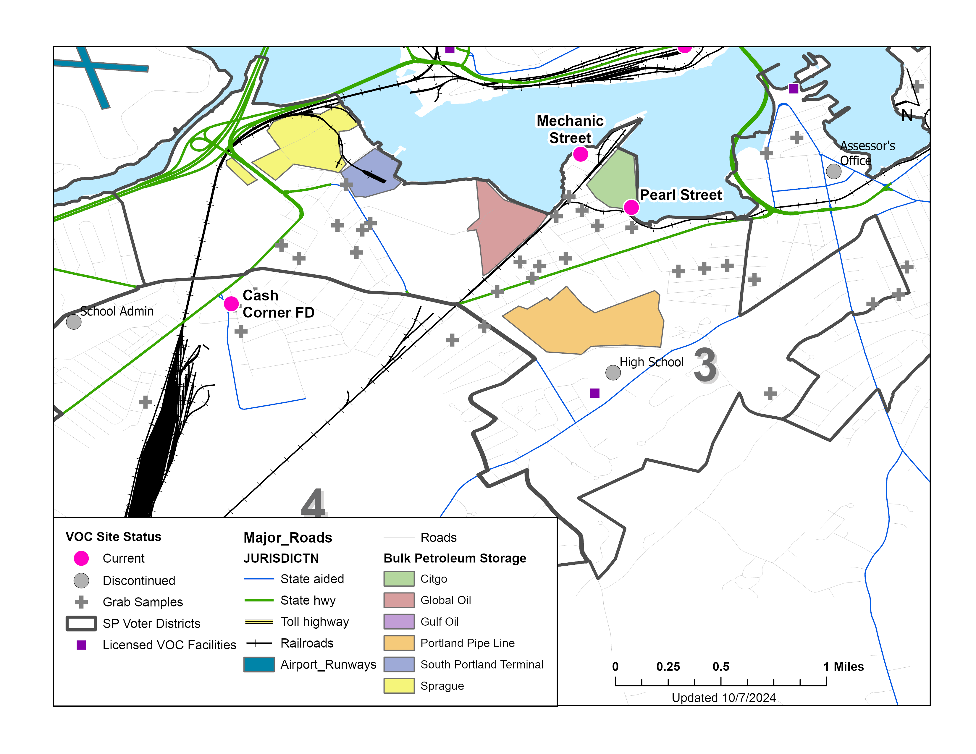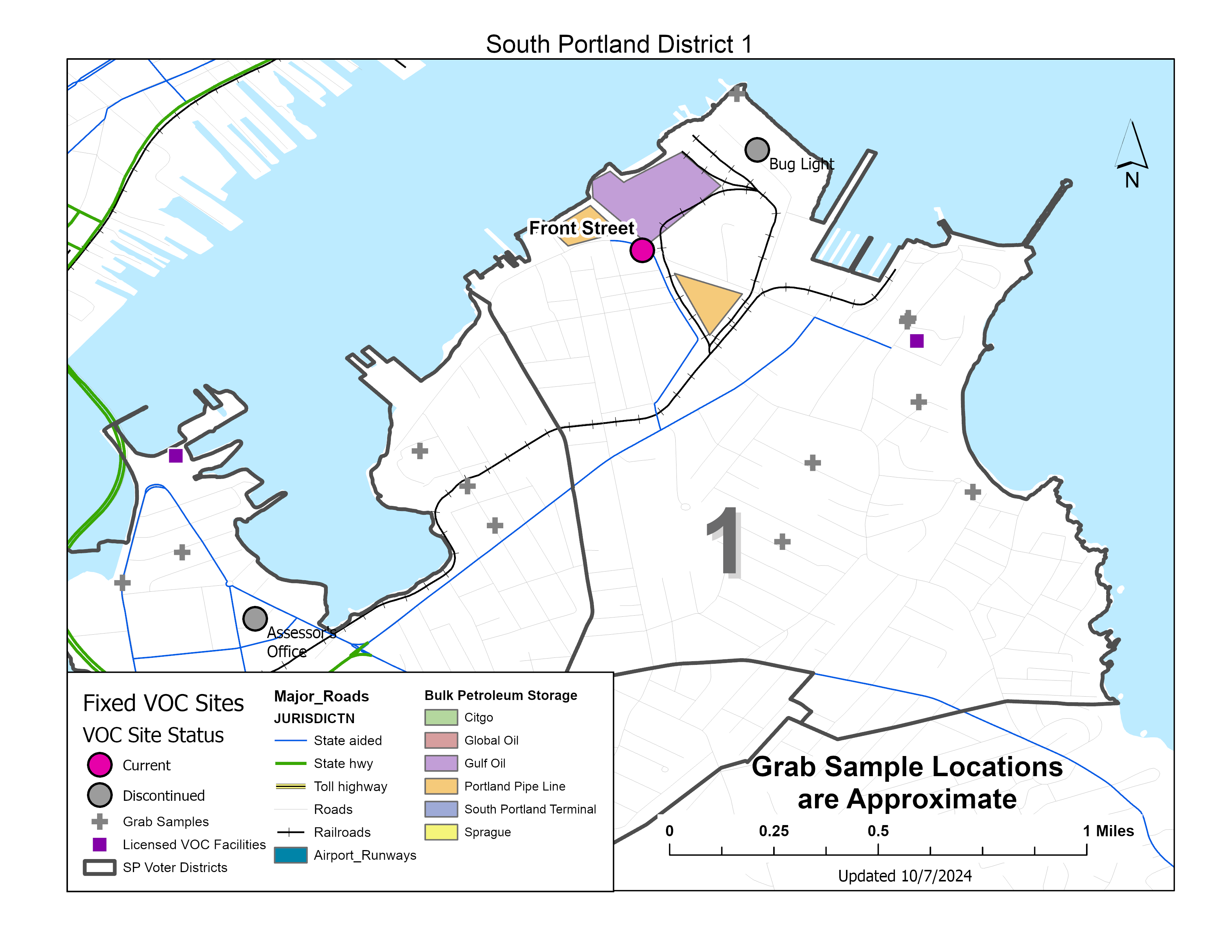 Click on the location map and scroll through "zoomed-in" versions, one for each South Portland district and Portland. The larger scale maps allow us to better depict spatially where a grab sample was taken within each district. While no grab samples were taken in Portland, a zoomed-in map of their 24-hour stationary sampling sites area is provided to help show the proximity of them to the South Portland grab sample locations.